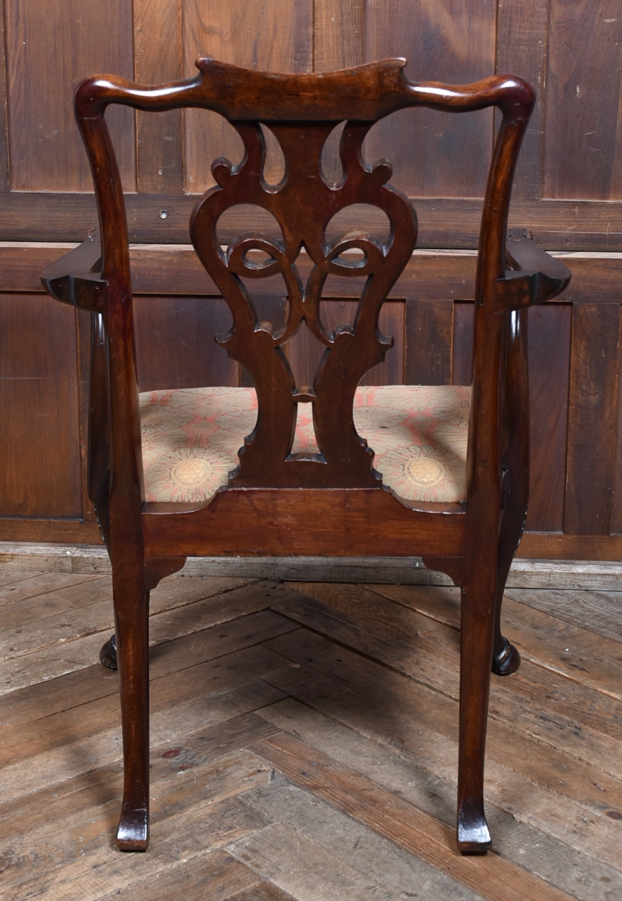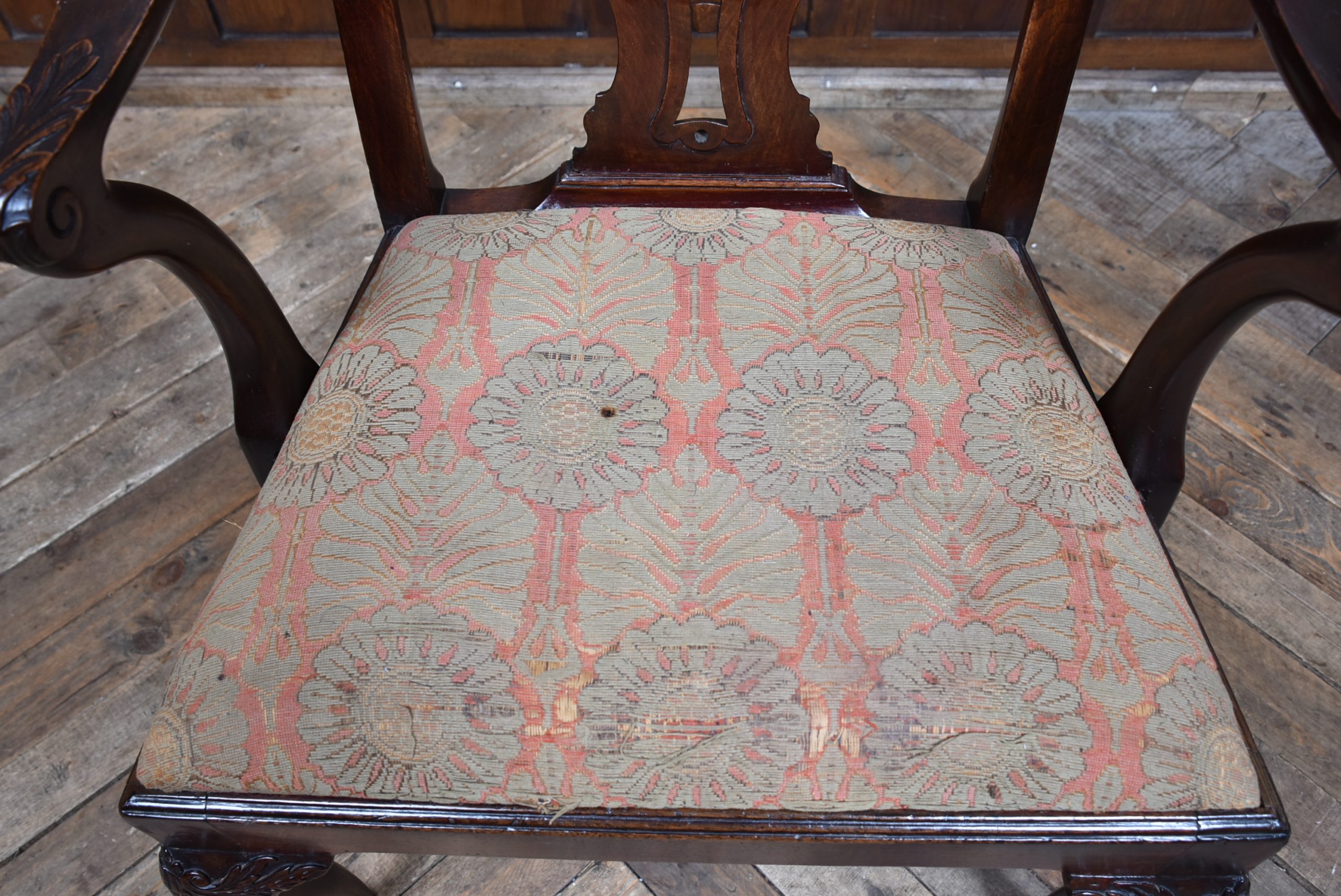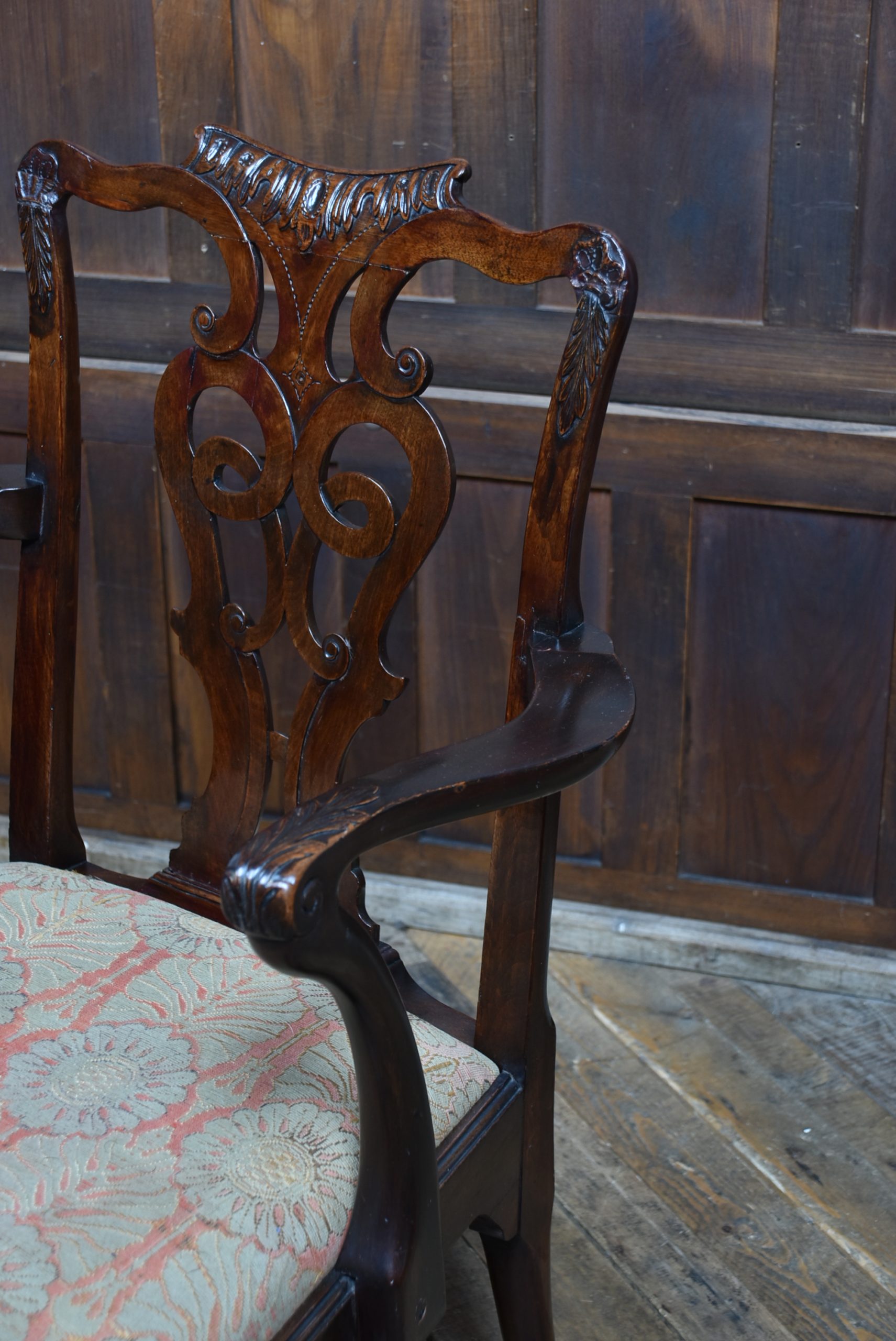 A Georgian mahogany bedroom chair with a finely carved back and elegant cabriole legs, the front pair enriched with carved knees that flow into distinctive hoof feet. The seat height is 47cm, and the drop-in seat pad is straightforward to re-cover to suit individual taste. A graceful and well-proportioned piece that brings period charm and decorative detail to any interior.