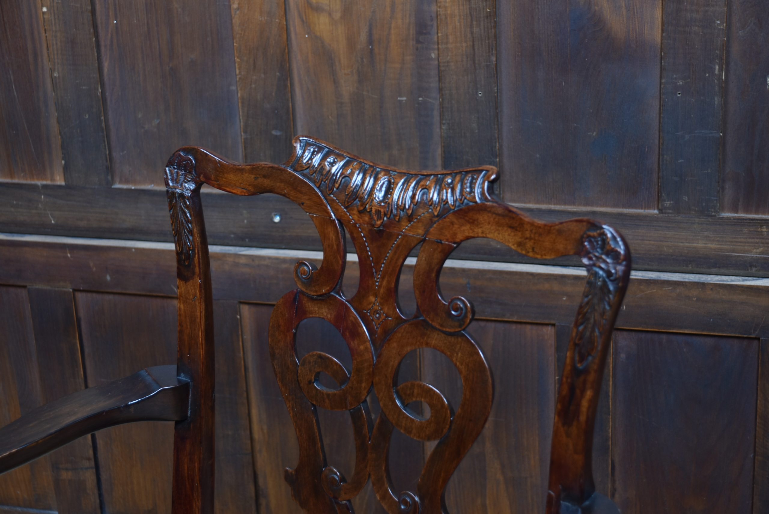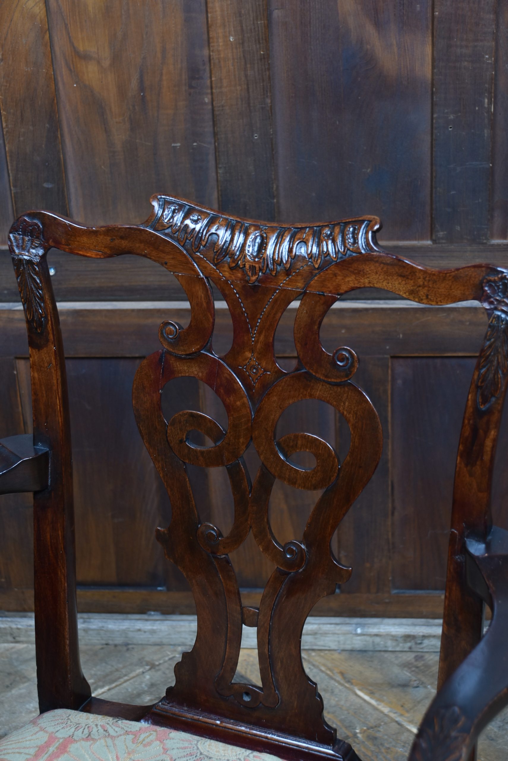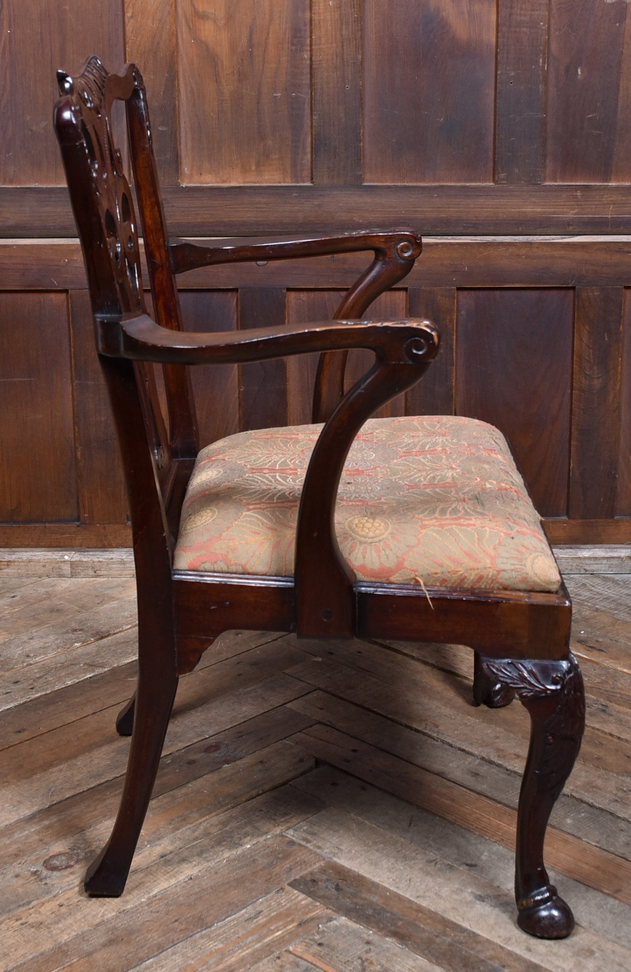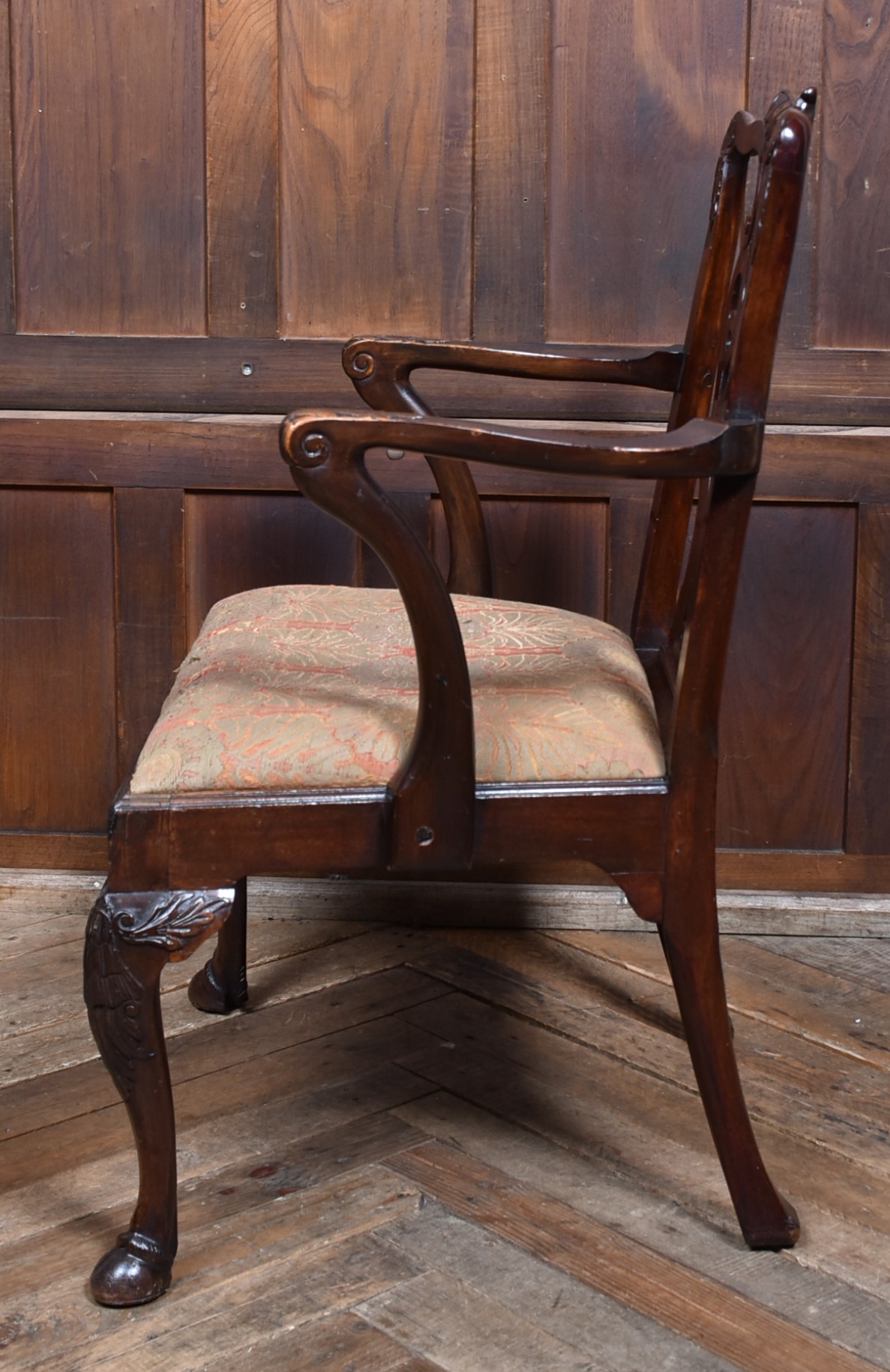 A Georgian mahogany bedroom chair with a finely carved back and elegant cabriole legs, the front pair enriched with carved knees that flow into distinctive hoof feet. The seat height is 47cm, and the drop-in seat pad is straightforward to re-cover to suit individual taste. A graceful and well-proportioned piece that brings period charm and decorative detail to any interior.