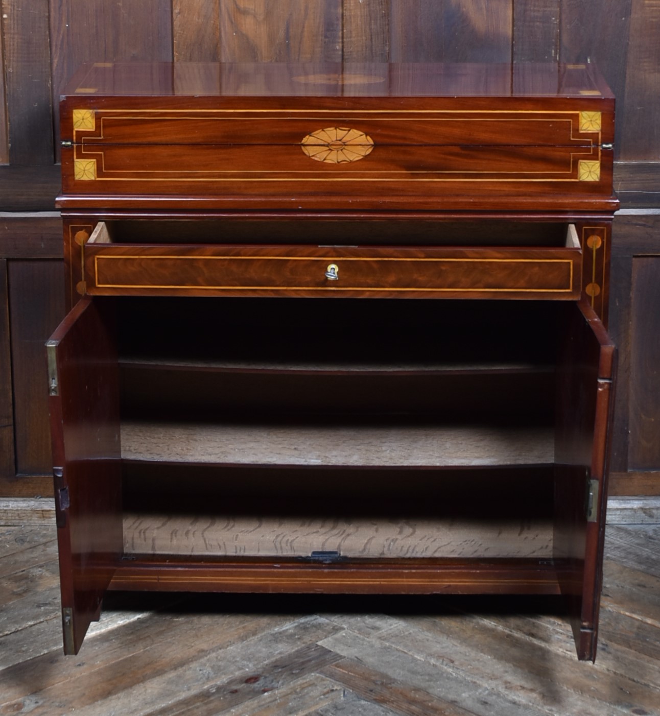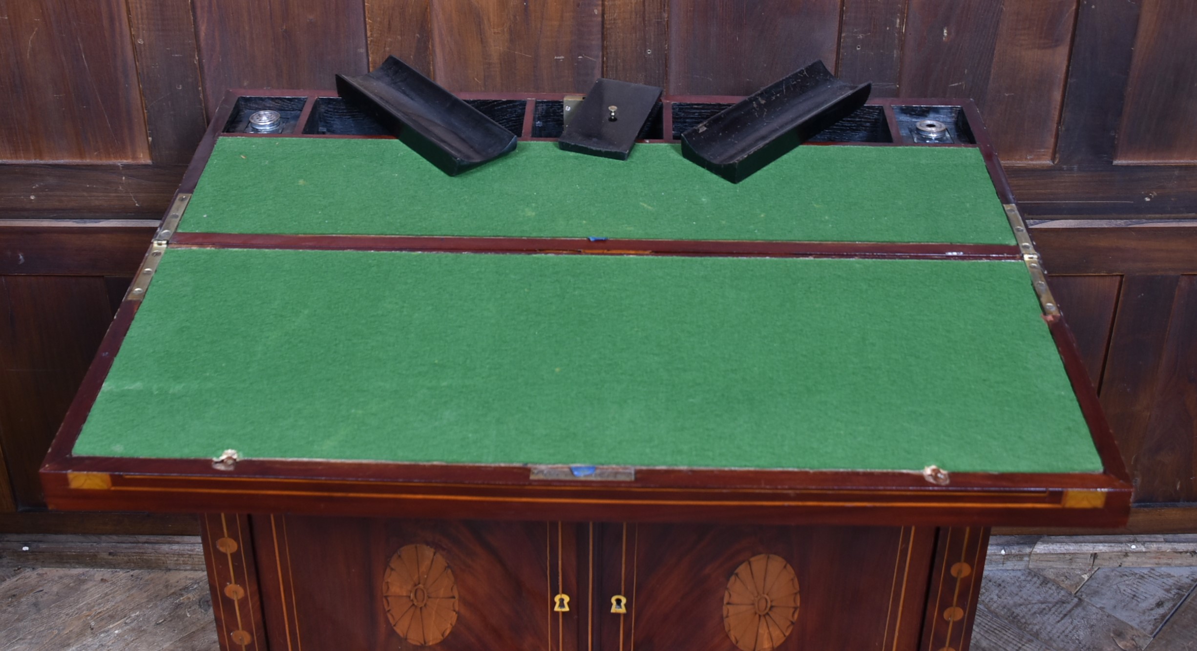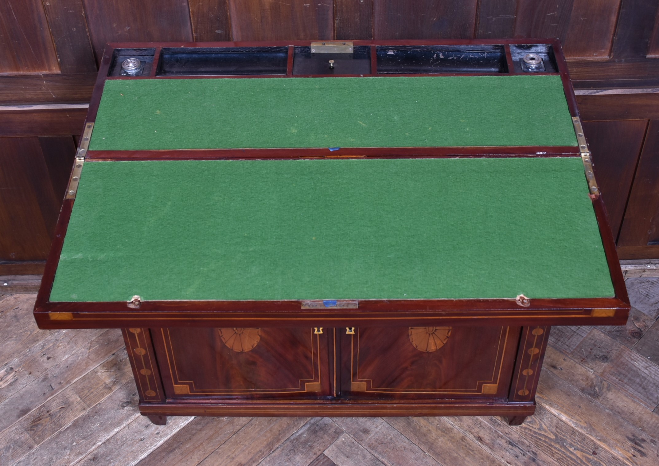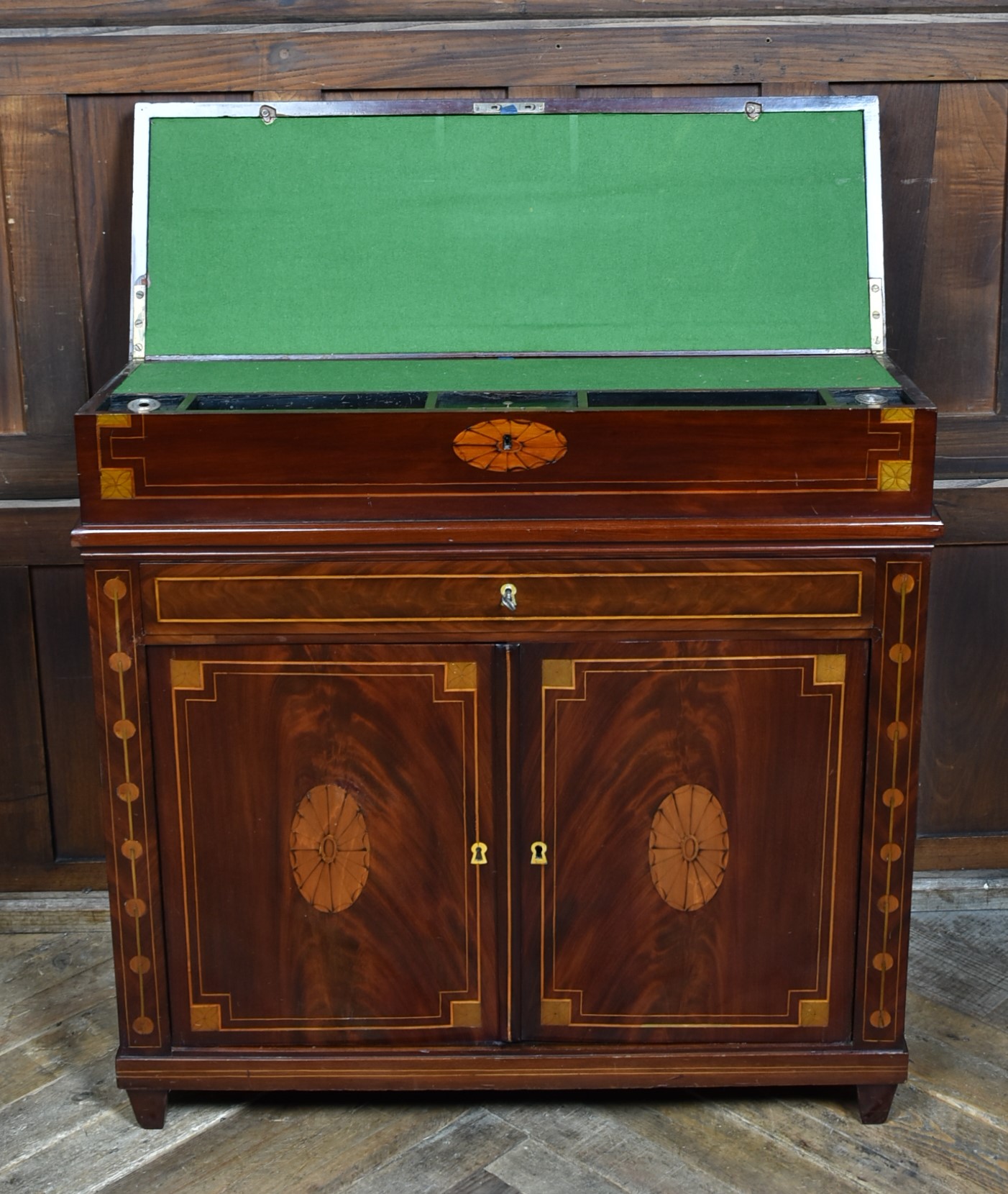 A fine Georgian gentleman’s desk of compact proportions, crafted from richly figured mahogany and adorned with attractive satinwood inlay. It remains in excellent antique condition and comes complete with a working key. The top section is cleverly designed to pivot, allowing the writing slope to be accessed and opened from the rear of the cupboard. Open the top measures 62cm and boasts a green baize writing surface with fitted sections for rulers, pens, ink bottles, candles, and other writing essentials. Beneath the surface is further storage, ideal for stationery or even a slim laptop. Below, a single drawer and a shelved interior behind the double doors provide additional space for office supplies. With the exception of the back, the piece is beautifully decorated with shell‑style inlays framed by delicate stringing, showcasing the refined craftsmanship of the period. A superb and highly functional item for any home office, combining elegance, practicality, and Georgian charm.