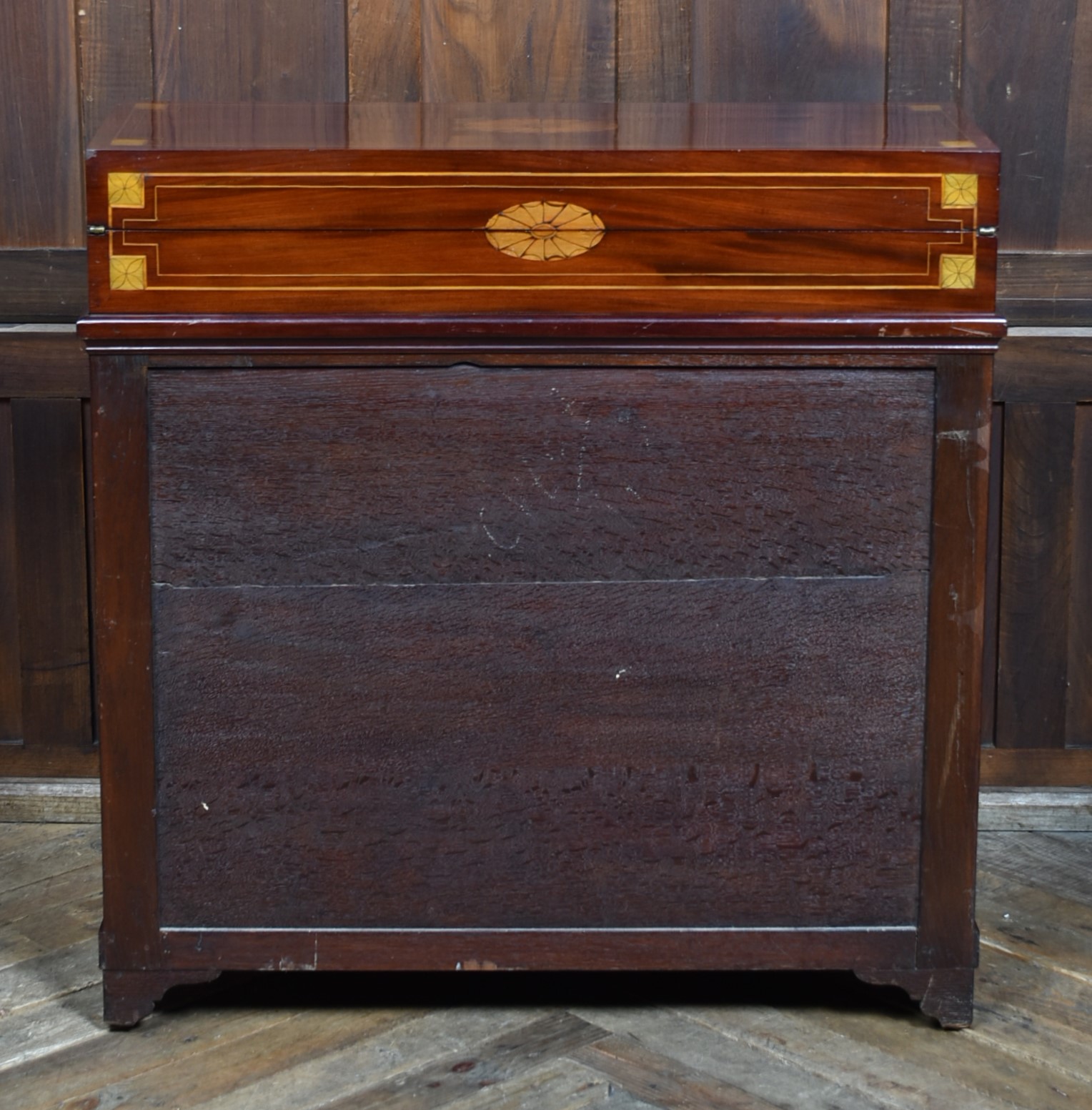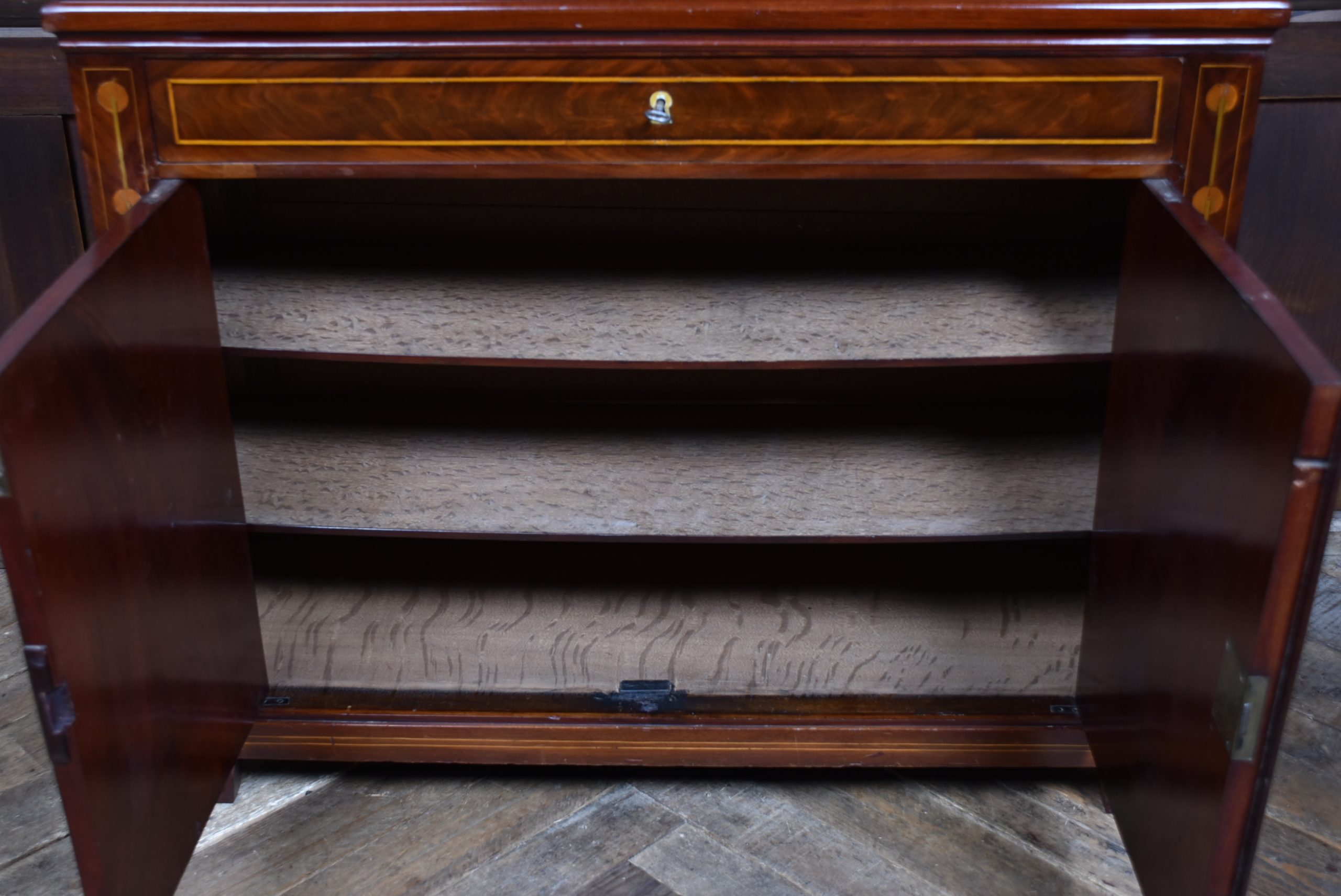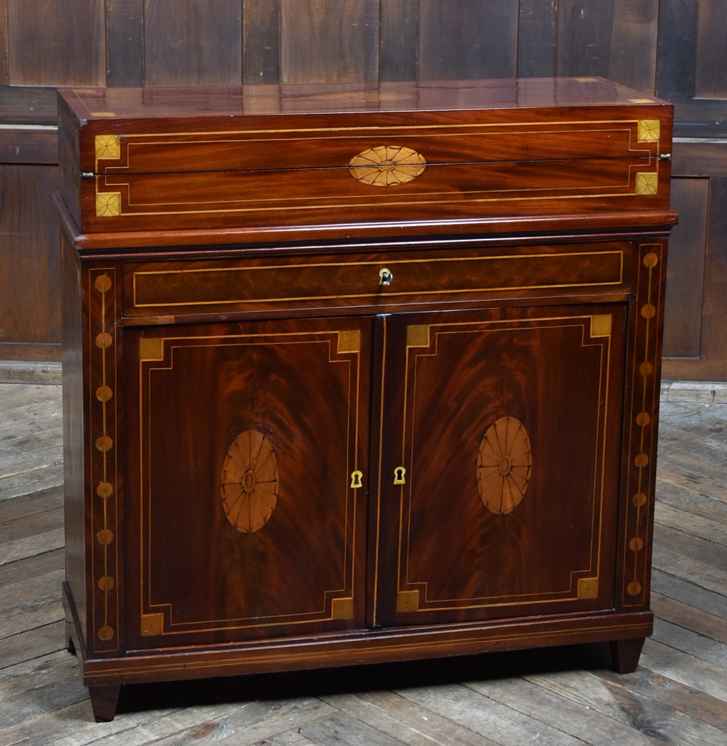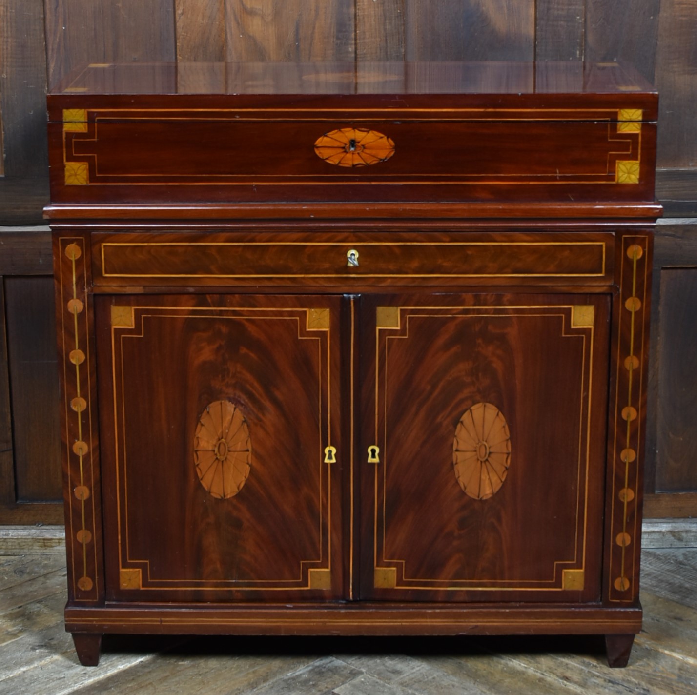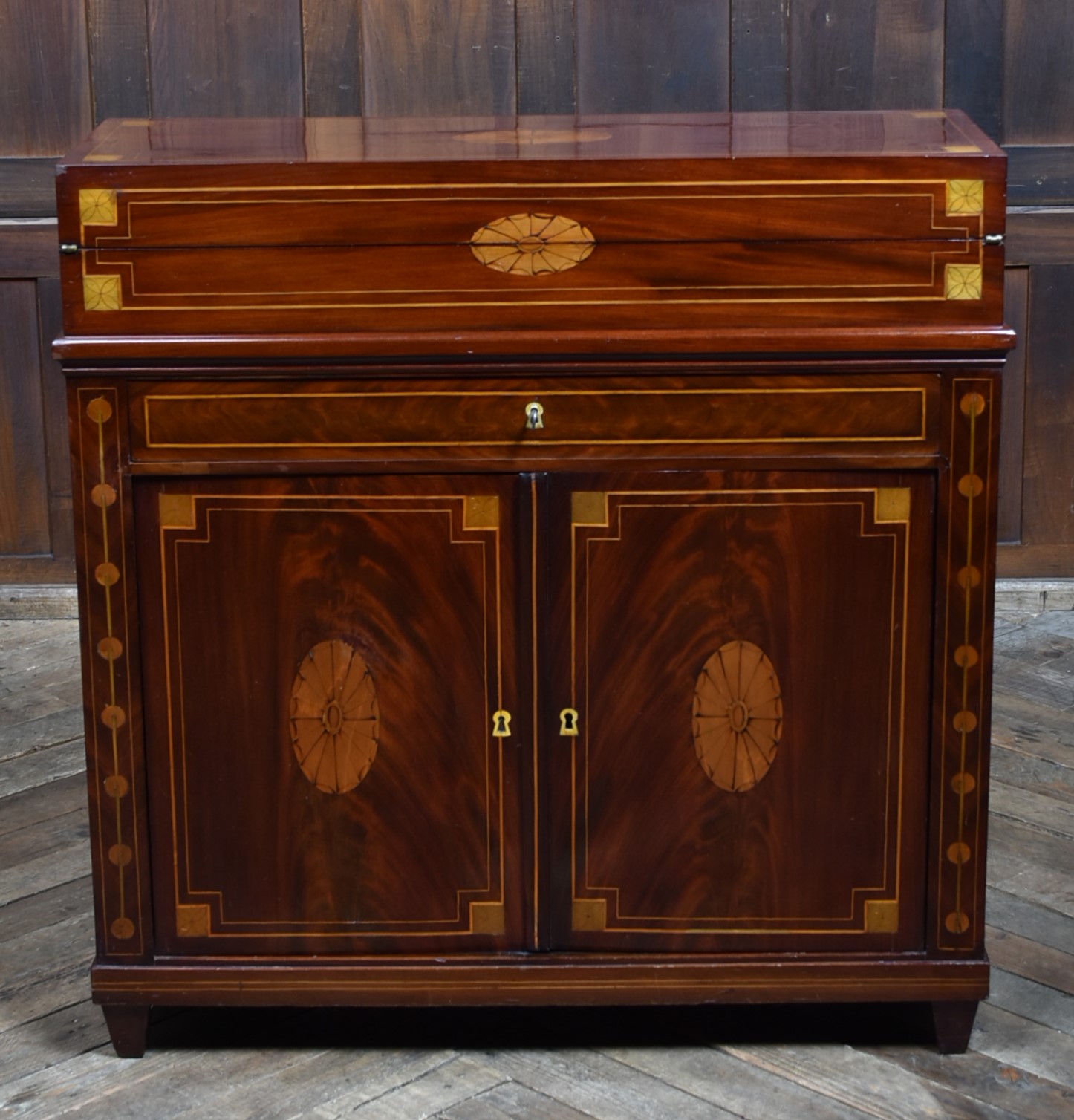 A fine Georgian gentleman’s desk of compact proportions, crafted from richly figured mahogany and adorned with attractive satinwood inlay. It remains in excellent antique condition and comes complete with a working key. The top section is cleverly designed to pivot, allowing the writing slope to be accessed and opened from the rear of the cupboard. Open the top measures 62cm and boasts a green baize writing surface with fitted sections for rulers, pens, ink bottles, candles, and other writing essentials. Beneath the surface is further storage, ideal for stationery or even a slim laptop. Below, a single drawer and a shelved interior behind the double doors provide additional space for office supplies. With the exception of the back, the piece is beautifully decorated with shell‑style inlays framed by delicate stringing, showcasing the refined craftsmanship of the period. A superb and highly functional item for any home office, combining elegance, practicality, and Georgian charm.