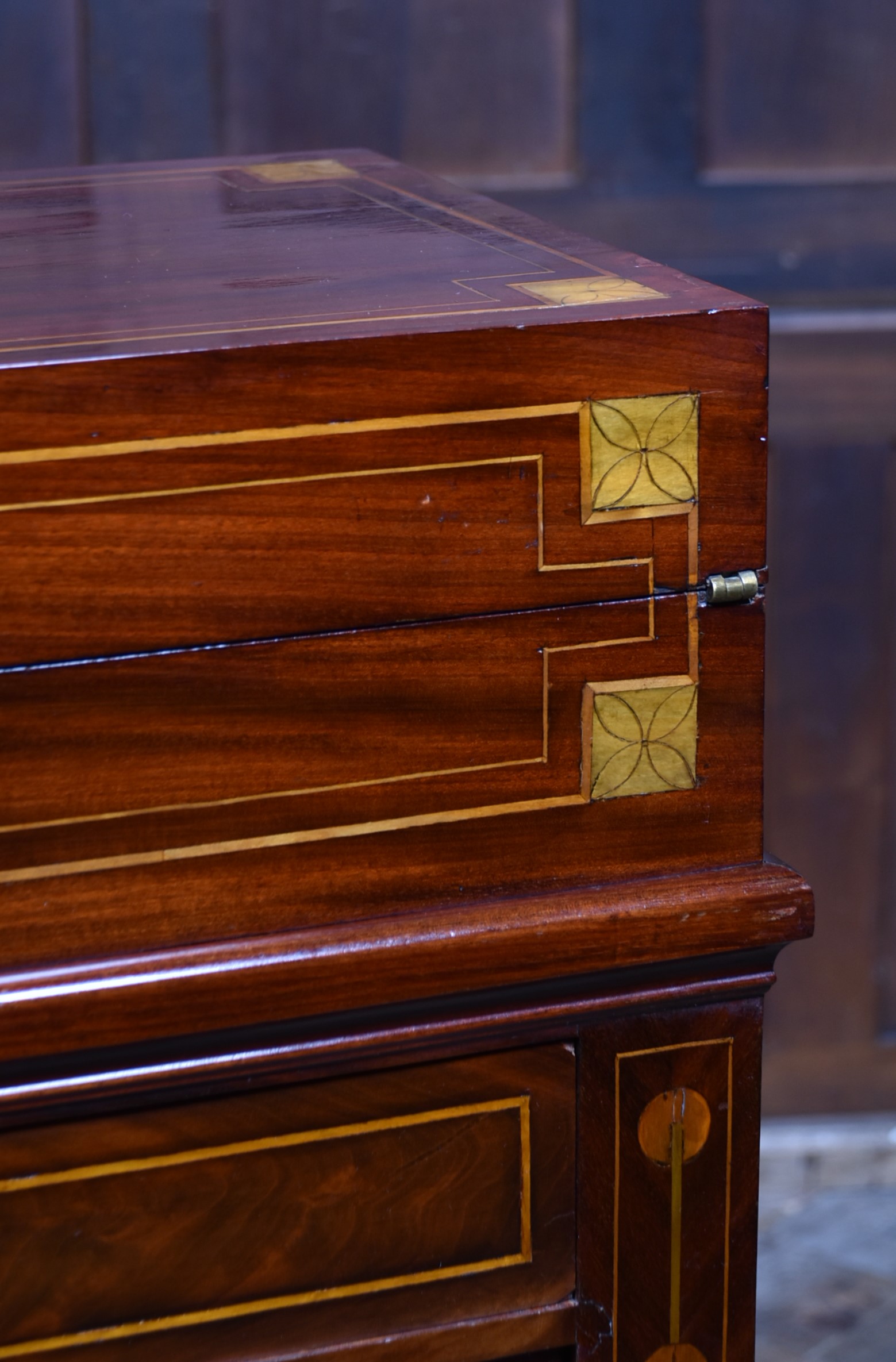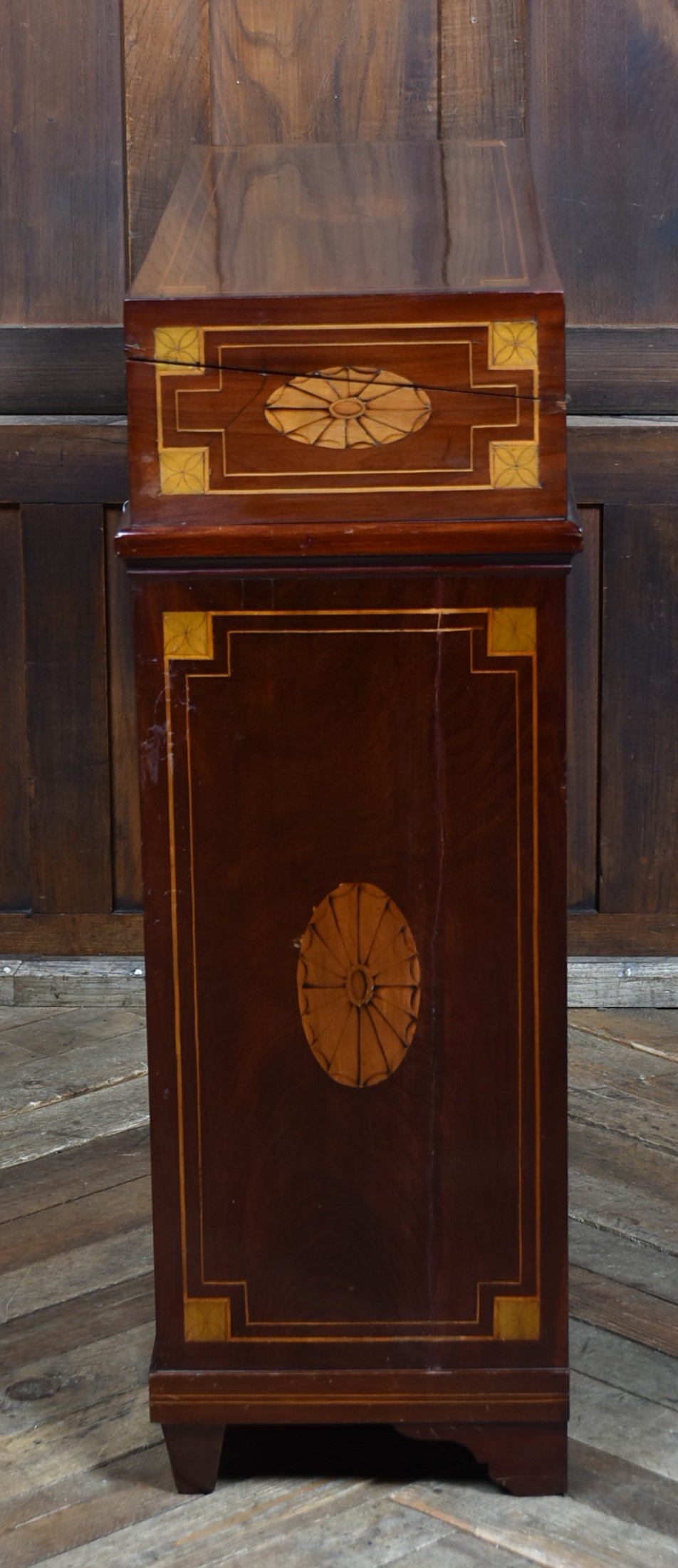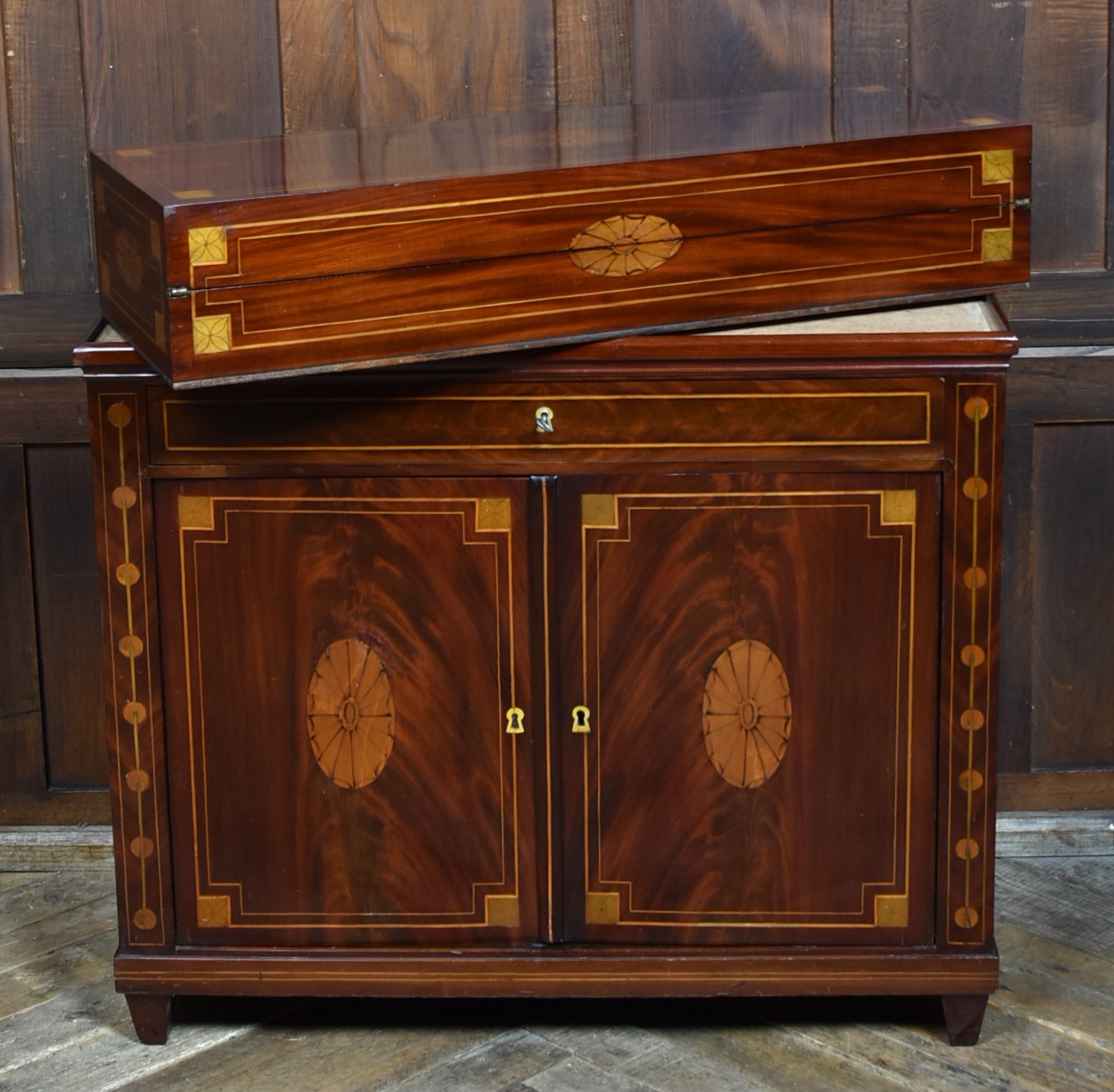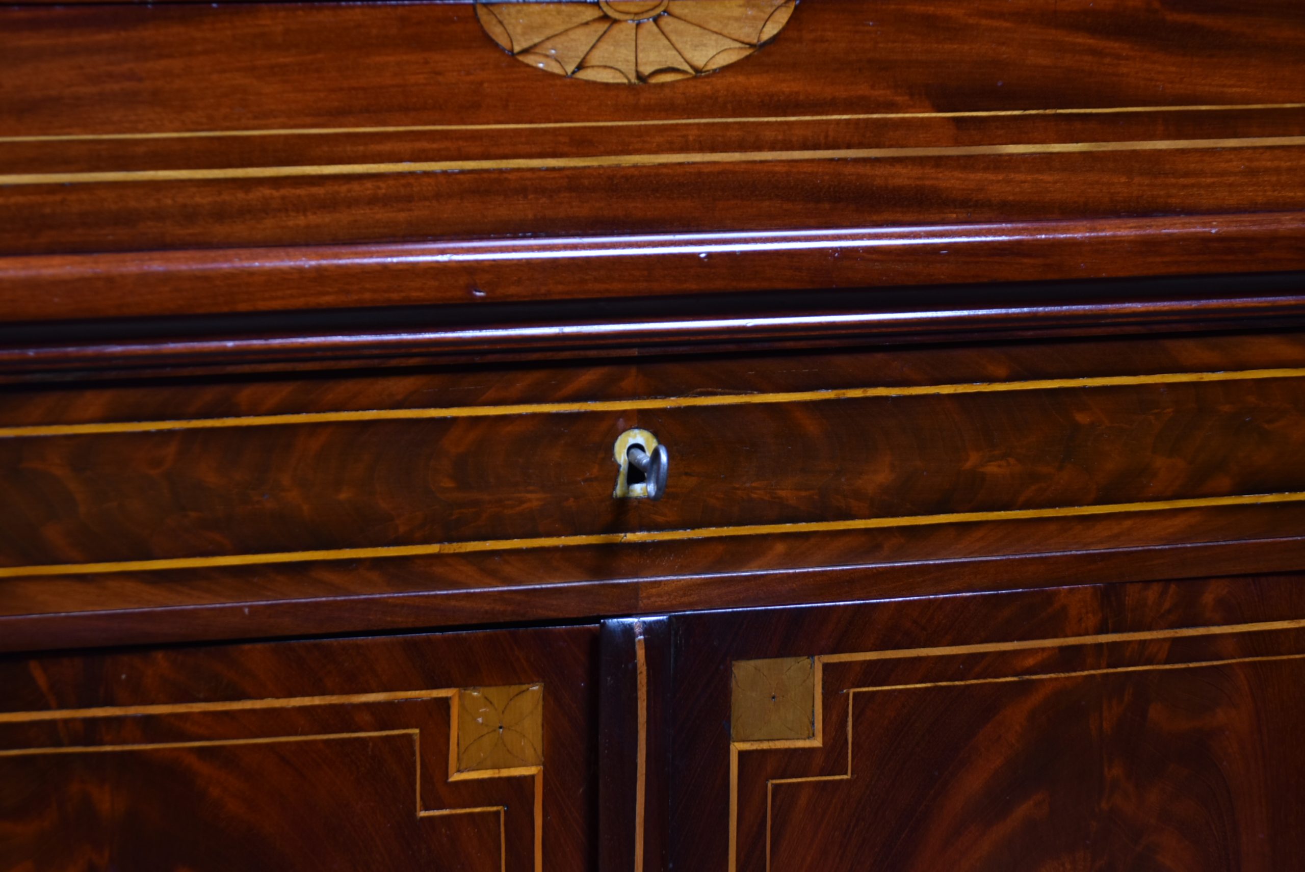 A fine Georgian gentleman’s desk of compact proportions, crafted from richly figured mahogany and adorned with attractive satinwood inlay. It remains in excellent antique condition and comes complete with a working key. The top section is cleverly designed to pivot, allowing the writing slope to be accessed and opened from the rear of the cupboard. Open the top measures 62cm and boasts a green baize writing surface with fitted sections for rulers, pens, ink bottles, candles, and other writing essentials. Beneath the surface is further storage, ideal for stationery or even a slim laptop. Below, a single drawer and a shelved interior behind the double doors provide additional space for office supplies. With the exception of the back, the piece is beautifully decorated with shell‑style inlays framed by delicate stringing, showcasing the refined craftsmanship of the period. A superb and highly functional item for any home office, combining elegance, practicality, and Georgian charm.
