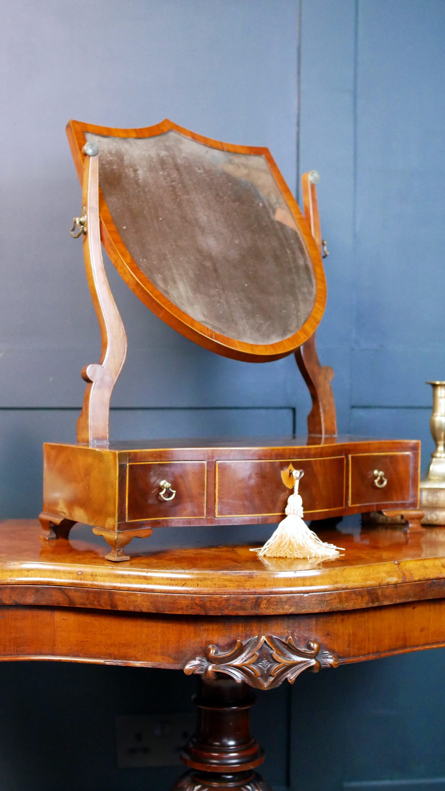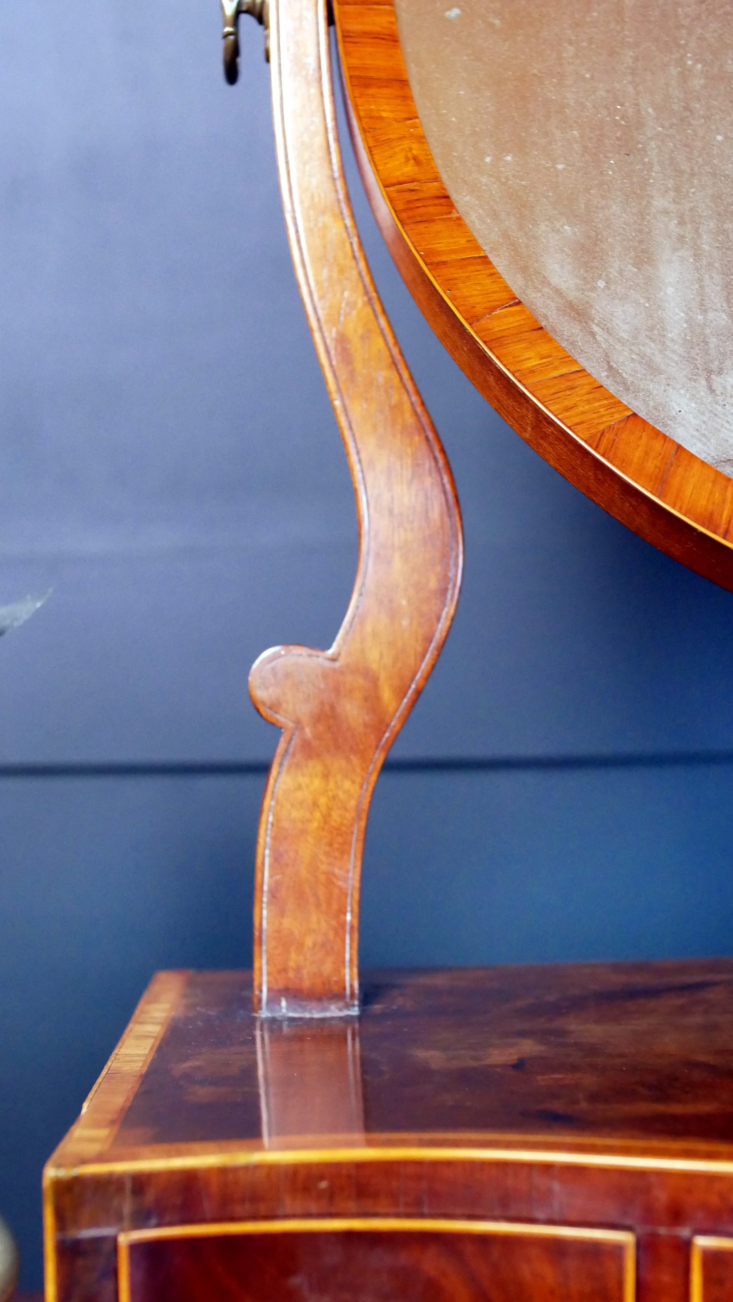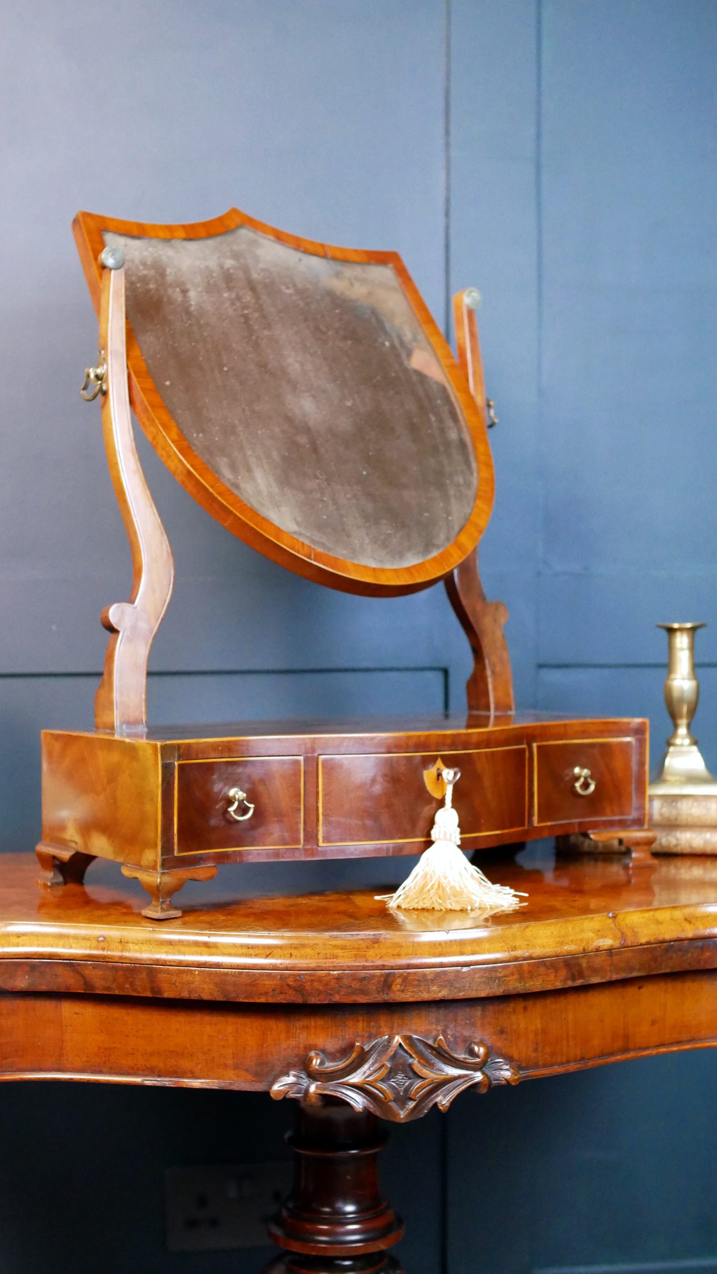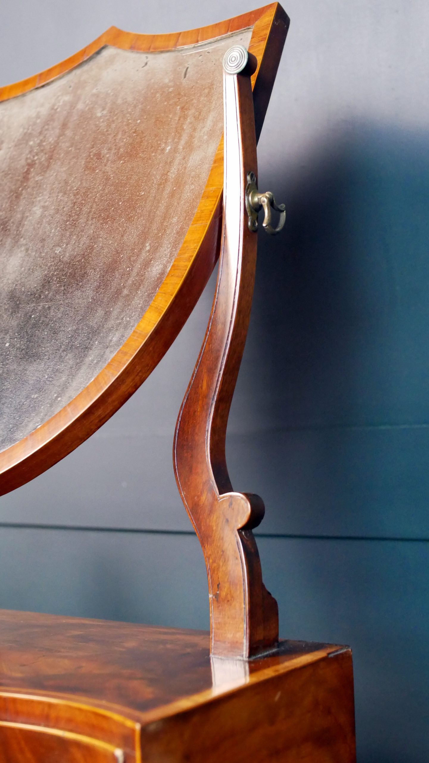 The shaped uprights, capped with classic brass rosette mounts, support a fully adjustable plate above a serpentine-fronted base. The base is beautifully crossbanded and inlaid with satinwood stringing, providing a subtle yet sophisticated contrast to the rich warmth of the mahogany. Three drawers, each fitted with elegant brass ring handles, offer practical storage while maintaining the mirror’s refined proportions. The whole stands on delicate bracket feet, completing a silhouette of poise and balance.
