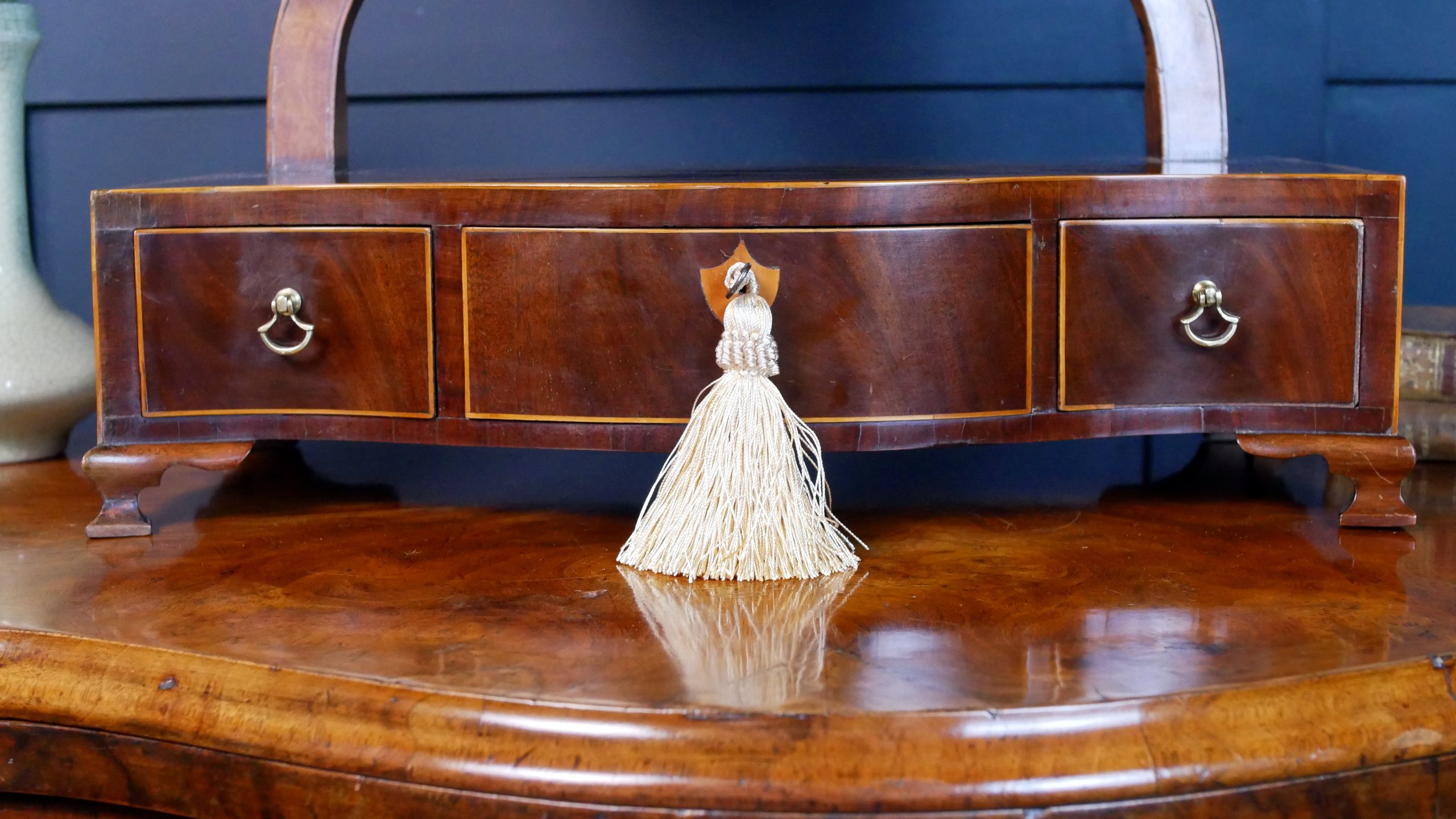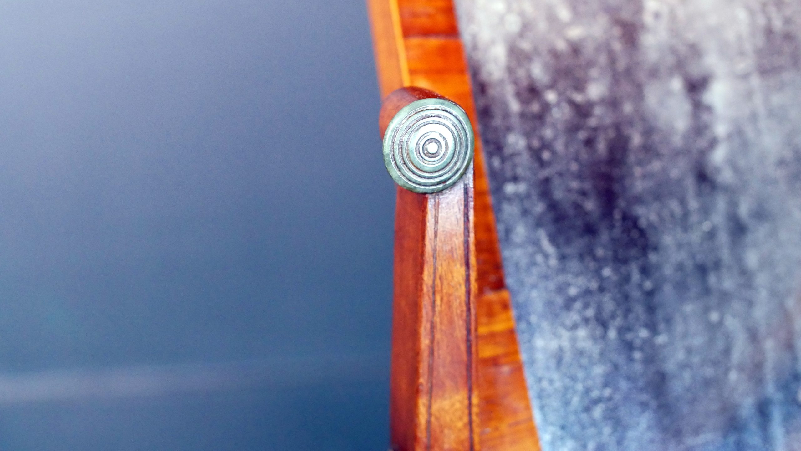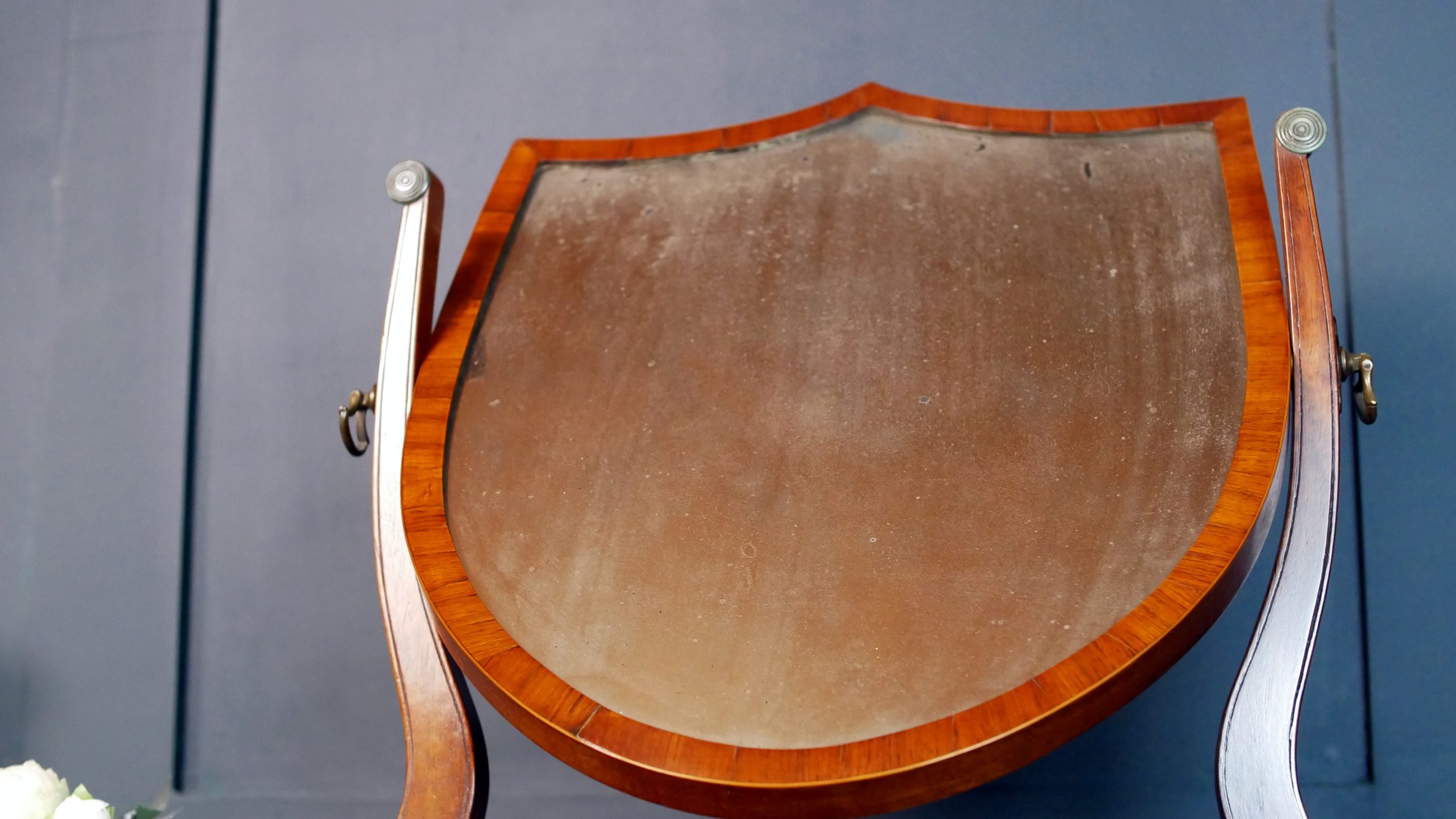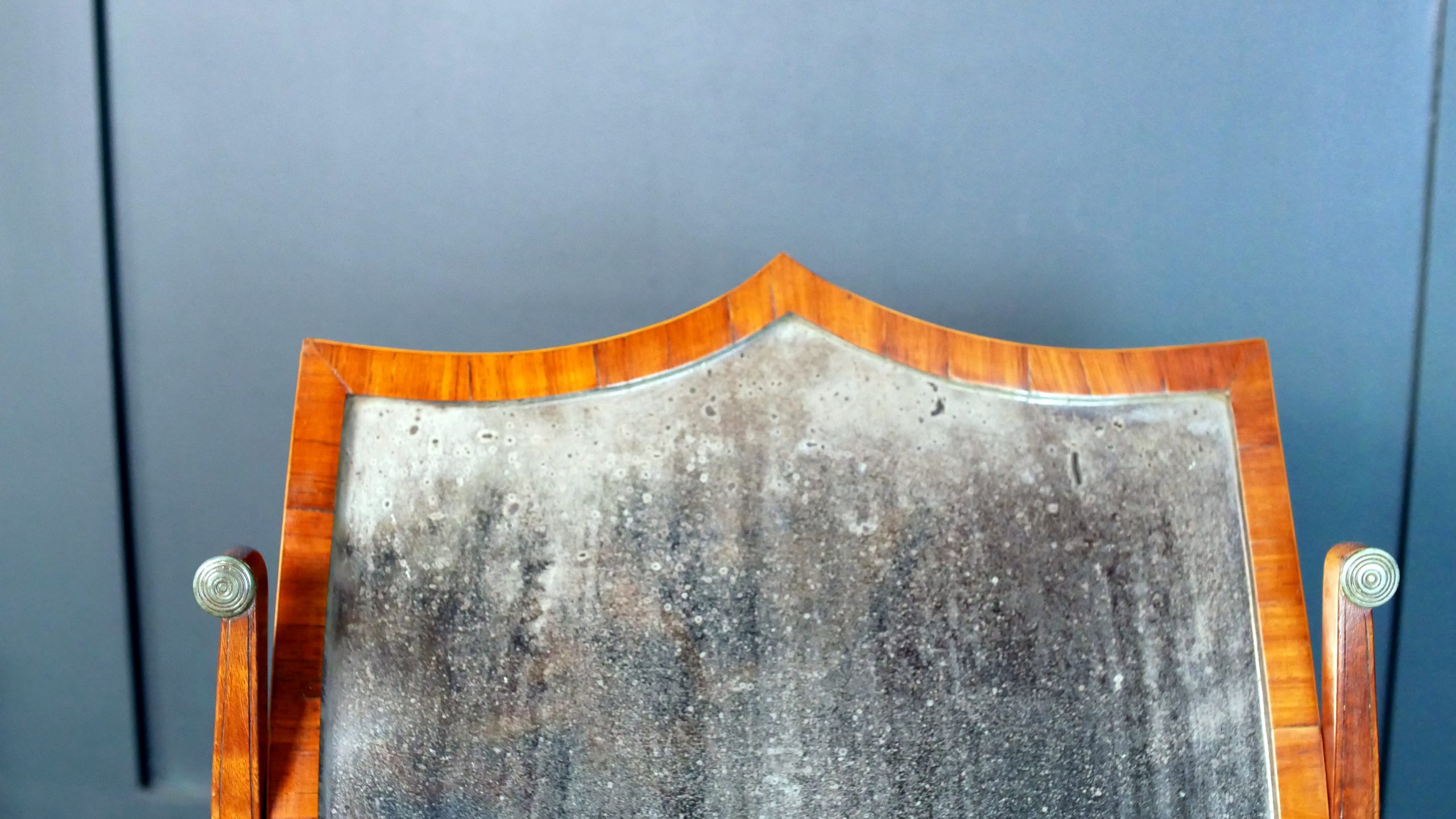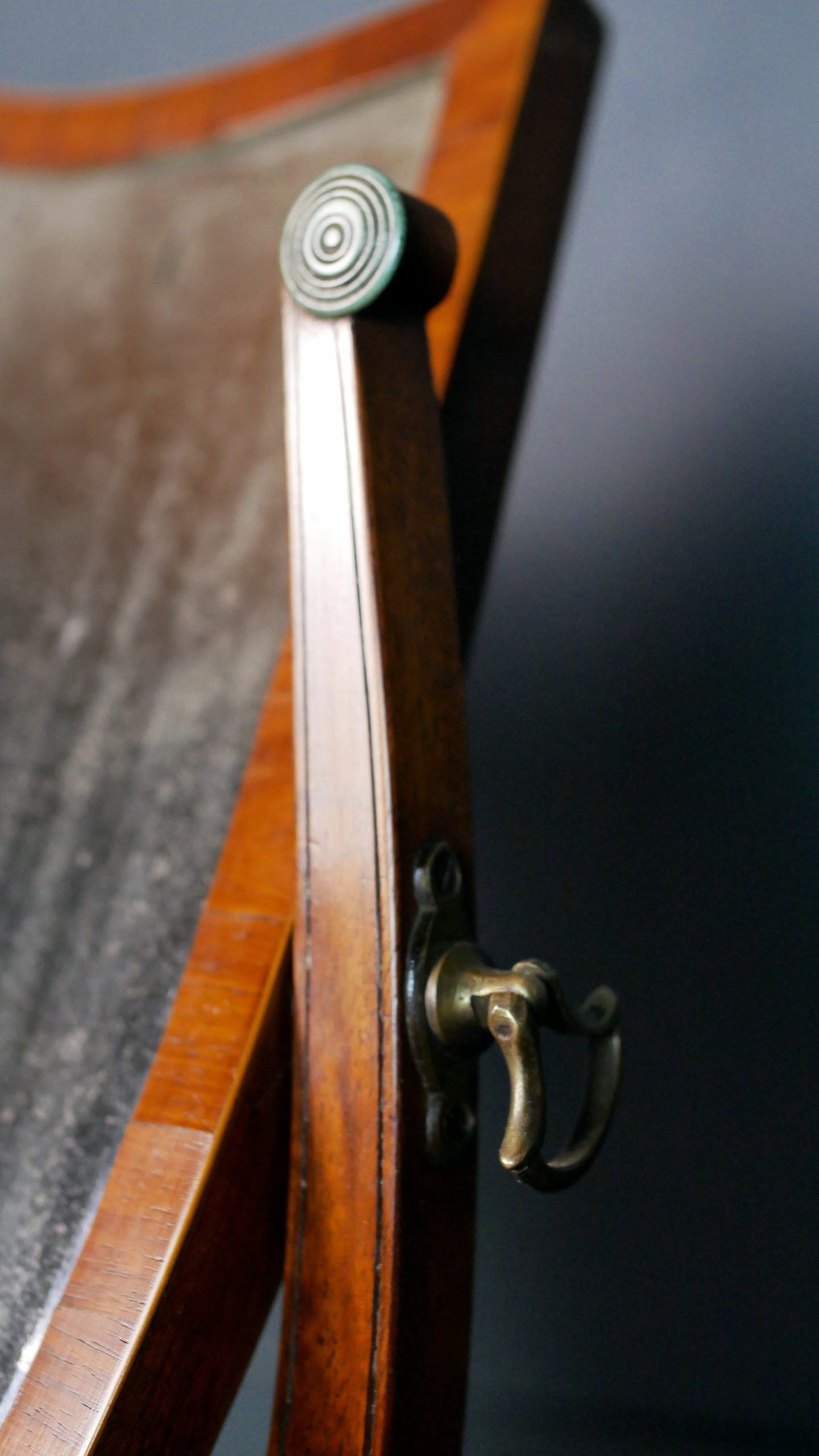 The shaped uprights, capped with classic brass rosette mounts, support a fully adjustable plate above a serpentine-fronted base. The base is beautifully crossbanded and inlaid with satinwood stringing, providing a subtle yet sophisticated contrast to the rich warmth of the mahogany. Three drawers, each fitted with elegant brass ring handles, offer practical storage while maintaining the mirror’s refined proportions. The whole stands on delicate bracket feet, completing a silhouette of poise and balance.
