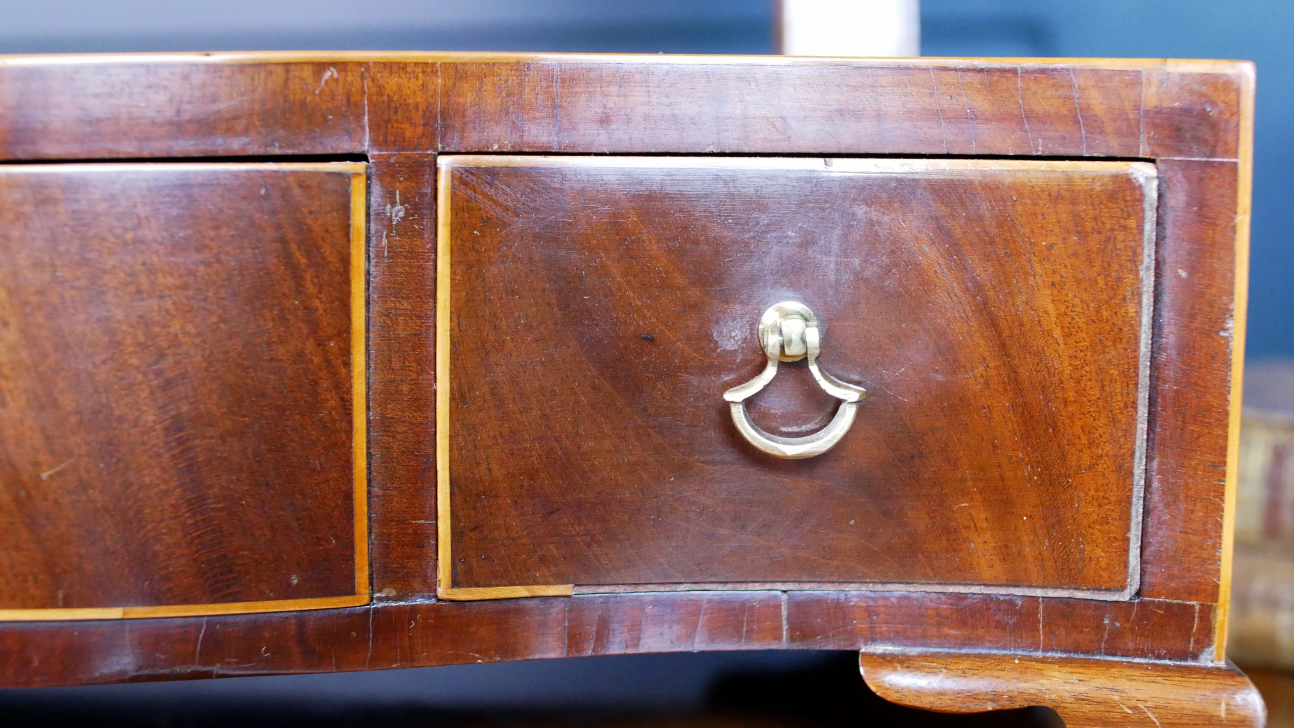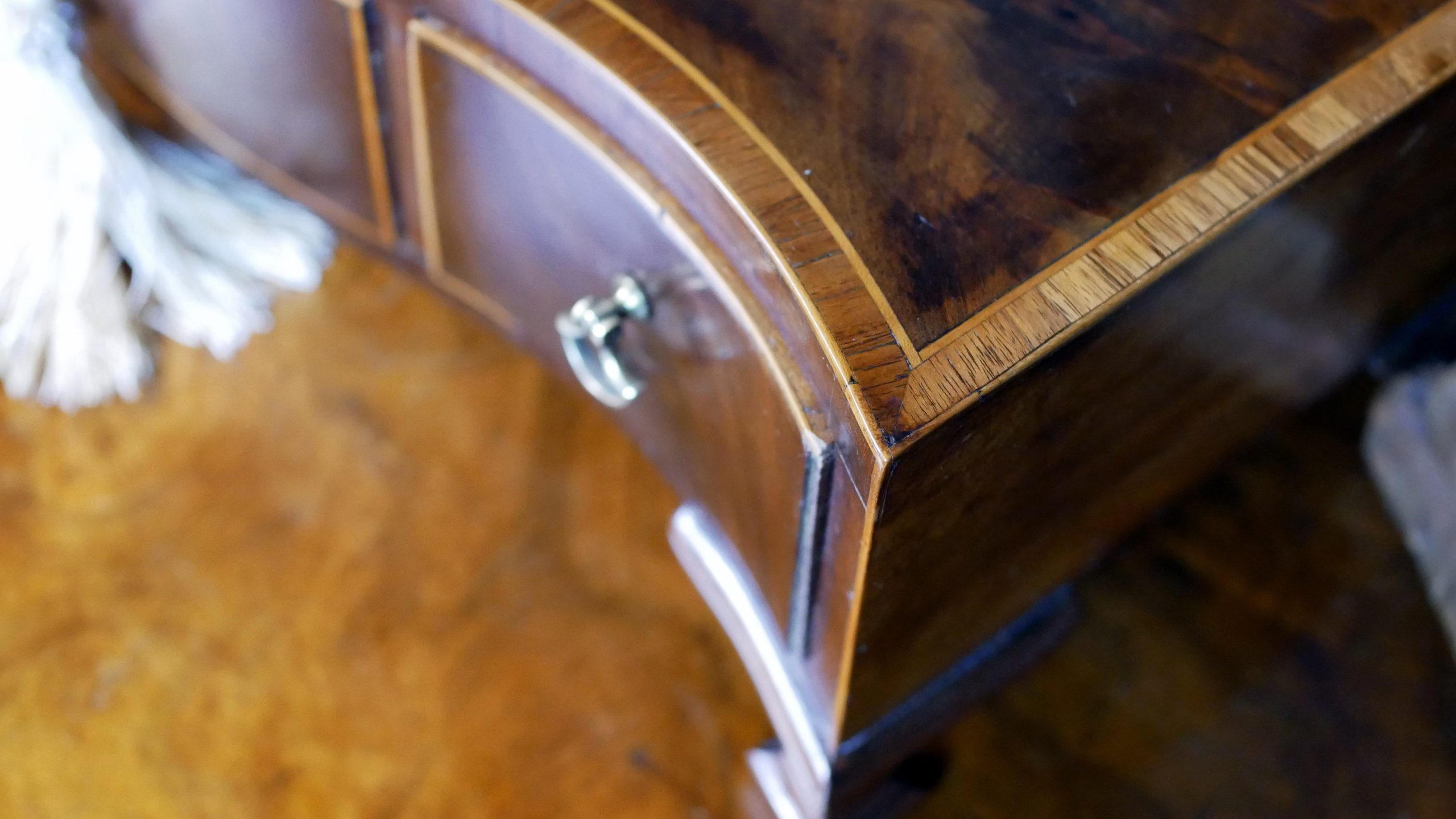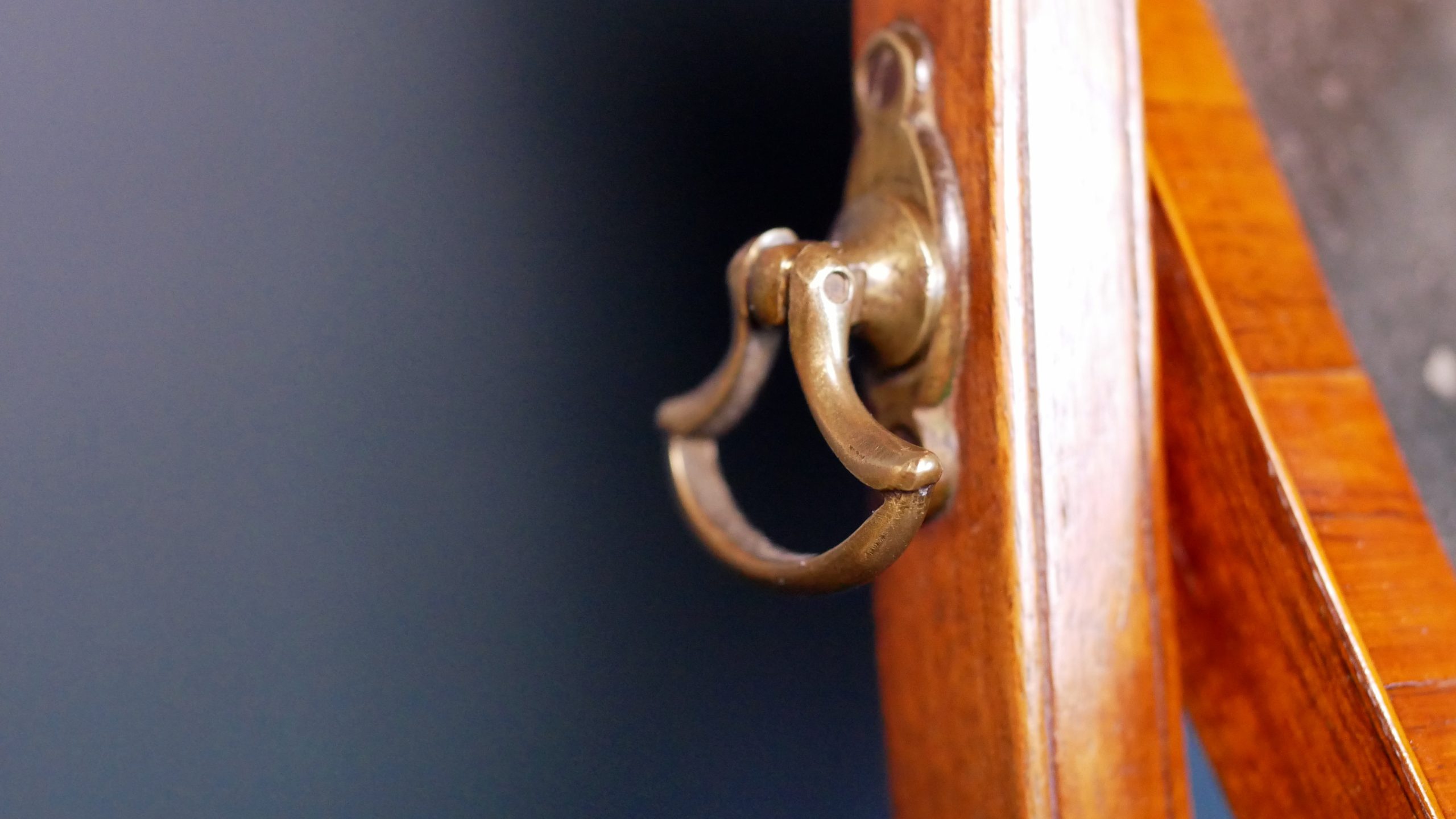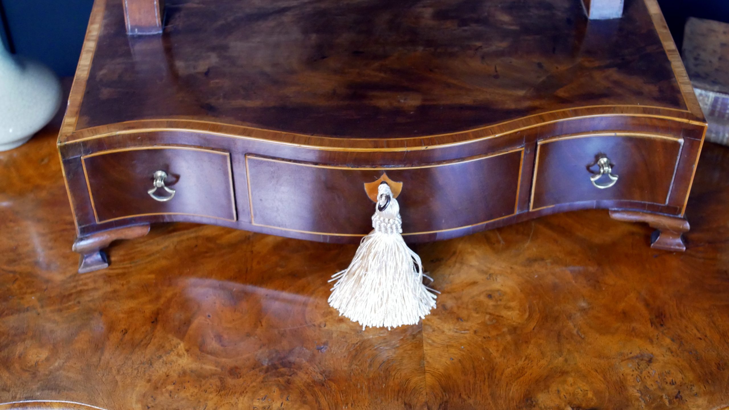 The shaped uprights, capped with classic brass rosette mounts, support a fully adjustable plate above a serpentine-fronted base. The base is beautifully crossbanded and inlaid with satinwood stringing, providing a subtle yet sophisticated contrast to the rich warmth of the mahogany. Three drawers, each fitted with elegant brass ring handles, offer practical storage while maintaining the mirror’s refined proportions. The whole stands on delicate bracket feet, completing a silhouette of poise and balance.