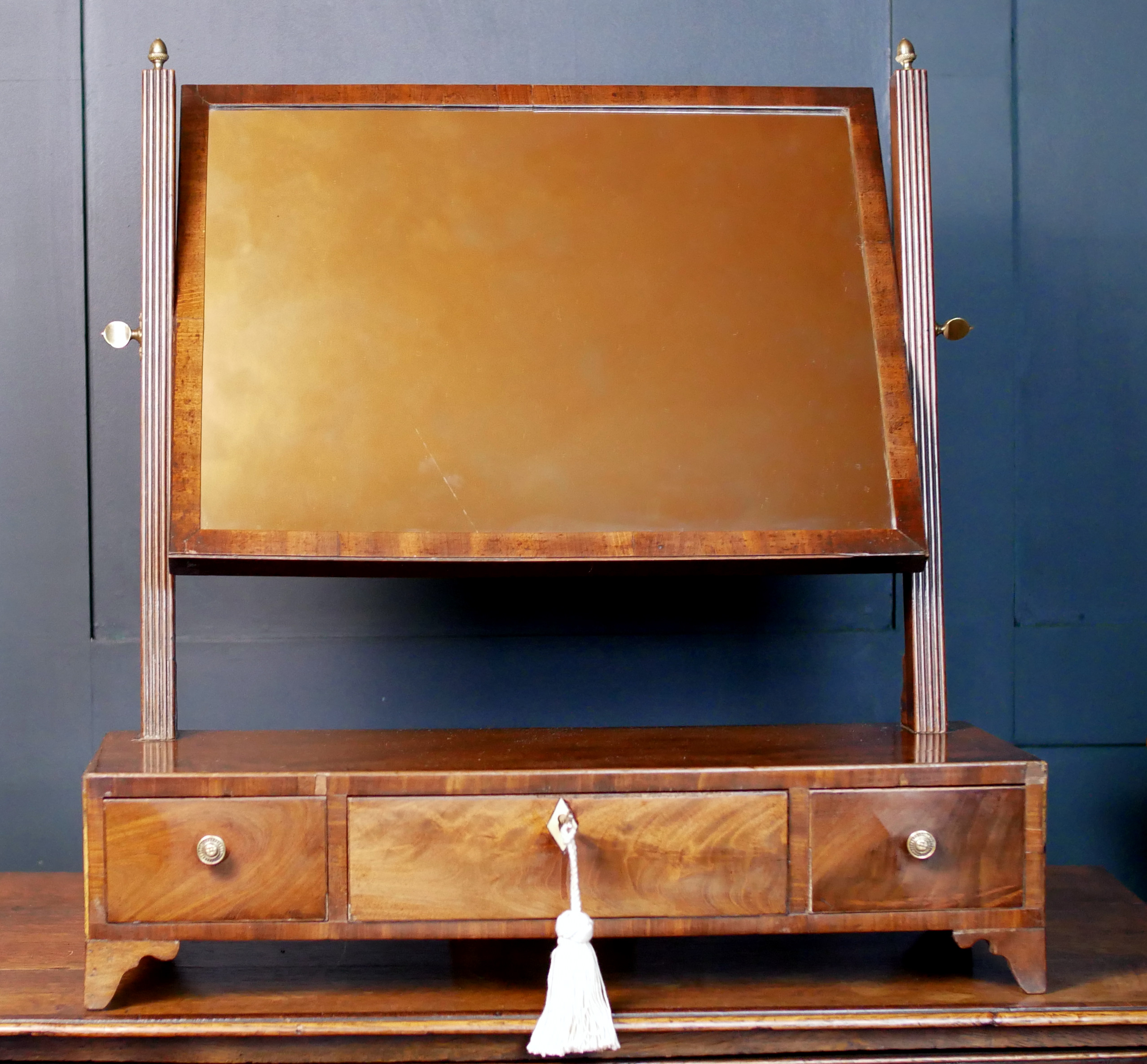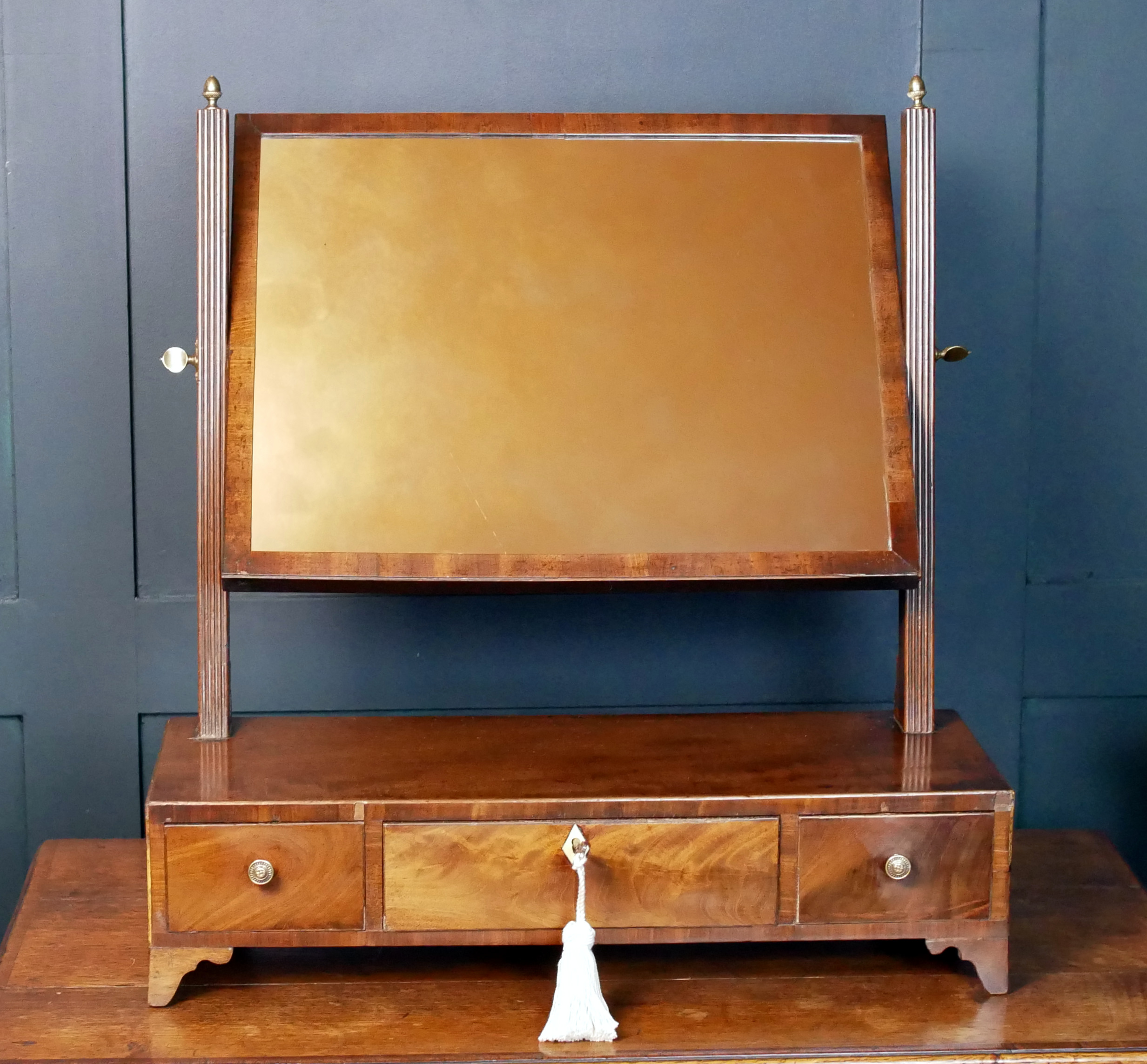 Infuse your dressing suite with the refined architectural grace of the British Regency period. This mahogany tabletop mirror is a masterclass in early 19th-century symmetry and restrained luxury, perfectly preserved to bring historical character to a modern interior.