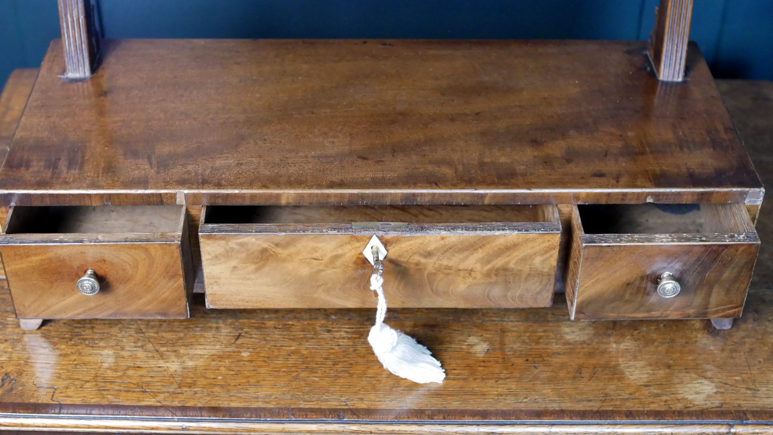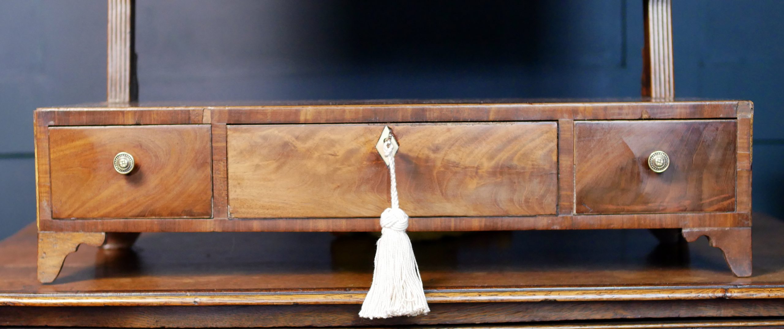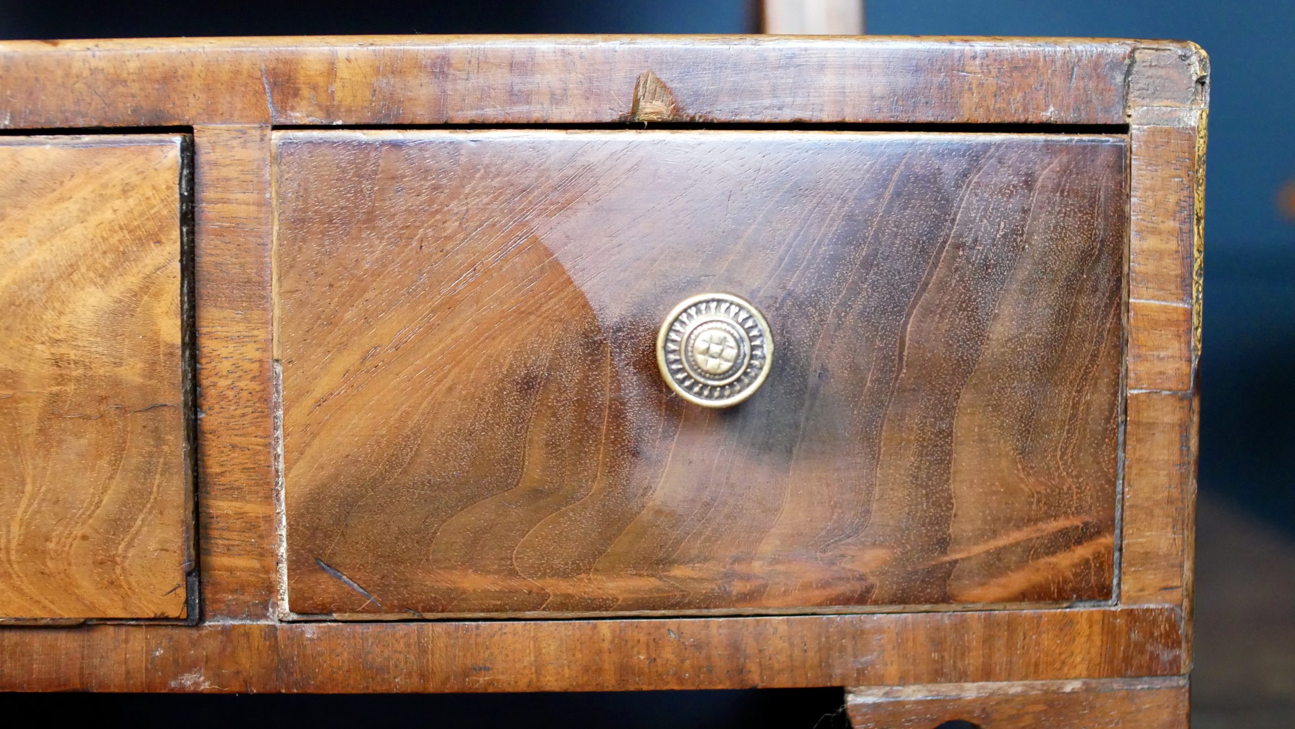 Fine Inlays: Note the delicate ivory or bone escutcheon on the central drawer, adding a sharp, decorative contrast to the rich wood.