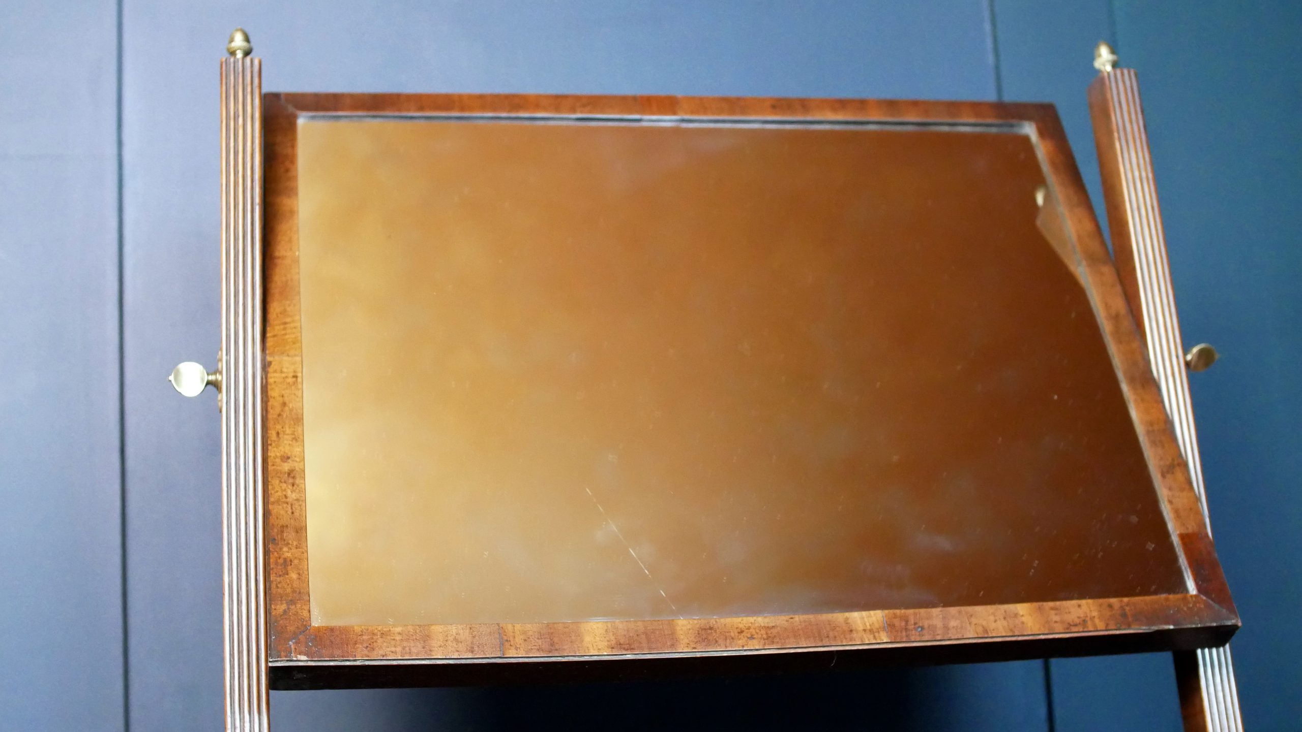 Architectural Fluting: The mirror is flanked by striking reeded or fluted pilasters, capped with elegant brass finials—a hallmark of the Regency style’s obsession with Neoclassical detail.