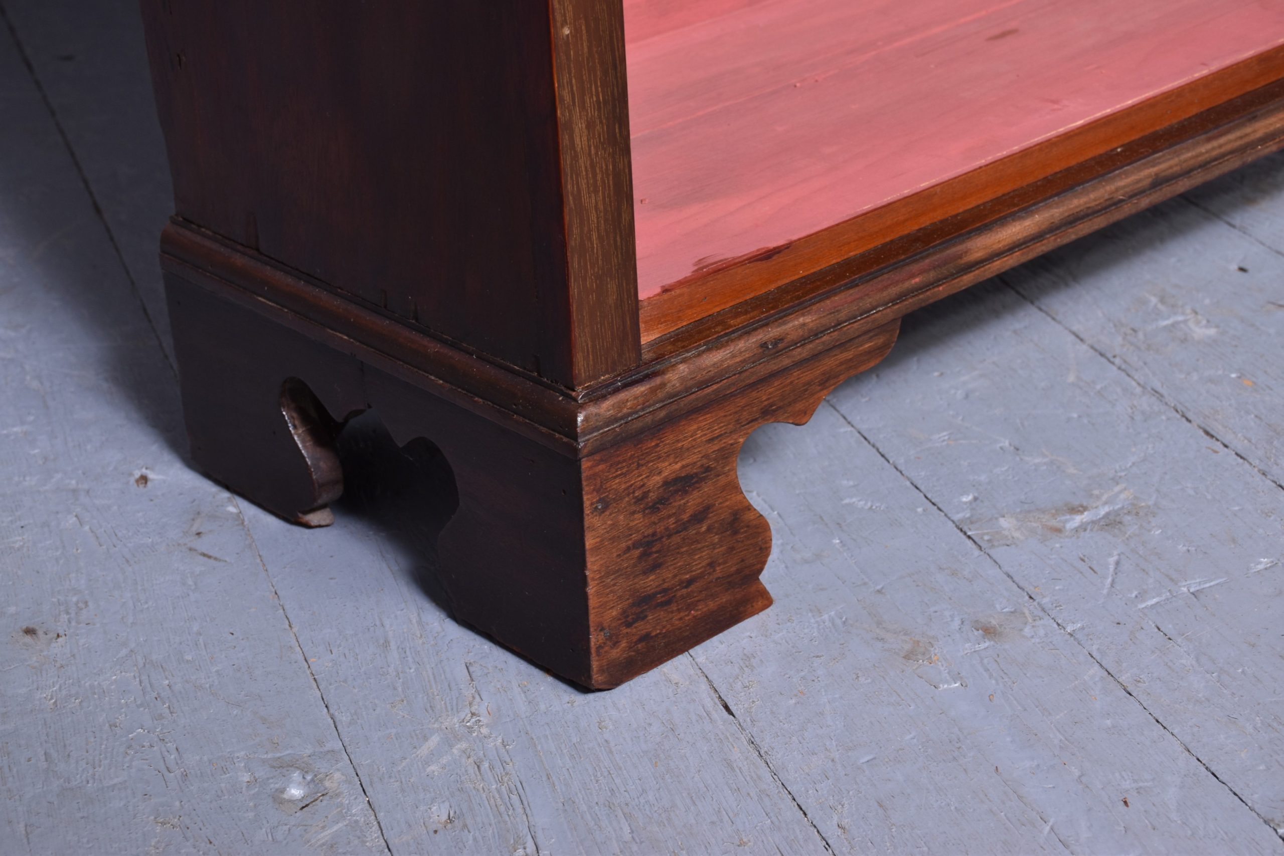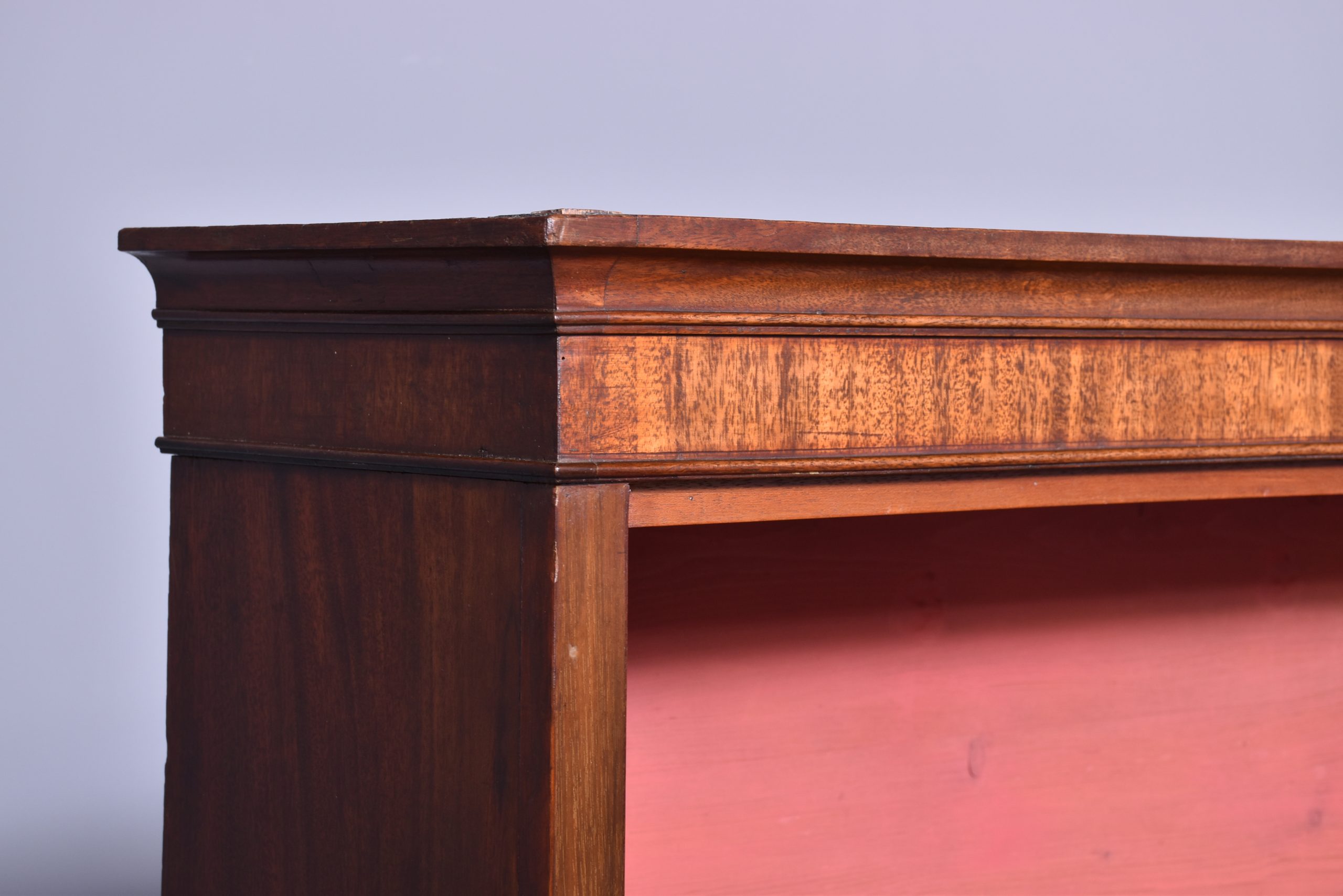 Circa 1880. Georgian-style, mahogany tall open bookcase. Surmounted by a simple cornice and a cross-banded frieze, the open bookcase with three adjustable shelves, flanked by simple pilasters. All supported on a moulded base and shaped bracket feet. In excellent condition. Simple and functional and would suit a contemporary or modern setting.