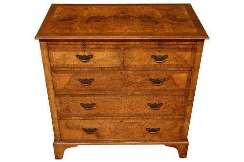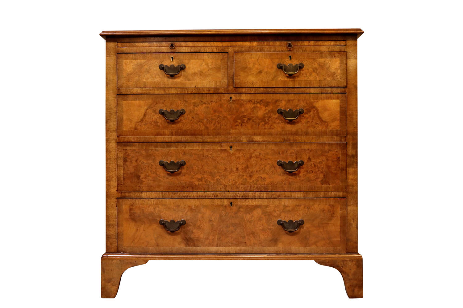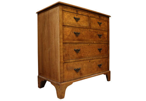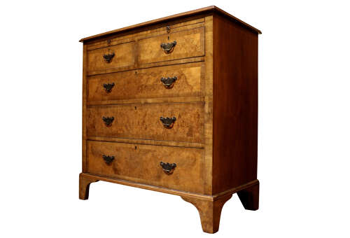 The arrangement of two short drawers over three long drawers is typical of 18th-century design, each drawer faced with burr walnut, crossbanded, and fitted with period-style brass swan-neck handles. Standing on shaped bracket feet and retaining its warm golden-brown colour and rich patina.