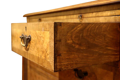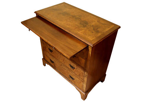 A very attractive Georgian-style walnut bachelor’s chest dating from the 1930s, finely made with well-chosen burr and figured walnut veneers. The rectangular top with book-matched burr walnut is framed by a crossbanded edge and moulded lip. Beneath sits the desirable pull-out brushing slide, a key feature of traditional bachelor’s chests.