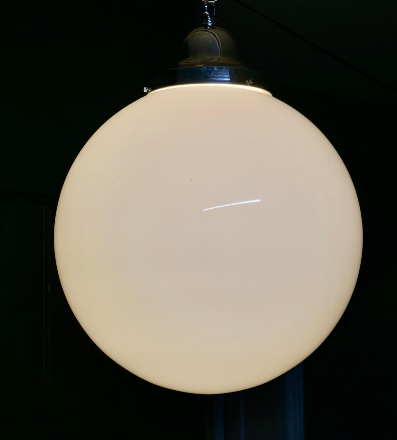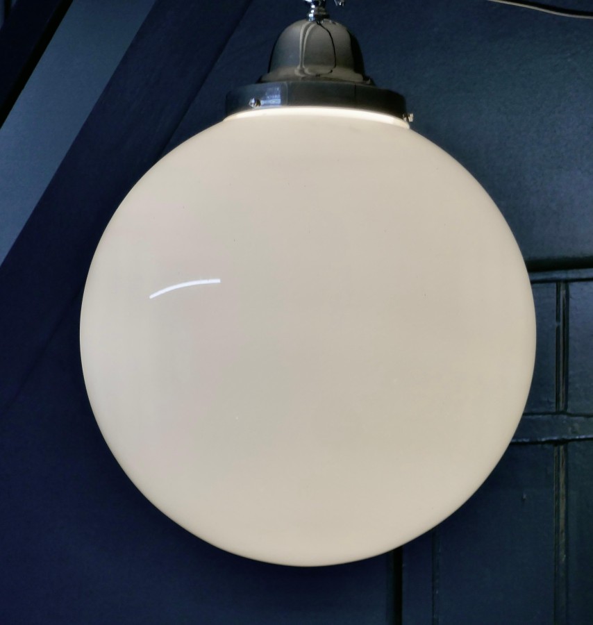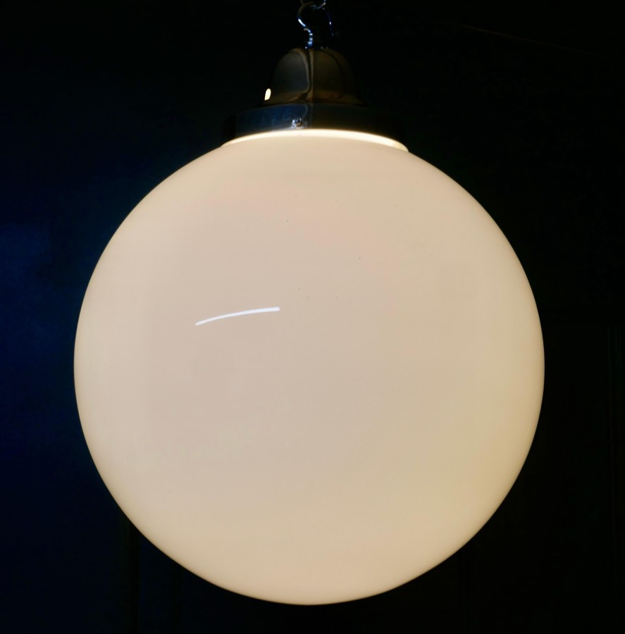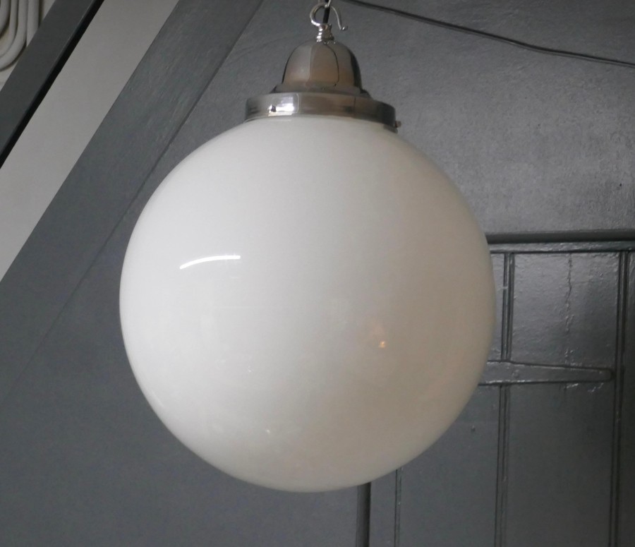 Giant Retro Glass Globe Hanging Light We have 2 of these beautiful large lamps available, this listing is for 1 only Simple and beautiful, this very large globe has a chrome gallery with a hook for hanging Both lights are in good all round condition, the wiring is more or less new The globe is 16” in diameter, 21” including the hook and gallery. NV273 Manufacture Date : 1960 Materials : Opaline-glass
