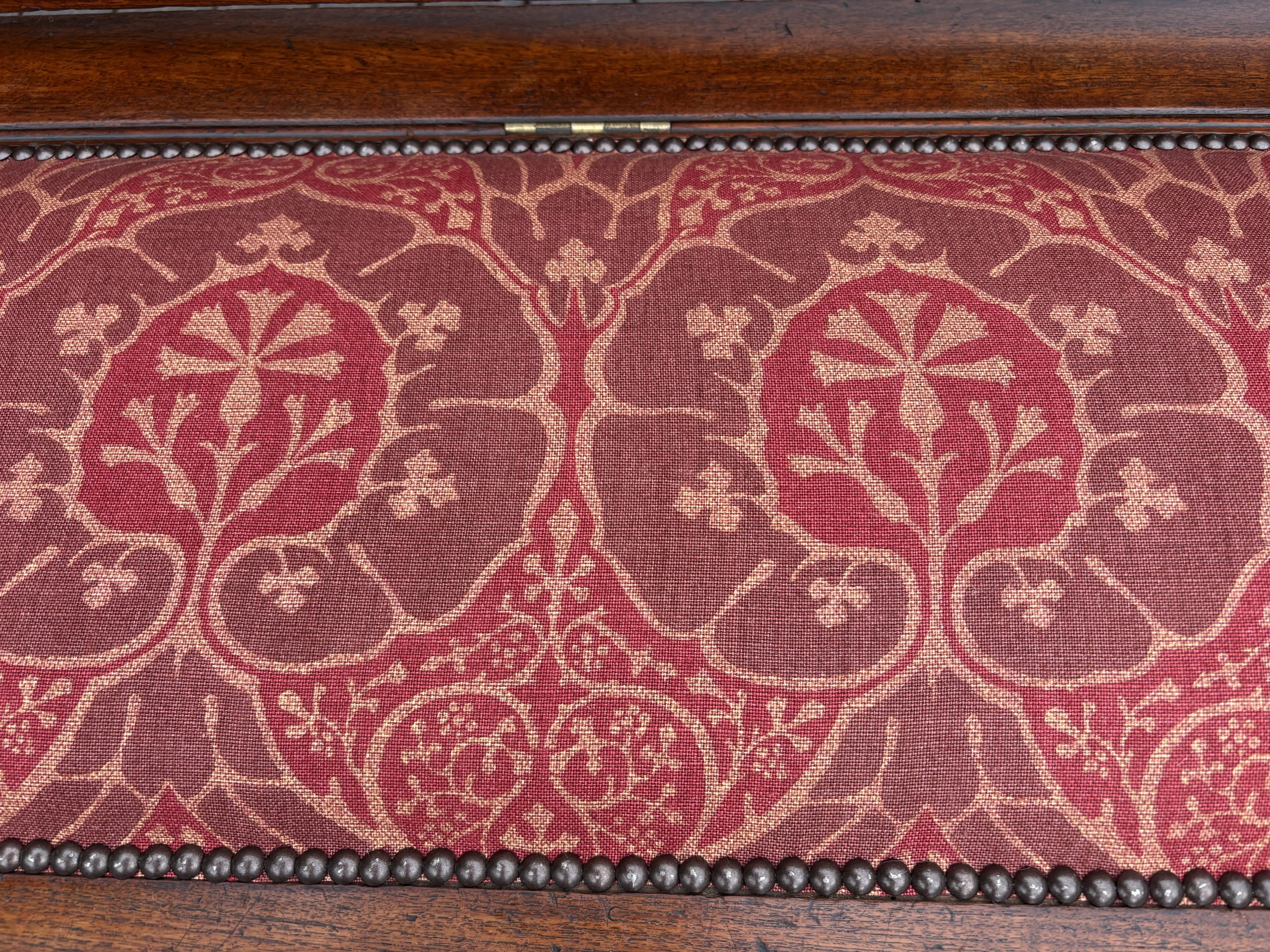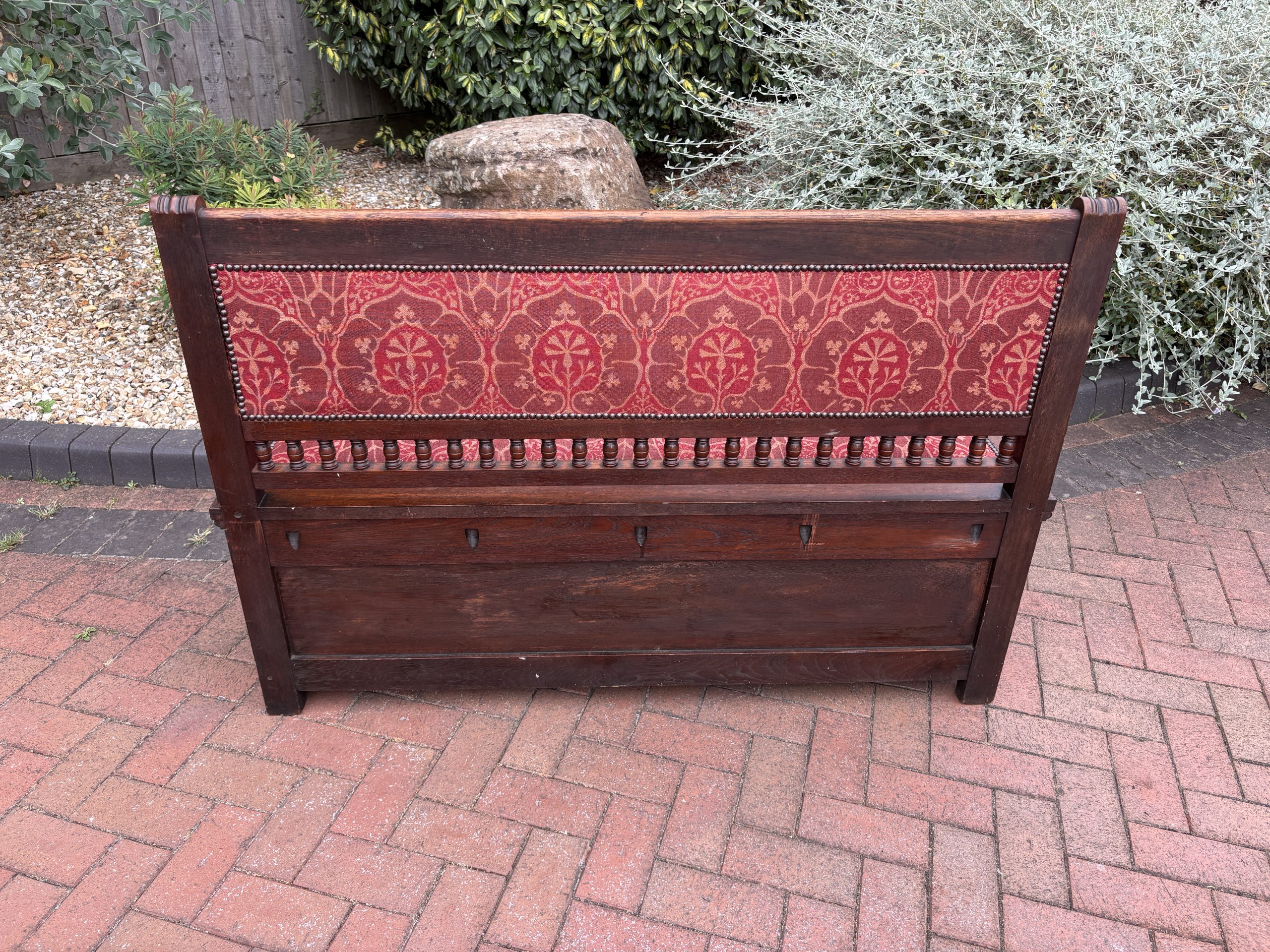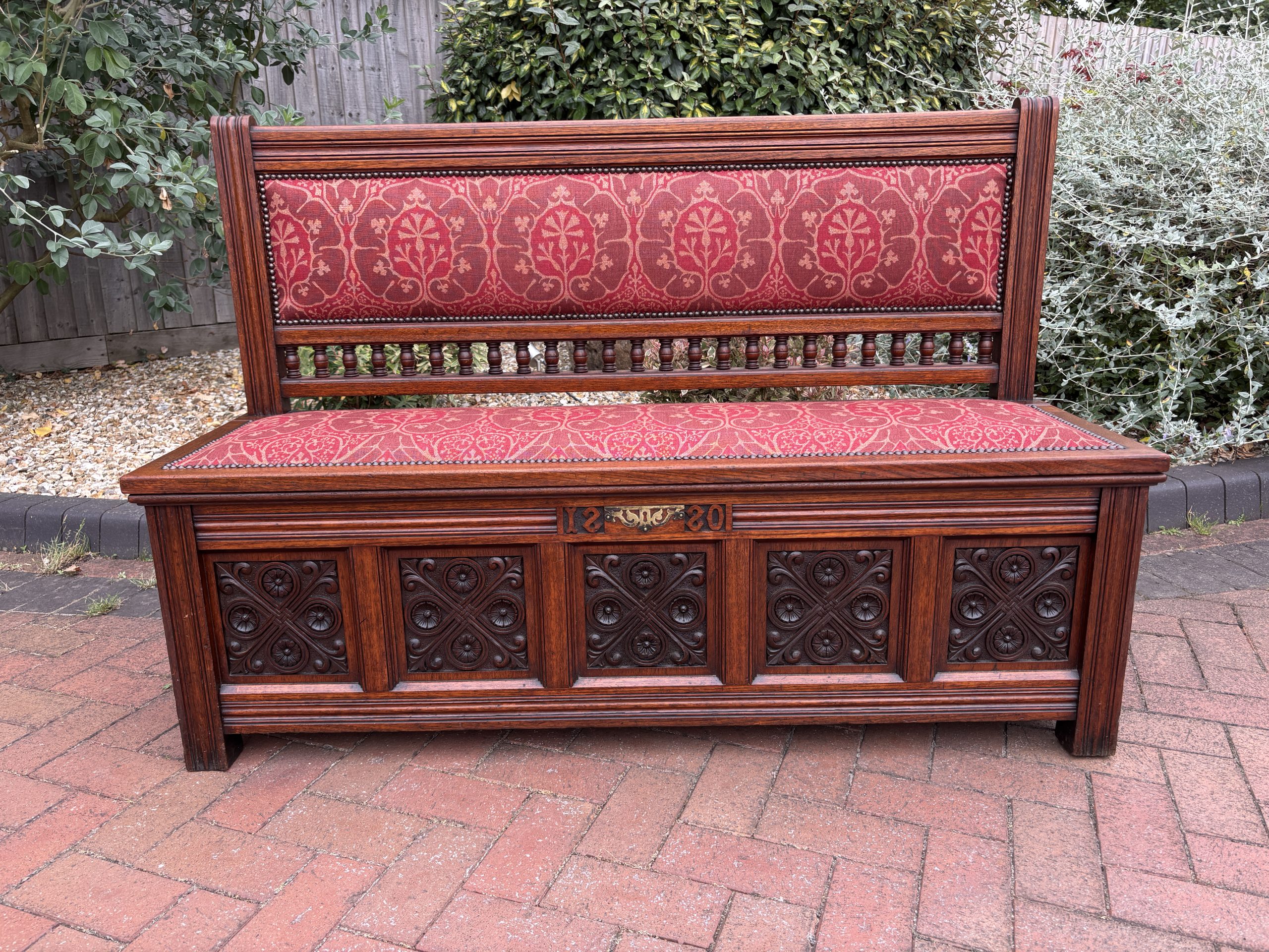 A very well made Arts & Crafts solid walnut settle by Gillows & Co of Lancaster and London. Exceptional carving of foliate and flower design to the five front panels, and dated 1880. A lift up seat with useful storage below, along with the registration number and Gillows & Co makers mark. The seat and backrest has been newly and fully upholstered with new padding to meet with fire regulations and covered in a good quality William Morris fabric.