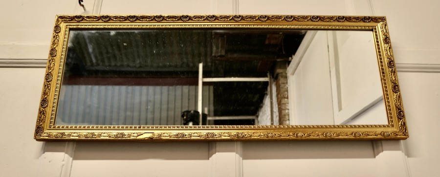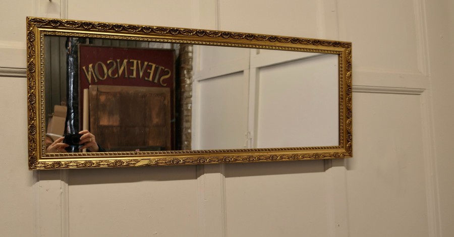 Gilt frame long wall mirror This is a charming and elegant piece, it is unusually long and landscape the bright Gilt mirror frame is 2” wide and is very attractive The piece is in good condition but for a small piece on the front of the frame’s lower edge The Mirror is 15” high, 37.5” wide JK82. Manufacture Date : 1920 Materials : Giltwood