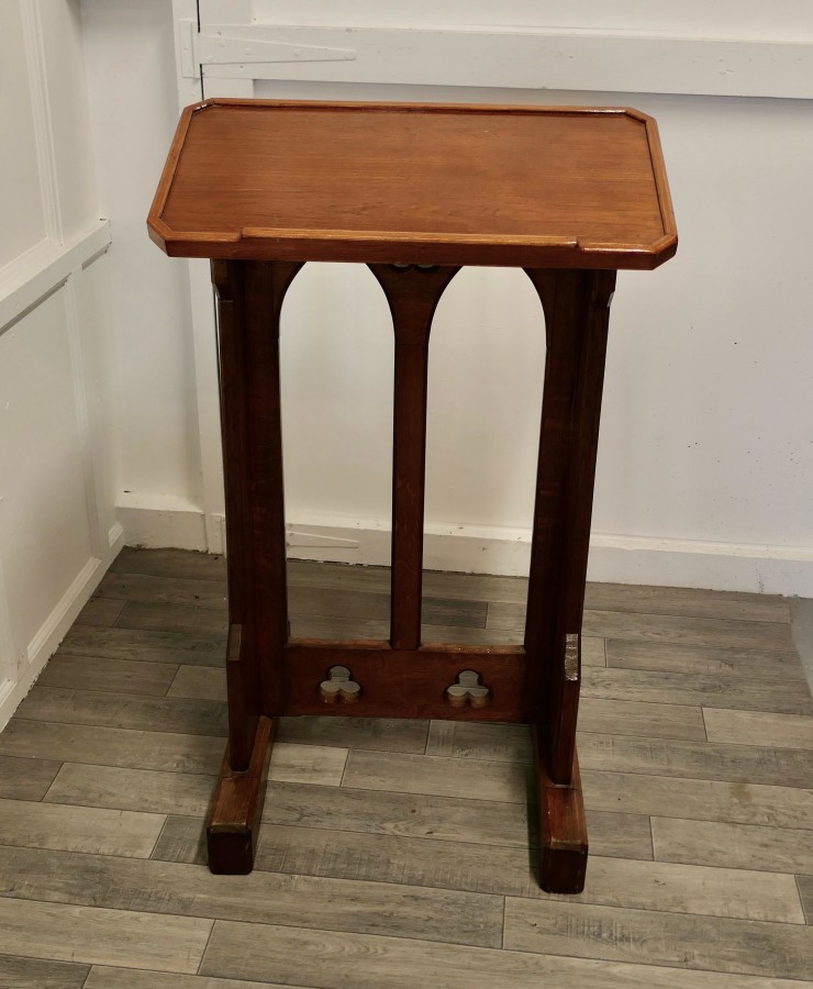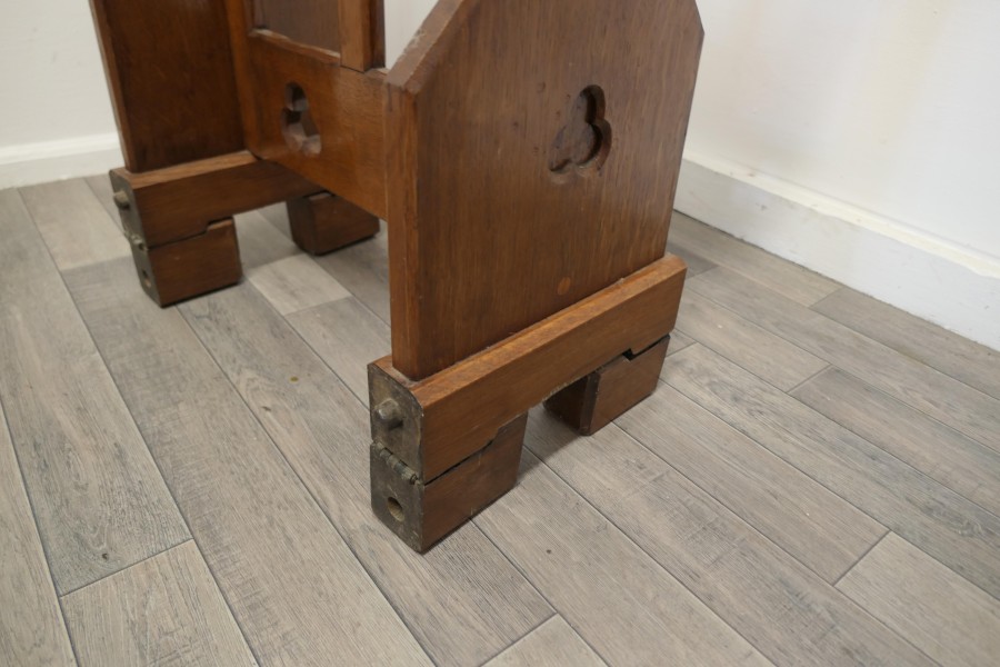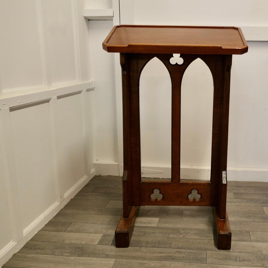 Golden Oak Arts and Crafts restaurant reception greeter Golden Oak Arts and Crafts Greeter, the top of the desk has a small gallery around the edge to hold menus etc. in place There is a sturdy adjustable height base at the bottom of the desk, the feet flip under and can raise the height by about 3” The Greeter is in good condition, it is 43 0r 46” tall, 27” wide and 14” or 23” deep at the floor GF78. Manufacture Date : 1880 Materials : Oak