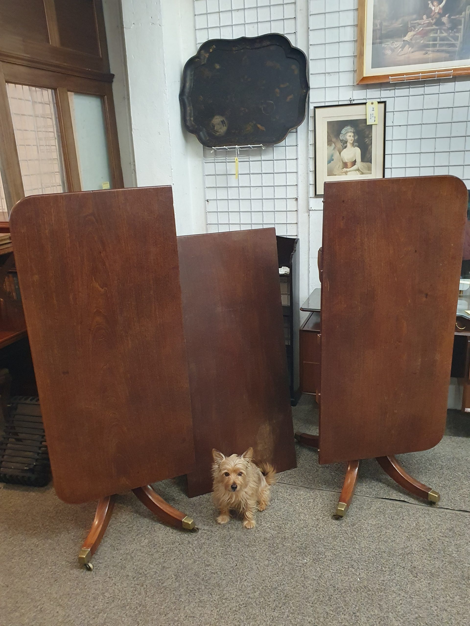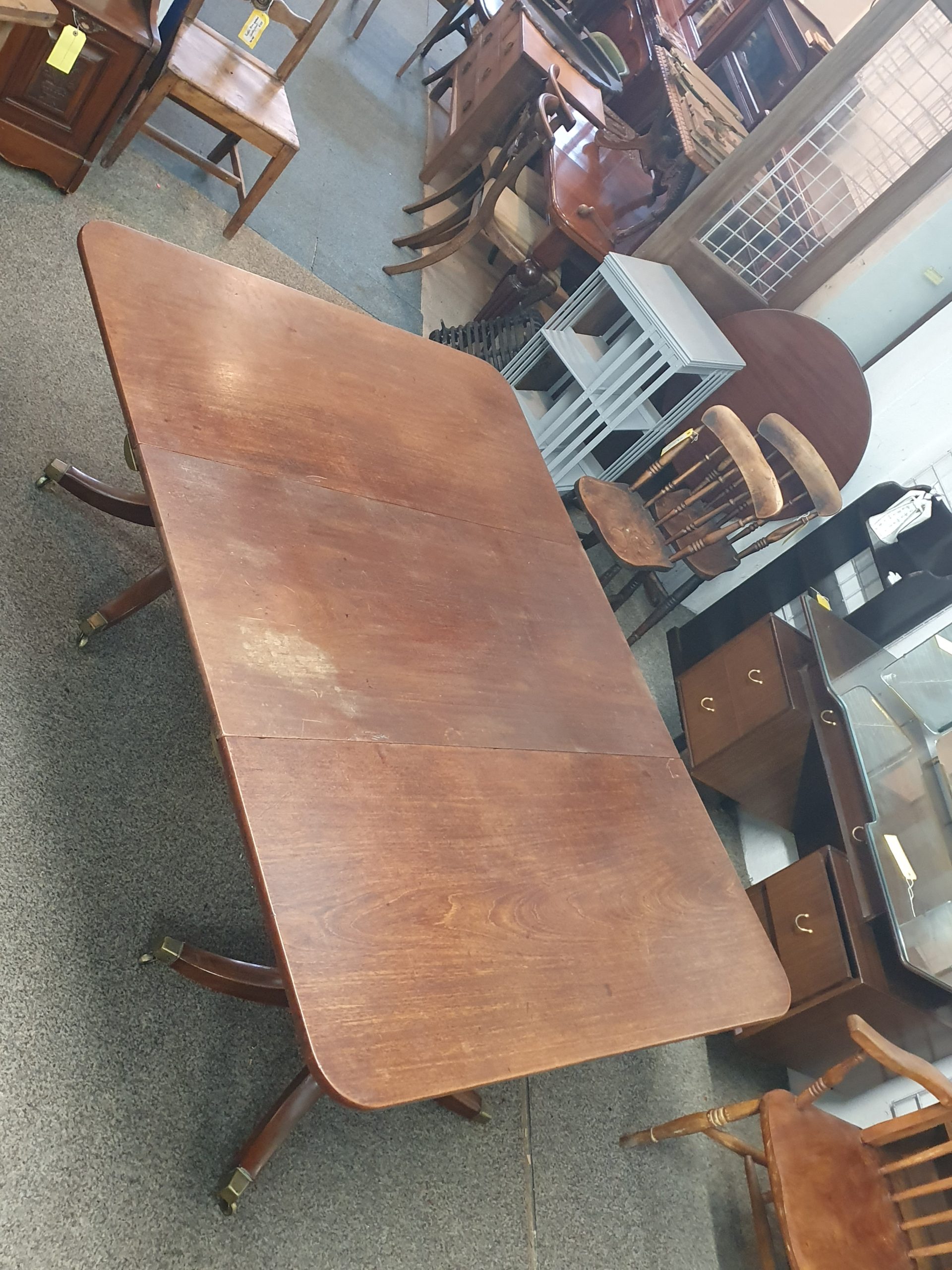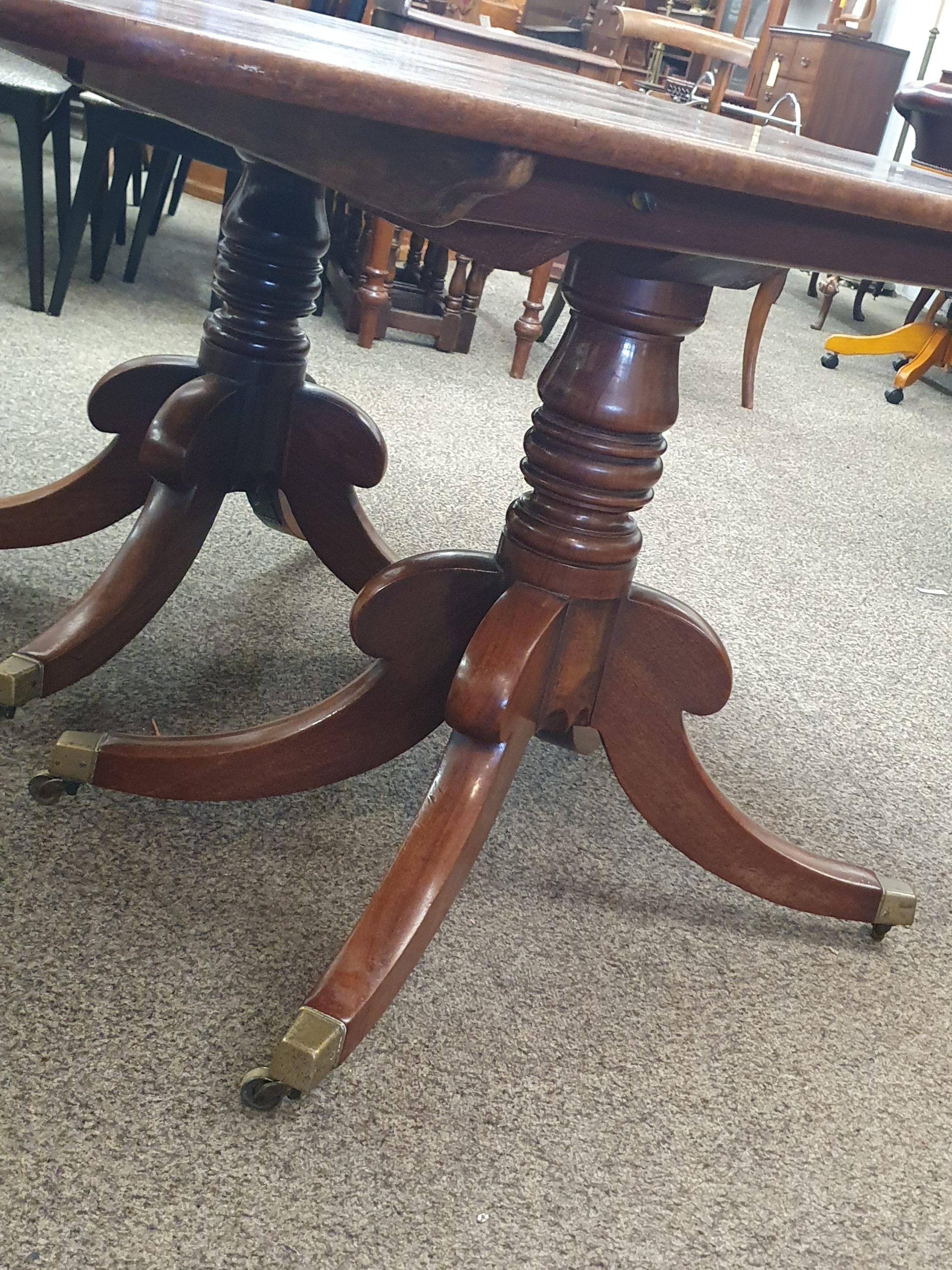 Good antique 19thC Regency mahogany twin pillar dining table seats 8.