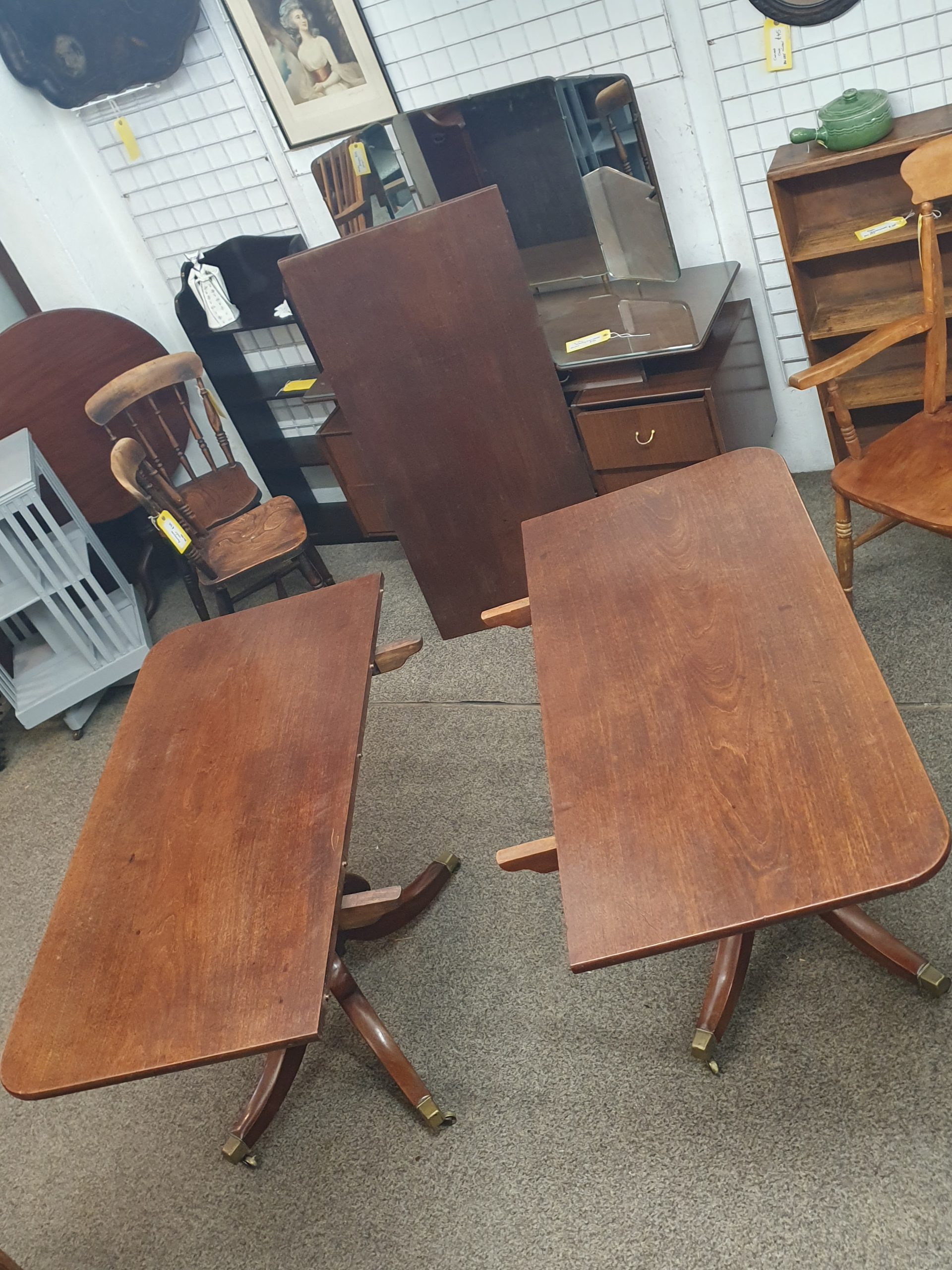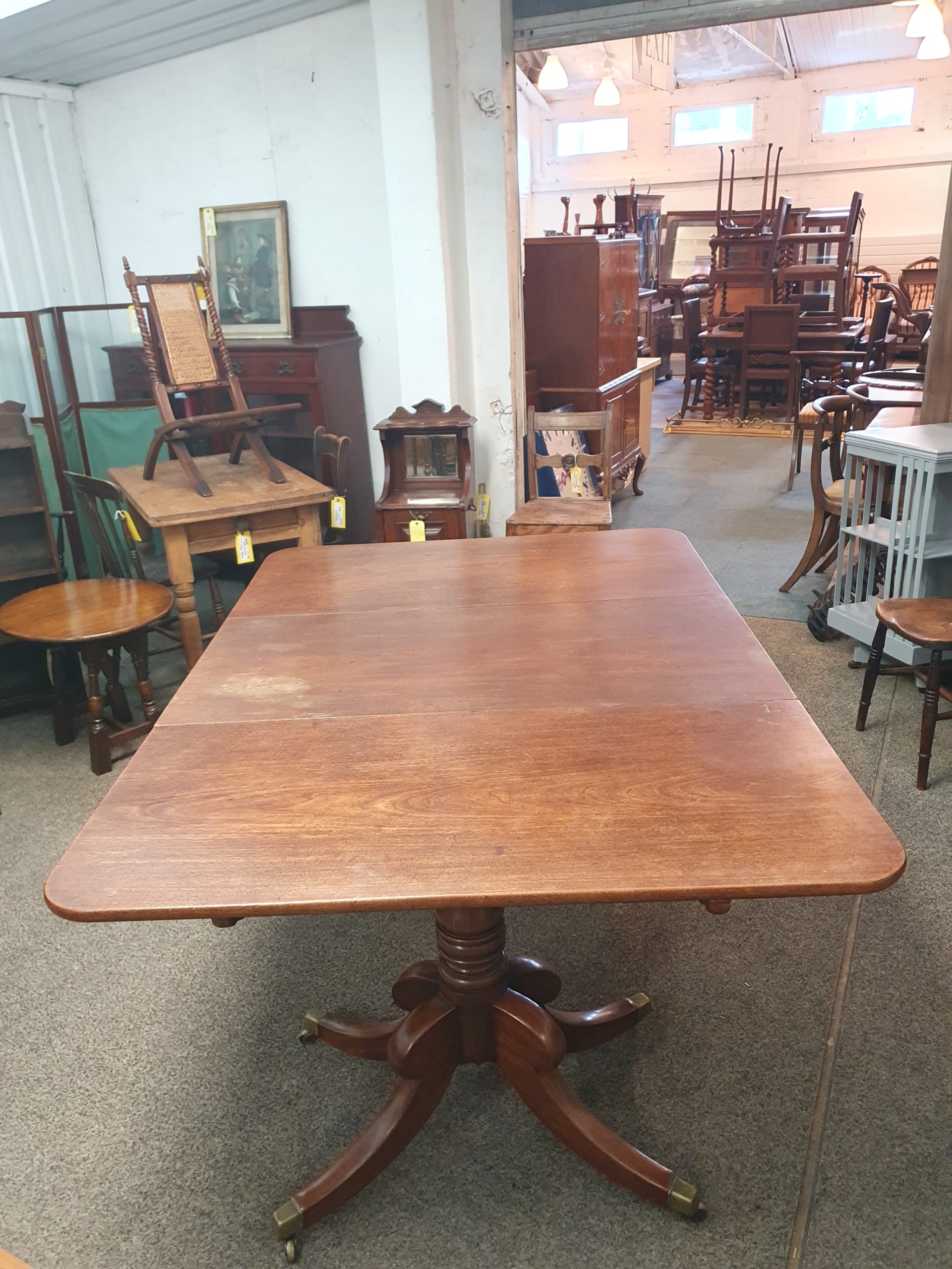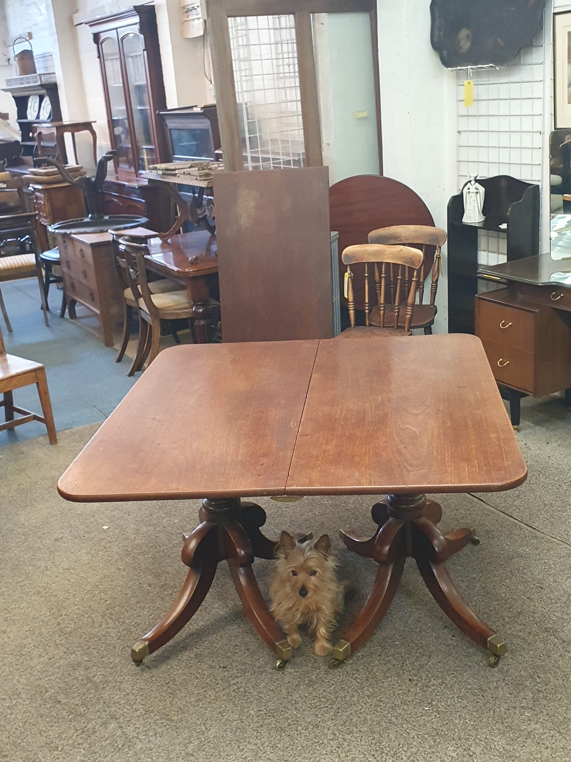 Good antique 19thC Regency mahogany twin pillar dining table seats 8.