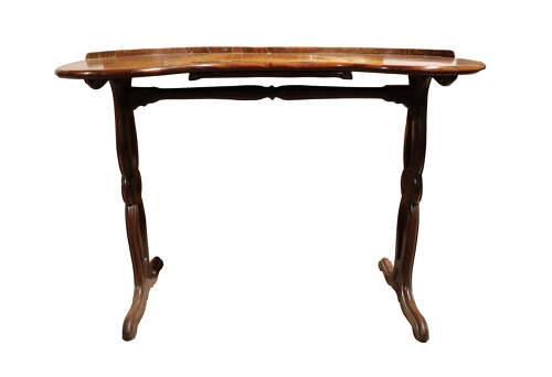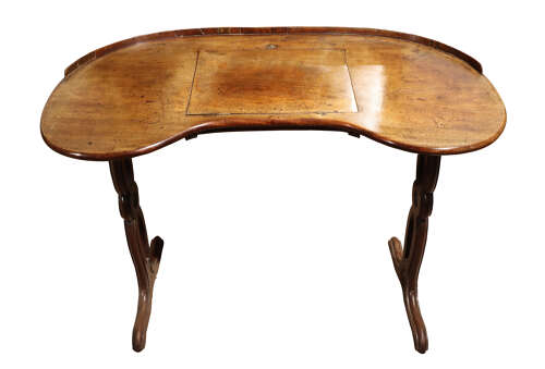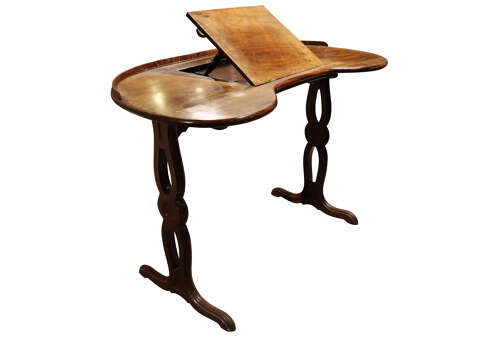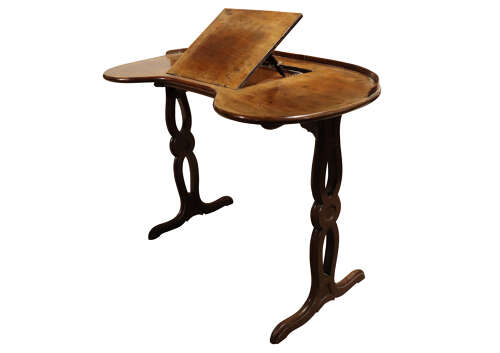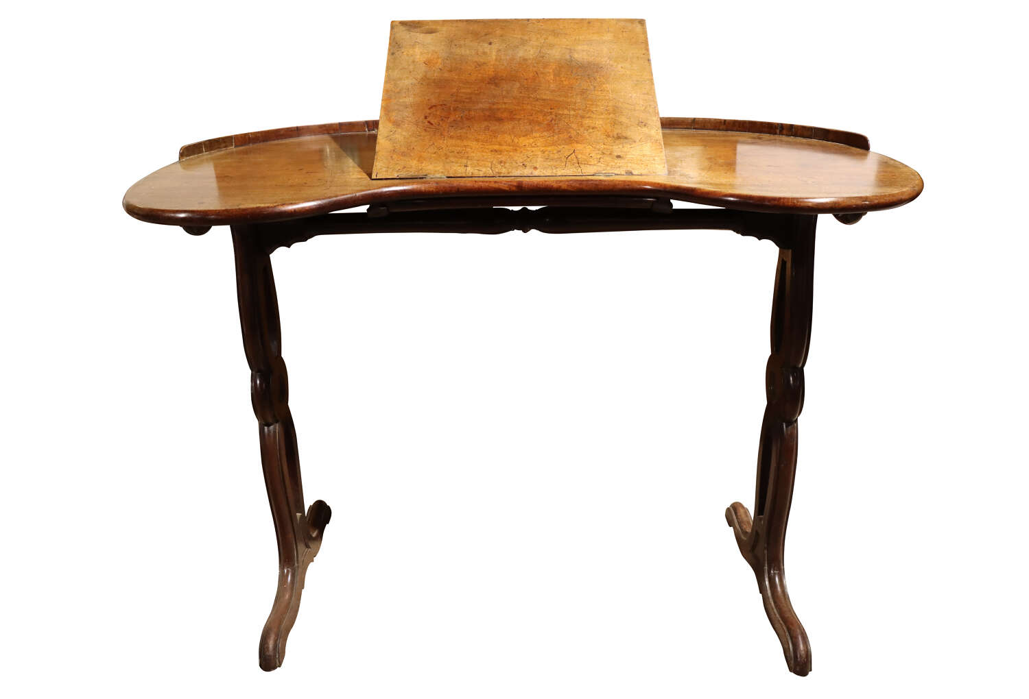 A fine quality mid-19th century mahogany kidney-shaped library table, the shaped top with moulded edge and raised gallery, fitted with a central hinged reading slope and sliding support. The elegant silhouette is supported on twin open scroll trestle end standards joined by a turned stretcher, standing on shaped feet. Warm patination and original character throughout, making this an attractive and practical piece of early Victorian library furniture.