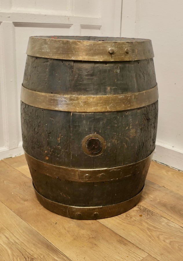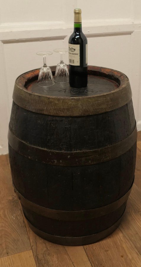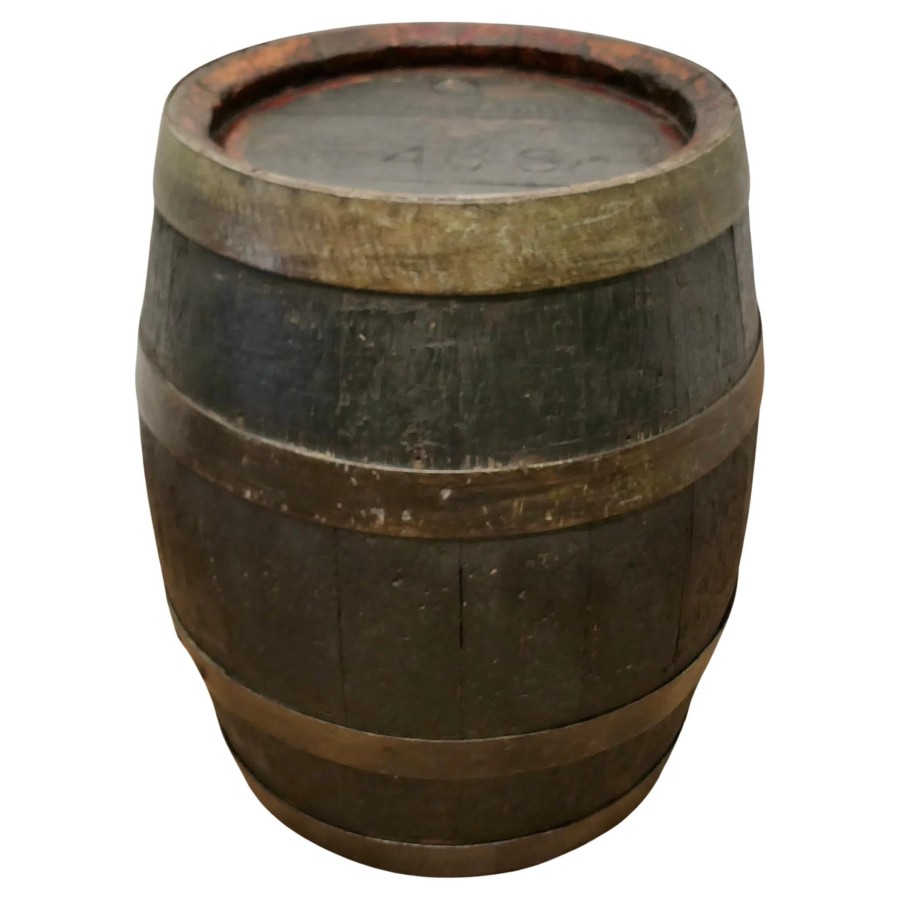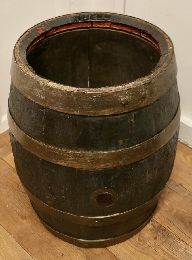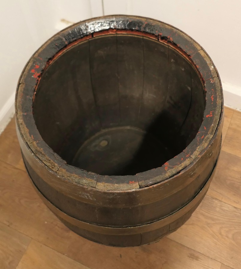 Good Size Oak Brewery Barrel, Table, Log Bin or Christmas Tree A superb strong coopered Oak barrel, it is from Brickwoods Brewery, This good looking piece originated as a 19th Century Beer Barrel, it is made with oak staves and bound with metal hoops, the wide top opening allows the barrel to be used as a container for logs by the fireside or possibly to plant your Christmas tree into, if you turn the barrel with the closed end up it would make a great table for your beer or wine The barrel is in good sound condition and charming to look at, it is 26” high and 22” in diameter VY27 Manufacture Date : 1890 Materials : Oak
