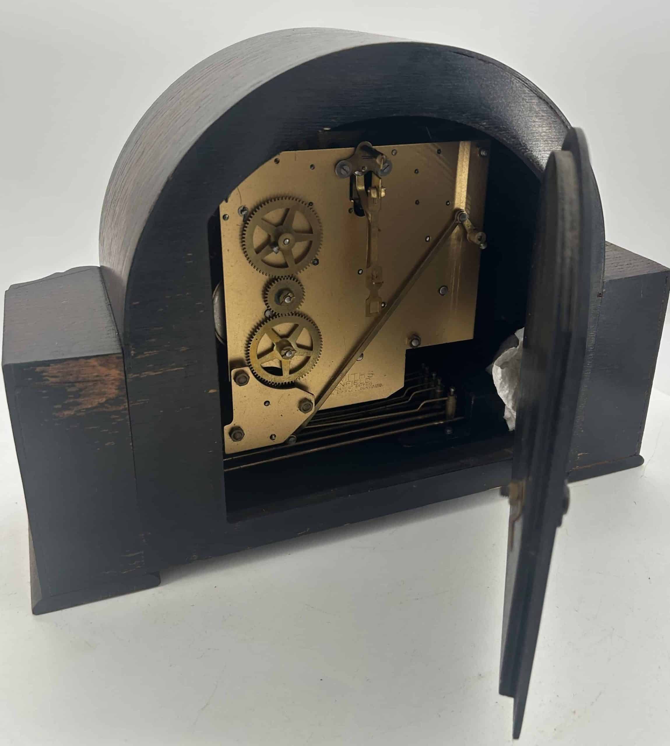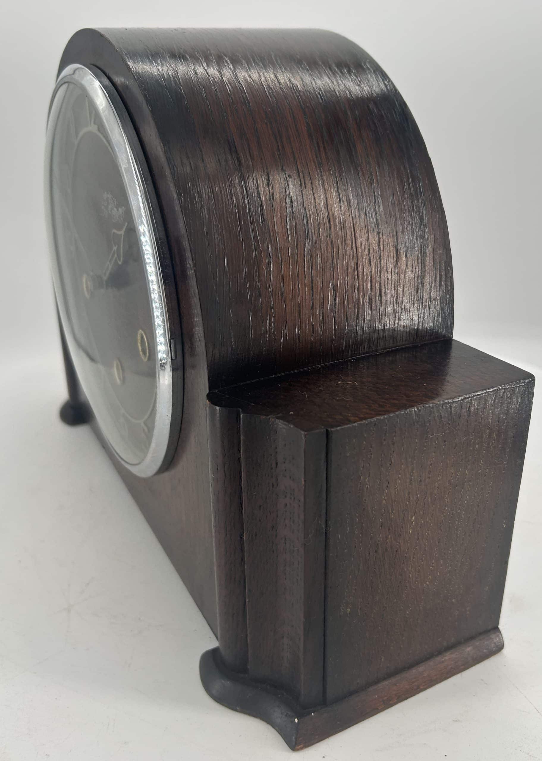 Wonderful silver dial and matching hands under a convex chrome bezel. Fantastic oak case, classic art deco shape.