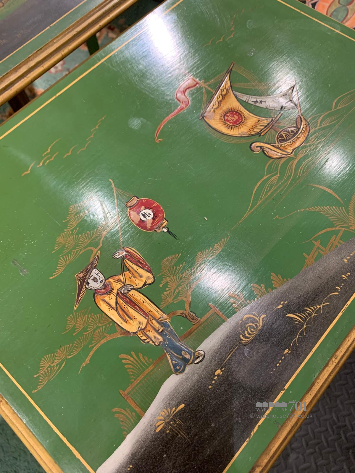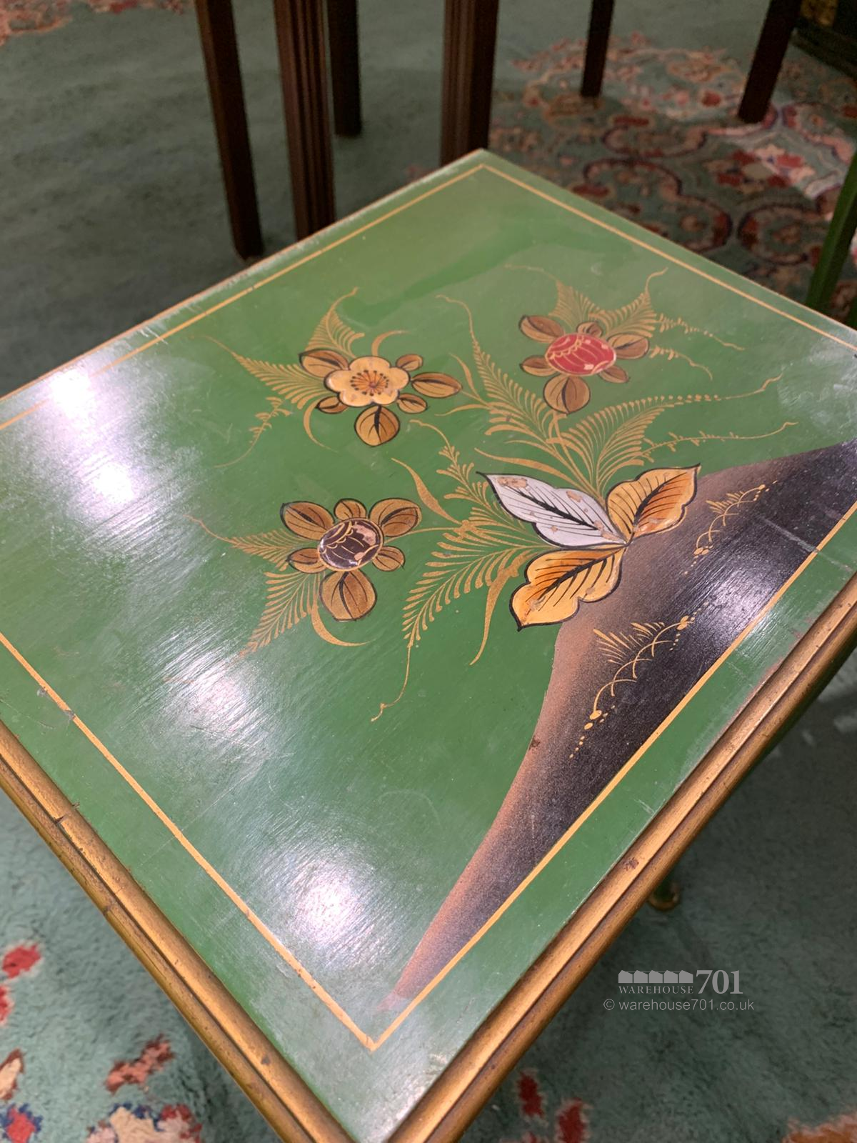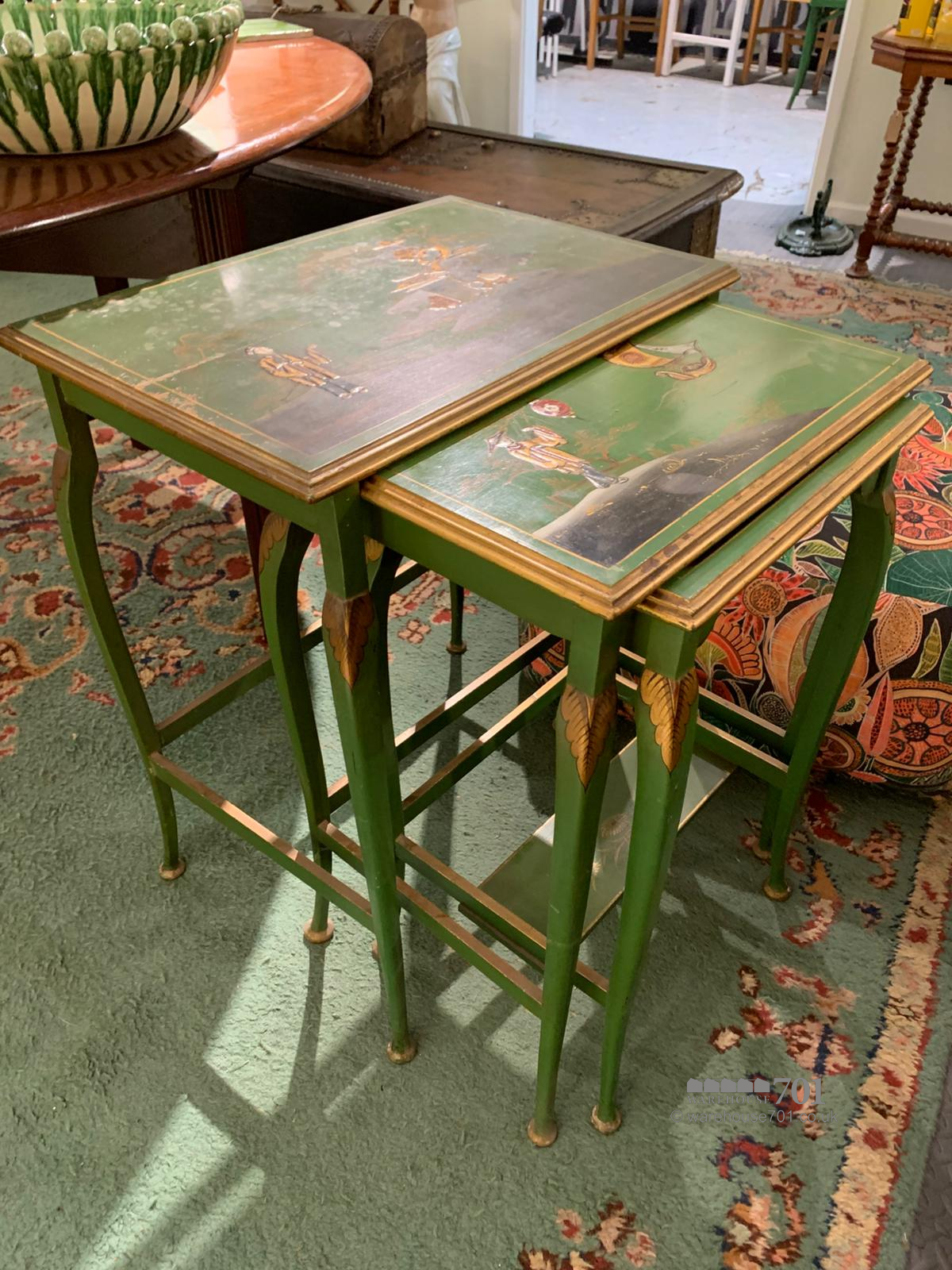 This charming nest of three chinoiserie tables brings together elegance, artistry and practicality in a wonderfully decorative trio. Each table is adorned with hand-painted scenes in rich greens and gilded accents, featuring delicate figures, birds and floral motifs that capture the romantic imagination of traditional chinoiserie style. The gently splayed legs and shaped stretchers add refinement to their form, while the lacquered tops provide a glossy depth that enhances the intricate detailing. Perfect for use as occasional tables or as a graceful display piece, this set offers both beauty and versatility, sliding neatly together when not in use yet making a striking statement when arranged individually.