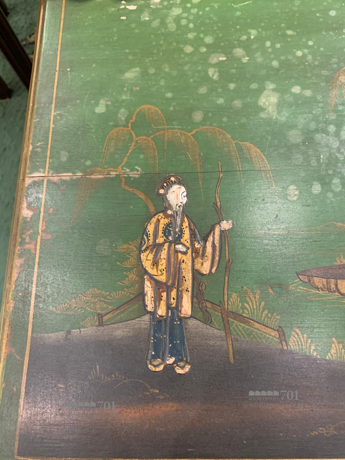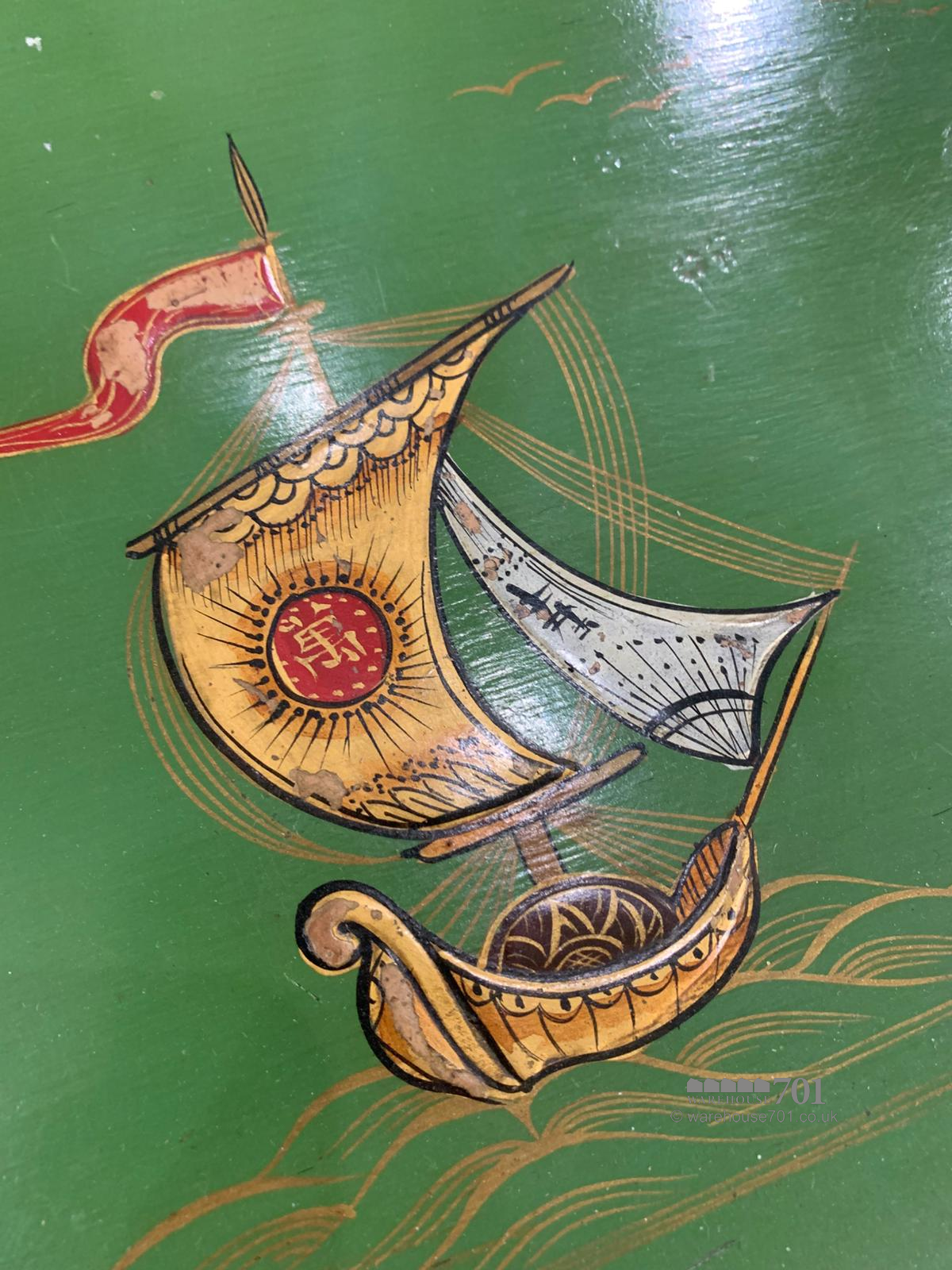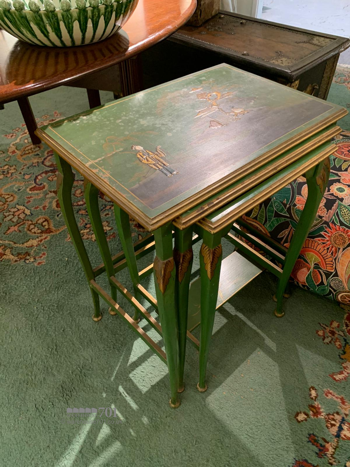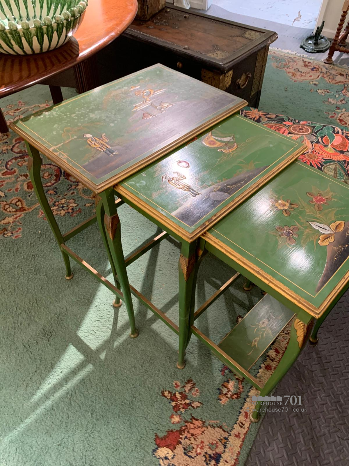 This charming nest of three chinoiserie tables brings together elegance, artistry and practicality in a wonderfully decorative trio. Each table is adorned with hand-painted scenes in rich greens and gilded accents, featuring delicate figures, birds and floral motifs that capture the romantic imagination of traditional chinoiserie style. The gently splayed legs and shaped stretchers add refinement to their form, while the lacquered tops provide a glossy depth that enhances the intricate detailing. Perfect for use as occasional tables or as a graceful display piece, this set offers both beauty and versatility, sliding neatly together when not in use yet making a striking statement when arranged individually.