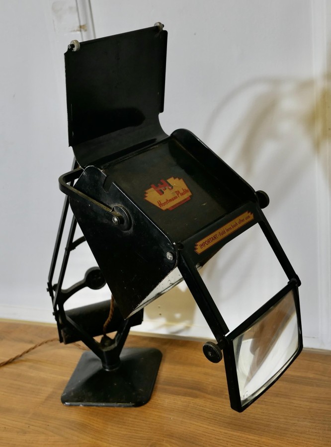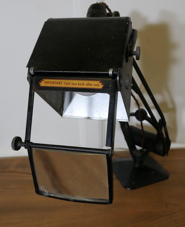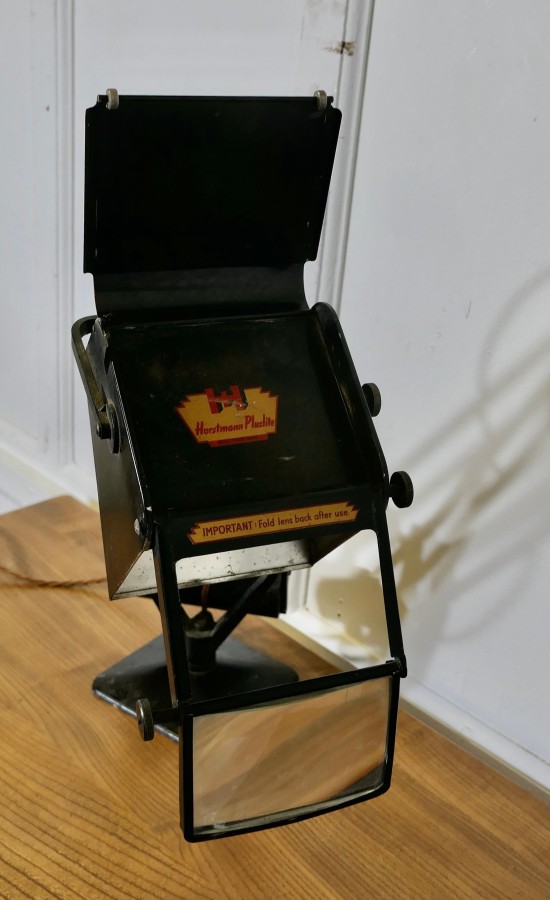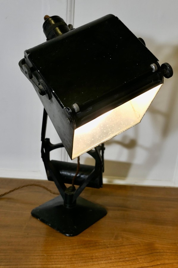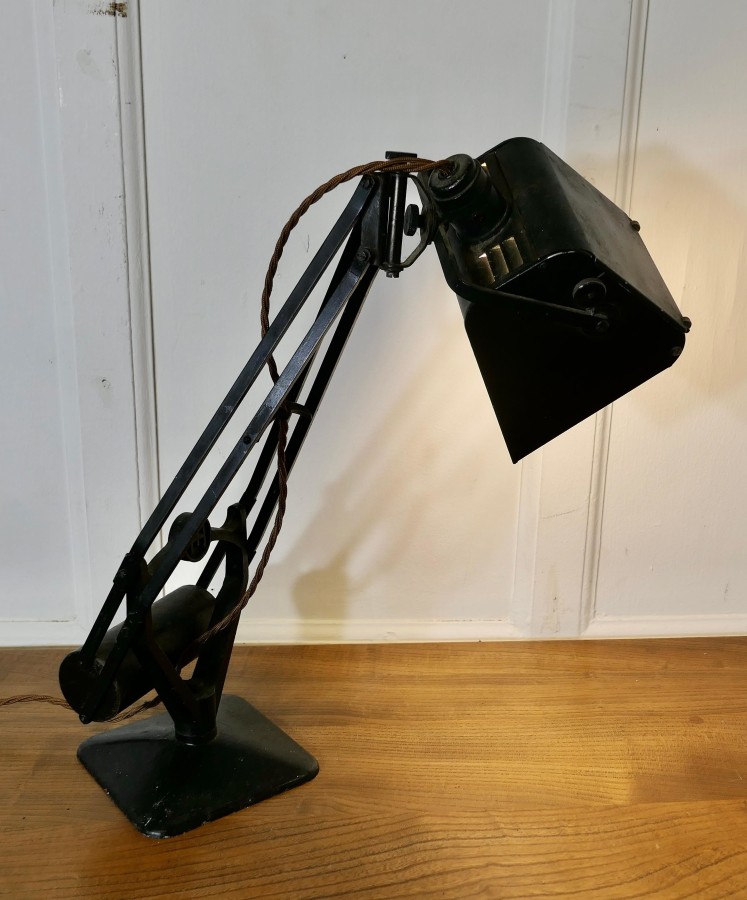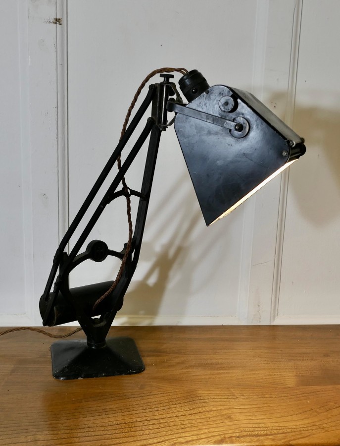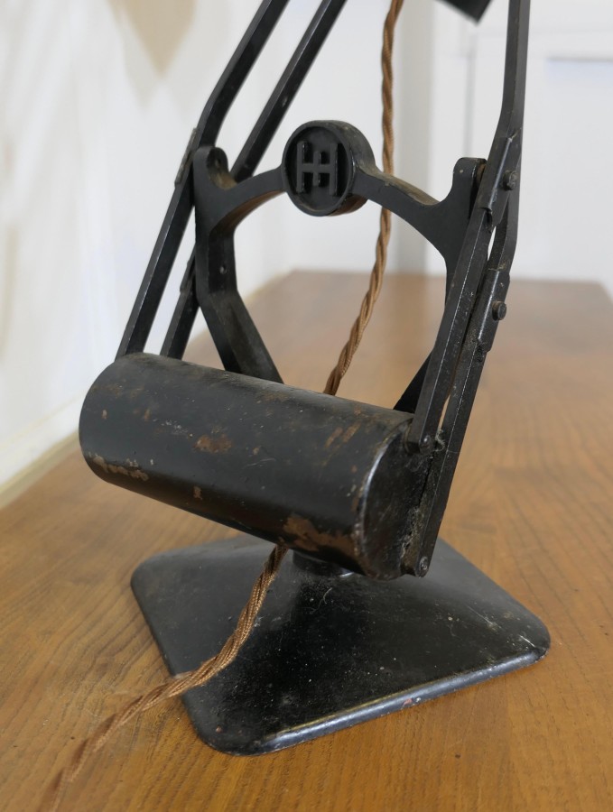 Hadrill Horstmann Pluslite Magnifying Industrial Desk Lamp Very rare in original condition Horstmann Pluslite model Desk/Work lamp, in full working order. it has their iconic roller counterbalance design with an adjustable frame and shade, it comes complete with its original magnifying lens In good original rewired condition The Lamp is 20” tall, 16” wide and 7” deep FB130 Manufacture Date : 1950 Materials : Metal