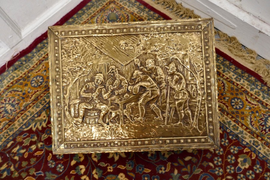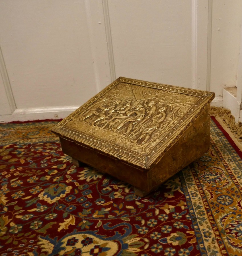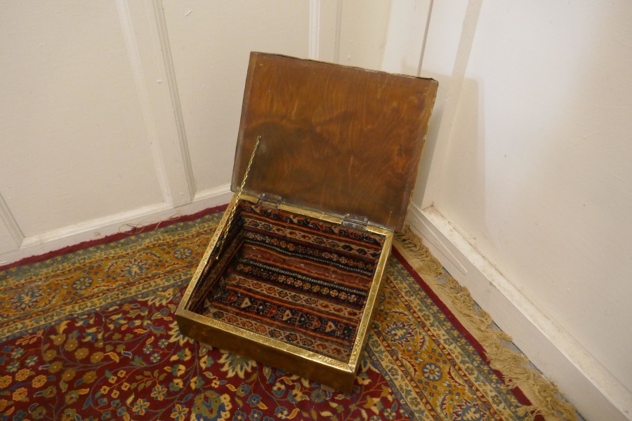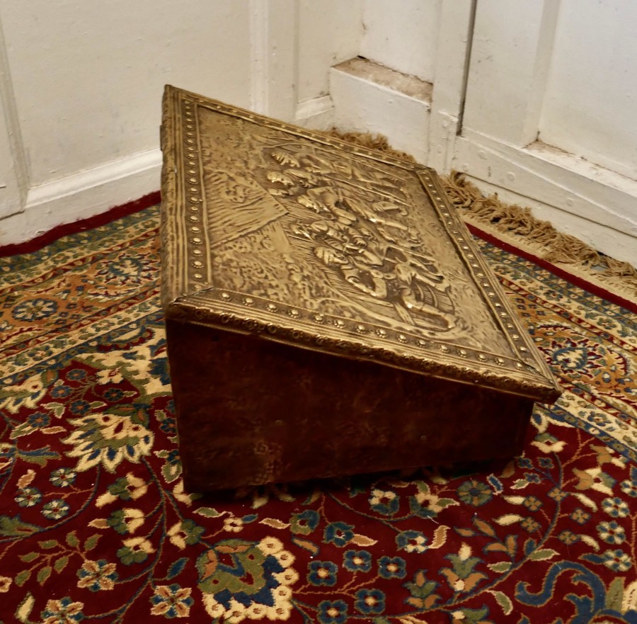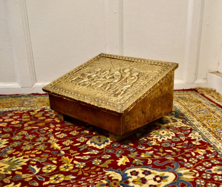 Hand beaten brass fireside slipper box A super little piece and so useful, this box would have been kept by the fireside not only does it keep your carpet slippers tidy when not being used but they are kept cosy and warm as well The box is in good condition with a tavern scene on the front and it is lined with antique carpet on the inside It is 10” high, 16” wide and 13” deep TAC72. Manufacture Date : 1920 Materials : Brass