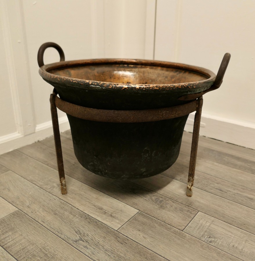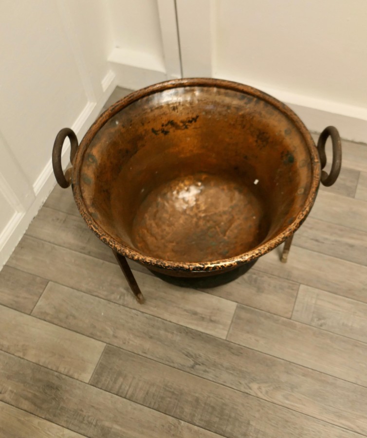 Hand beaten copper cooking cauldron on stand, log basket This is a lovely early Cooking Pot, it is made in hand beaten copper, slightly flaring out at the top with a sturdy handle on each side The pot has a rolled top edge, Iron handles and sits inside its own iron stand making it very steady by the fire side, it is very sound with the usual age related dings and dents it would make an excellent coal or log container The Cauldron on its stand is 16” high and 22” in diameter TCC120. Manufacture Date : 1850 Materials : Copper