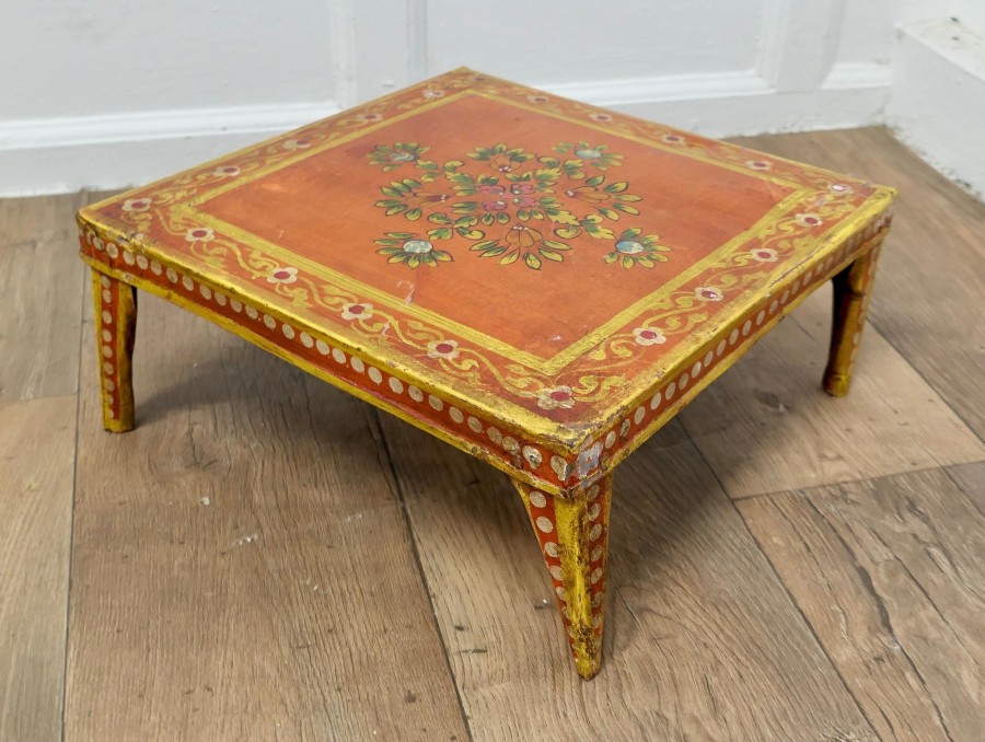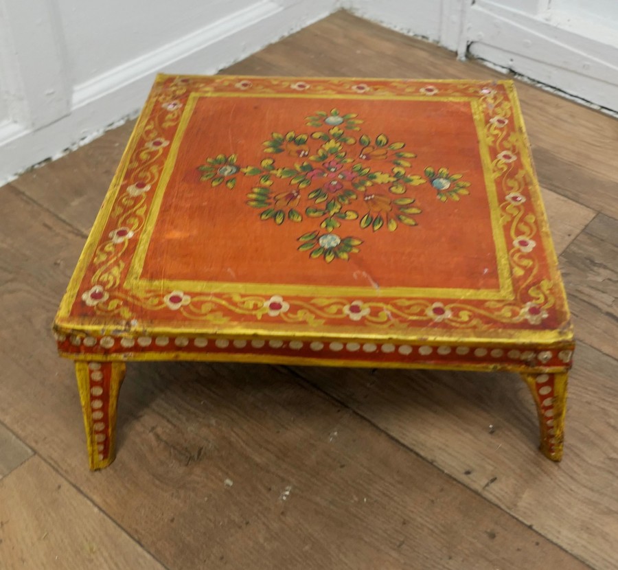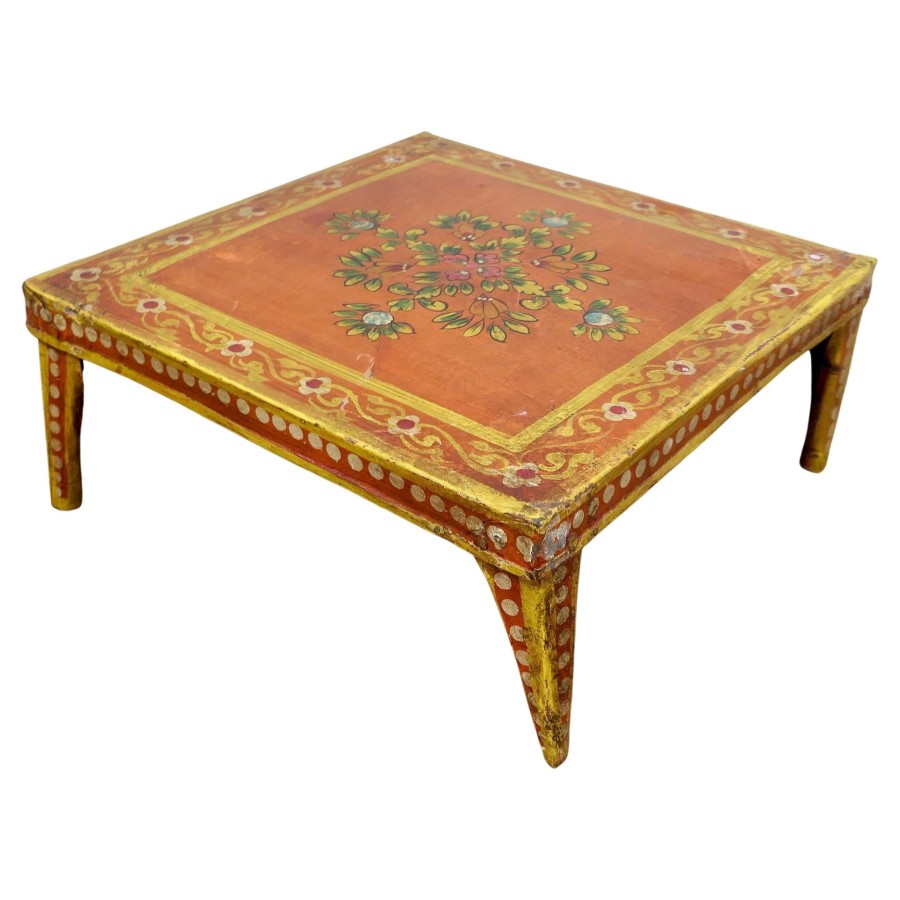 Hand Painted Indian Folk Art Stand or Low Table A Lovely Decorative piece painted in an orange pallet with Flowers This little metal table is very stable if a little shabby The Stand is 6” high, and 15” square MS255 Manufacture Date : 19th Century Materials : Tin