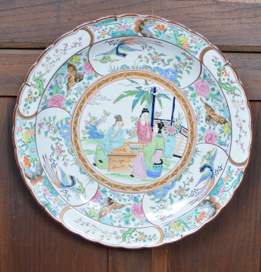 Fantastic quality hand painted Oriental charger in excellent condition. The centre depicts 3 figures in traditional dress surrounded by panels decorated with flowers, leaves, trees and birds in wonderful pastel colours. To the reverse of the charger there is hand-painted motifs around the rim with character marks in the centre. This is an attractive charger with a stunning colour palette with a delicate vibrancy throughout. This very decorative charger would make a lovely accent piece in a wide range of settings.