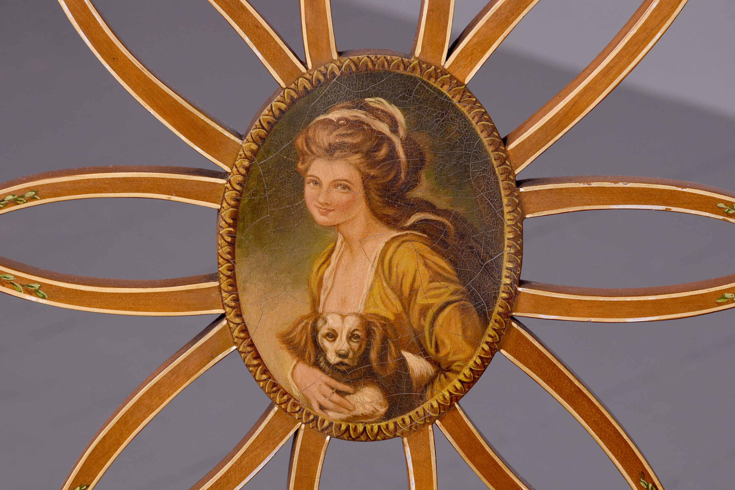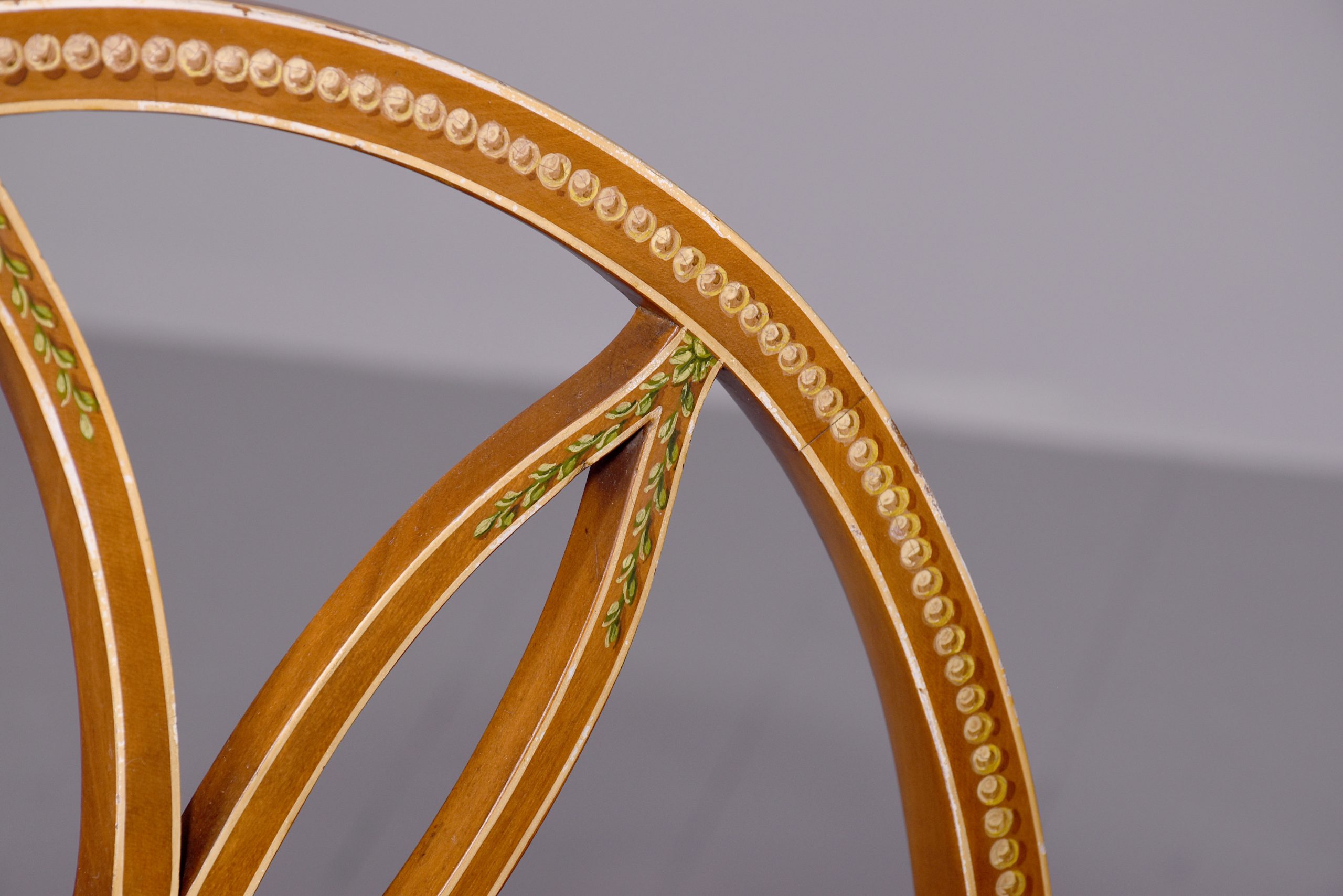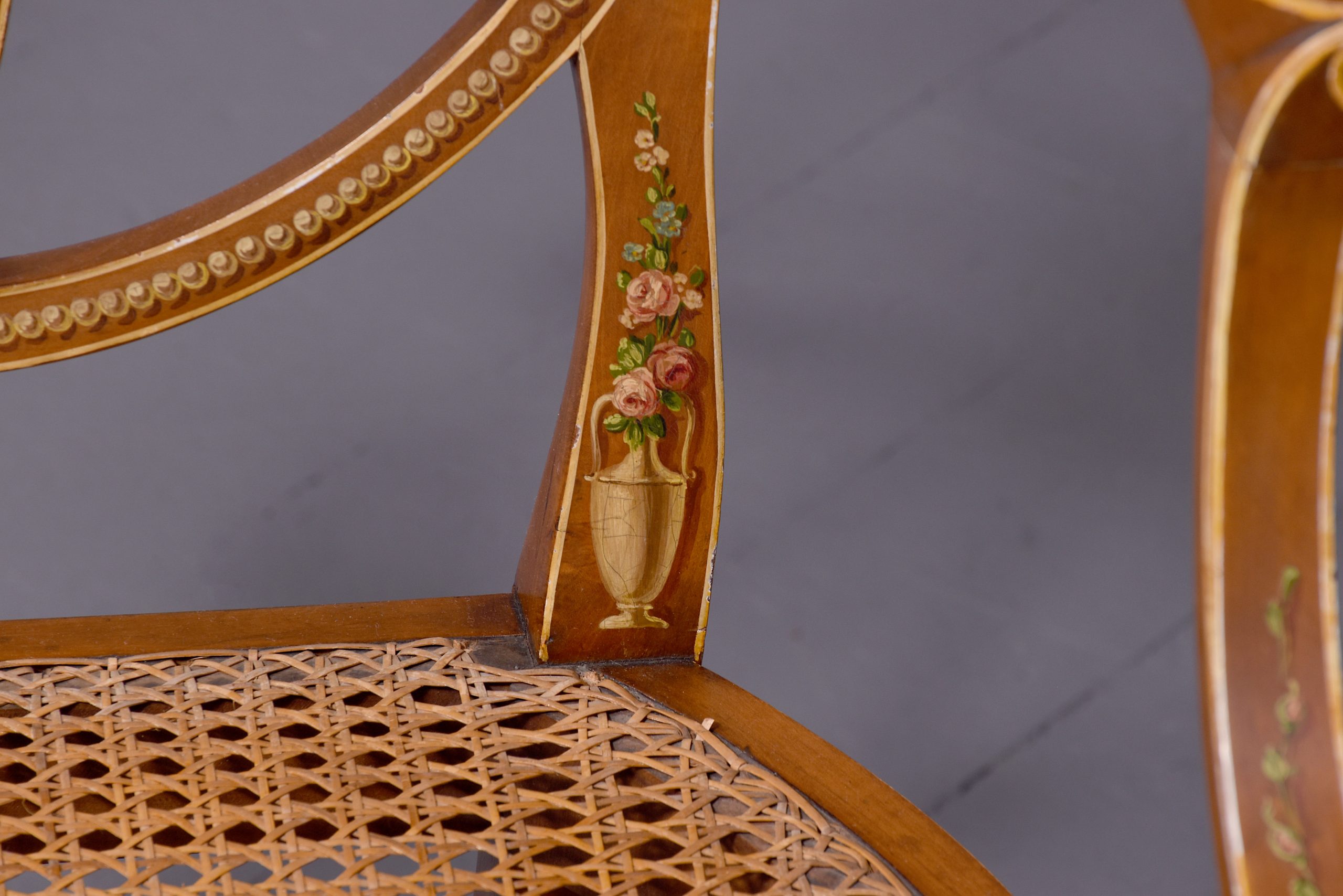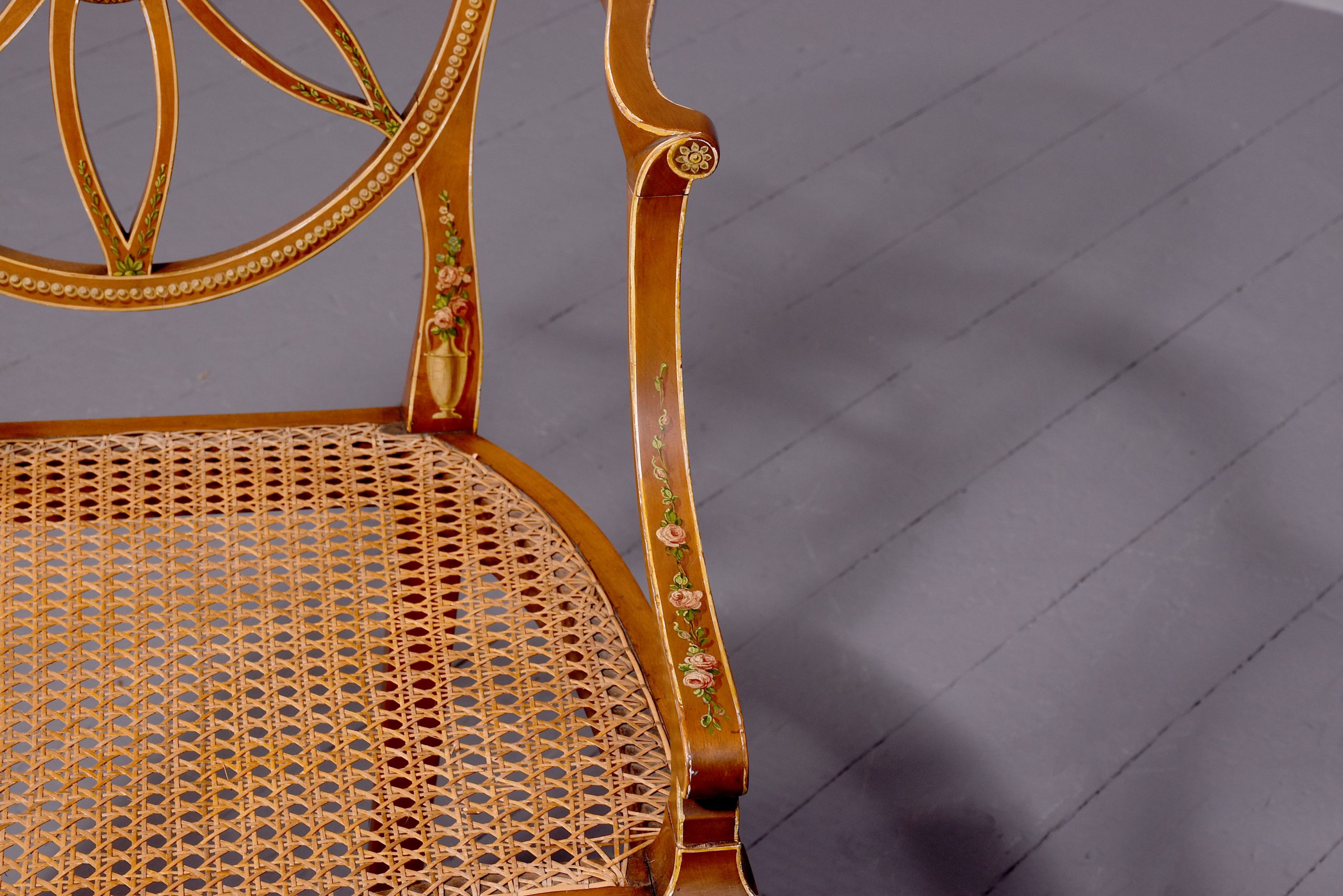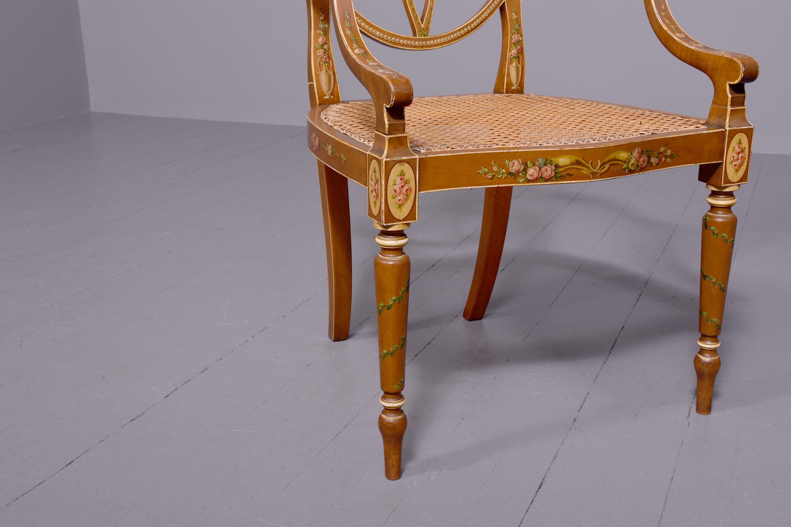 Circa 1890. Stylish and elegant hand painted satinwood chair in Adam style, the wonderful oval back with a painted oval panel of a lady in the center after ‘Angelica Kauffman’, supported on a series of curved and painted sections forming a petal, the curvaceous arms with flower heads painted on the end and on the facings supported on the uprights, with Bergere seat in excellent condition, the serpentine seat rail painted on the front and sides, the back legs are slightly out swept and hand-painted, the front legs are turned ring turned with flowers on the top with painted entwined foliate on the legs finishing on an extended toe.