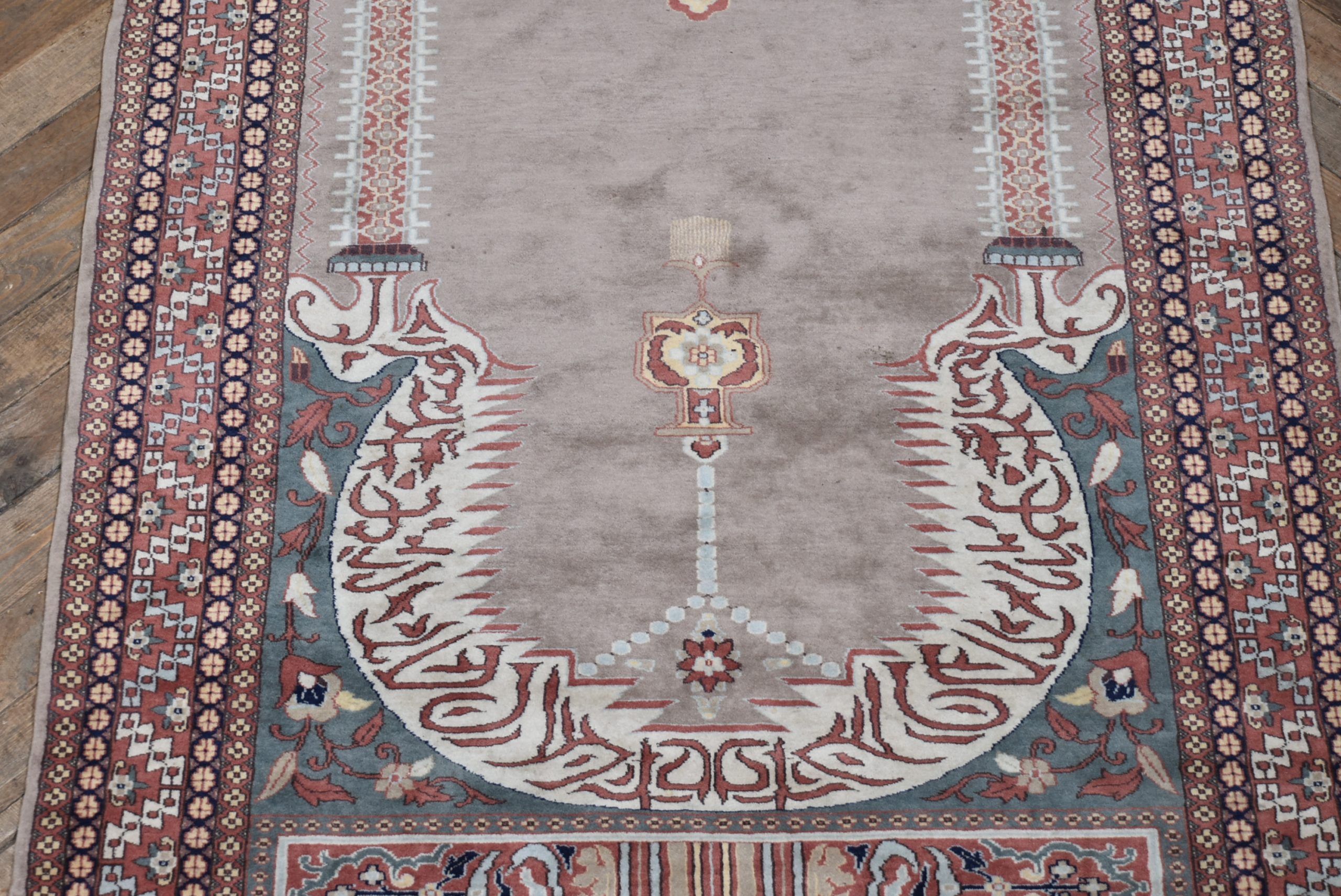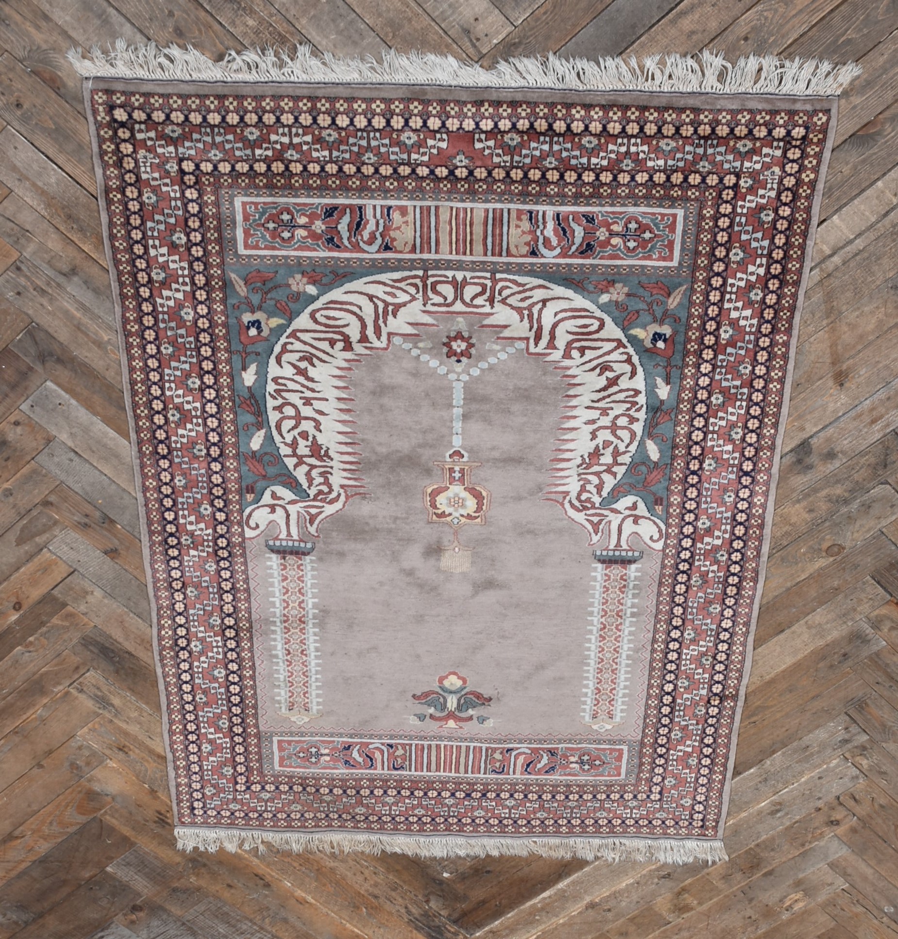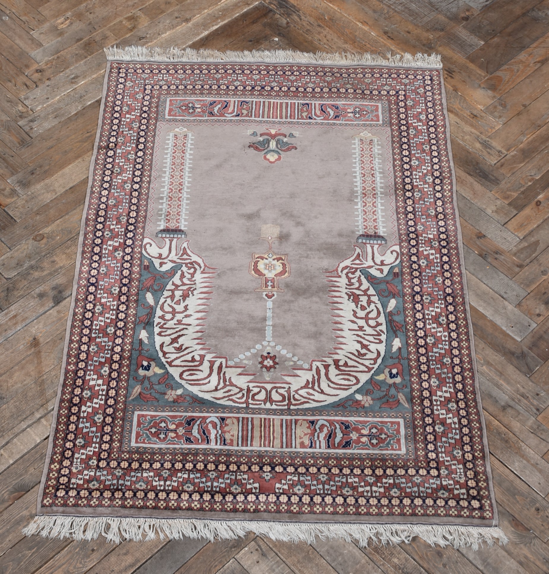 A beautifully woven silk prayer rug featuring a central mihrab arch (prayer niche) design, flanked by slender columns, symbolising spiritual focus and architectural grace. The design is enriched with delicate floral and geometric motifs in a harmonious palette of red, blue, beige, and ivory. Framed by a rhythmic border and finished with hand-knotted fringe. This piece exemplifies the artistry and devotional significance of traditional prayer rugs, making it a meaningful addition to any collection or interior.