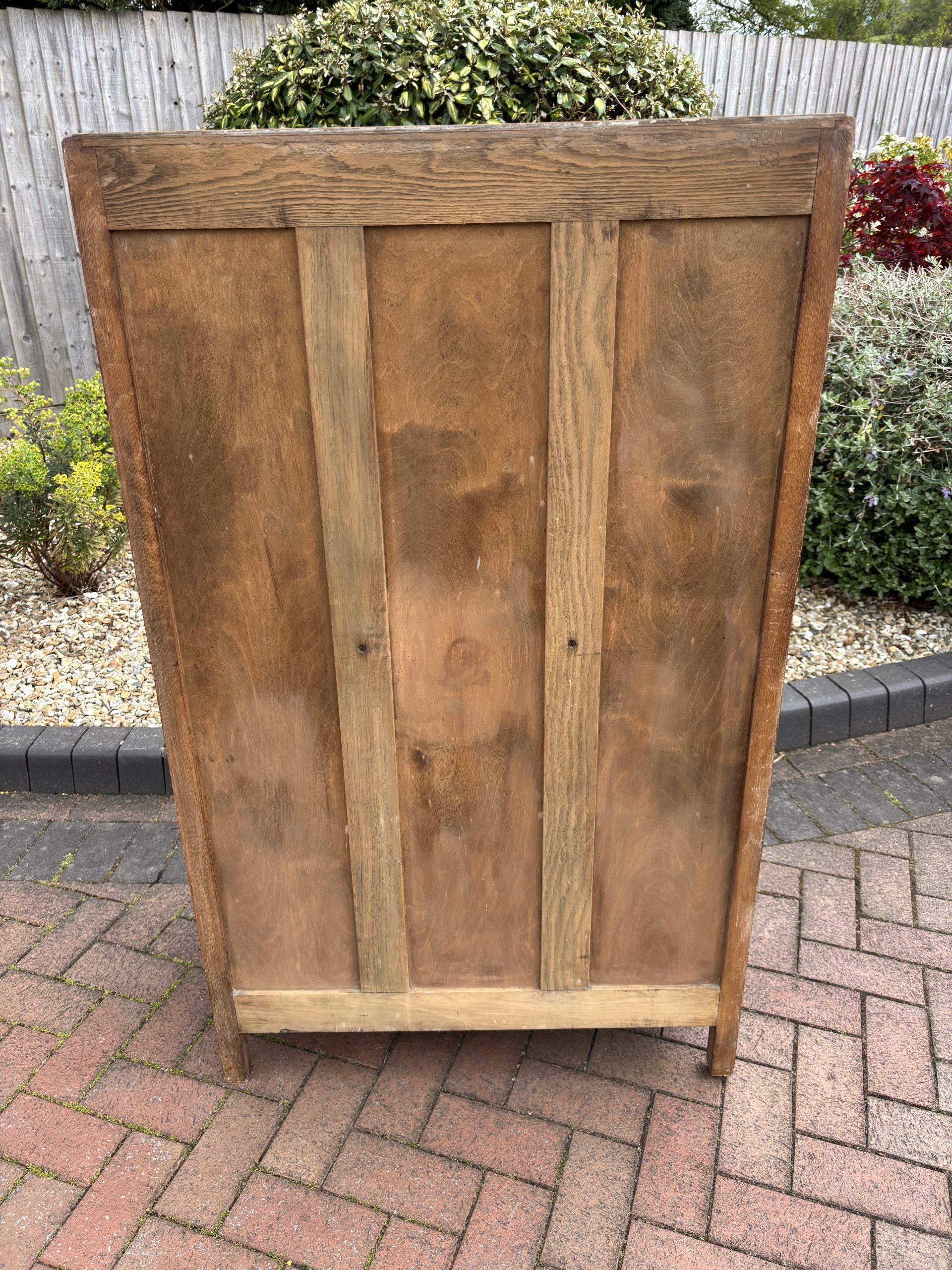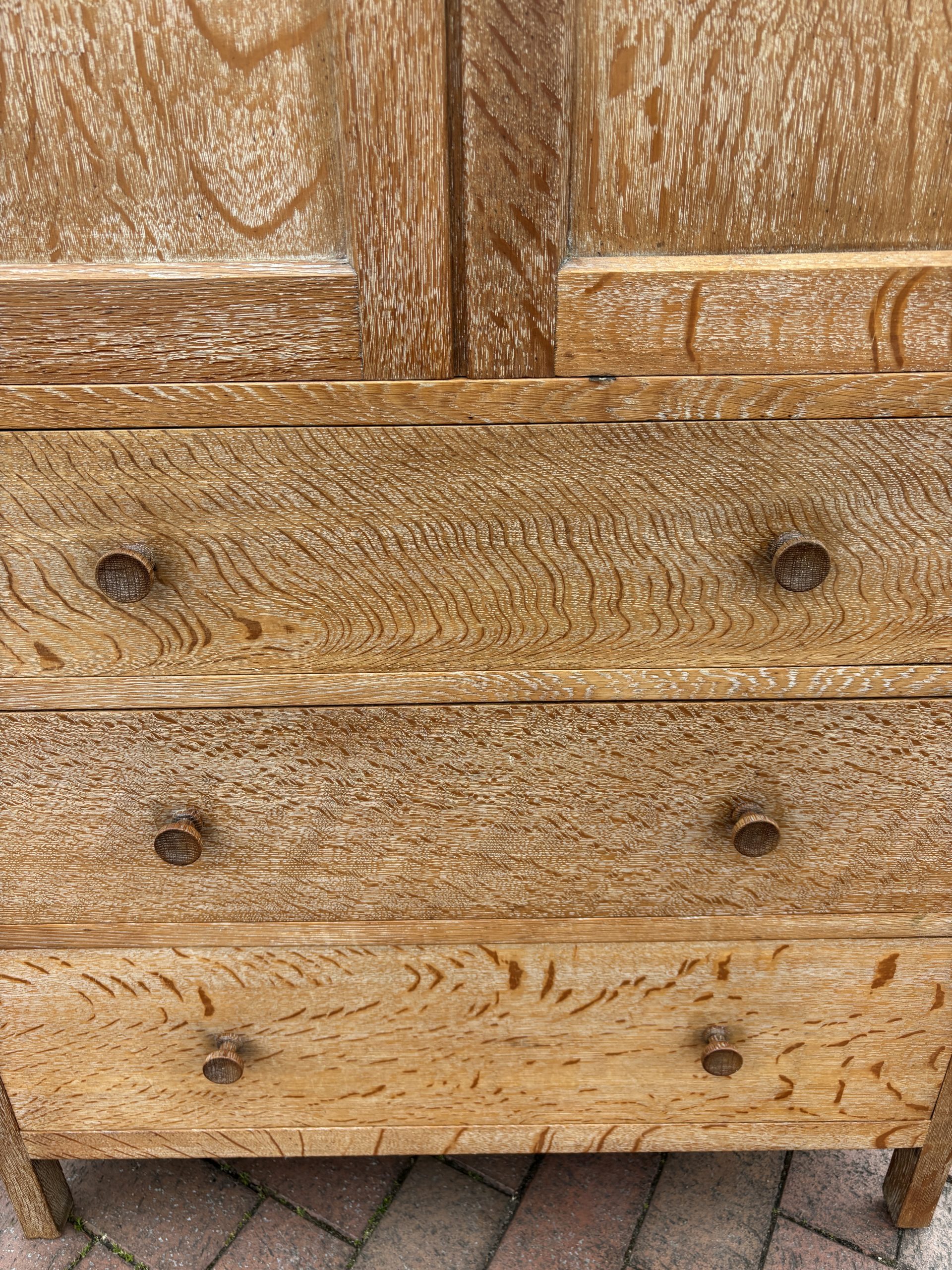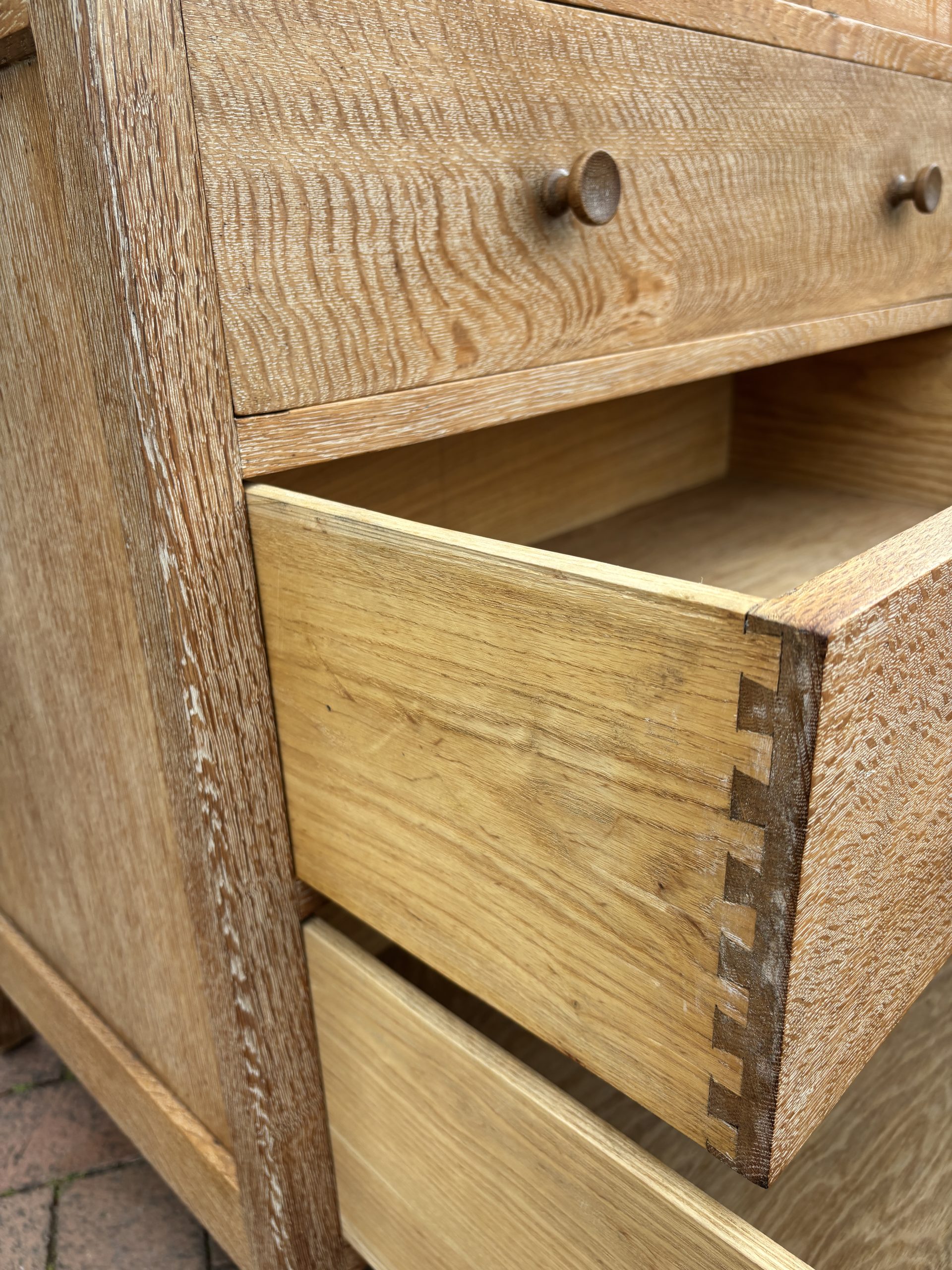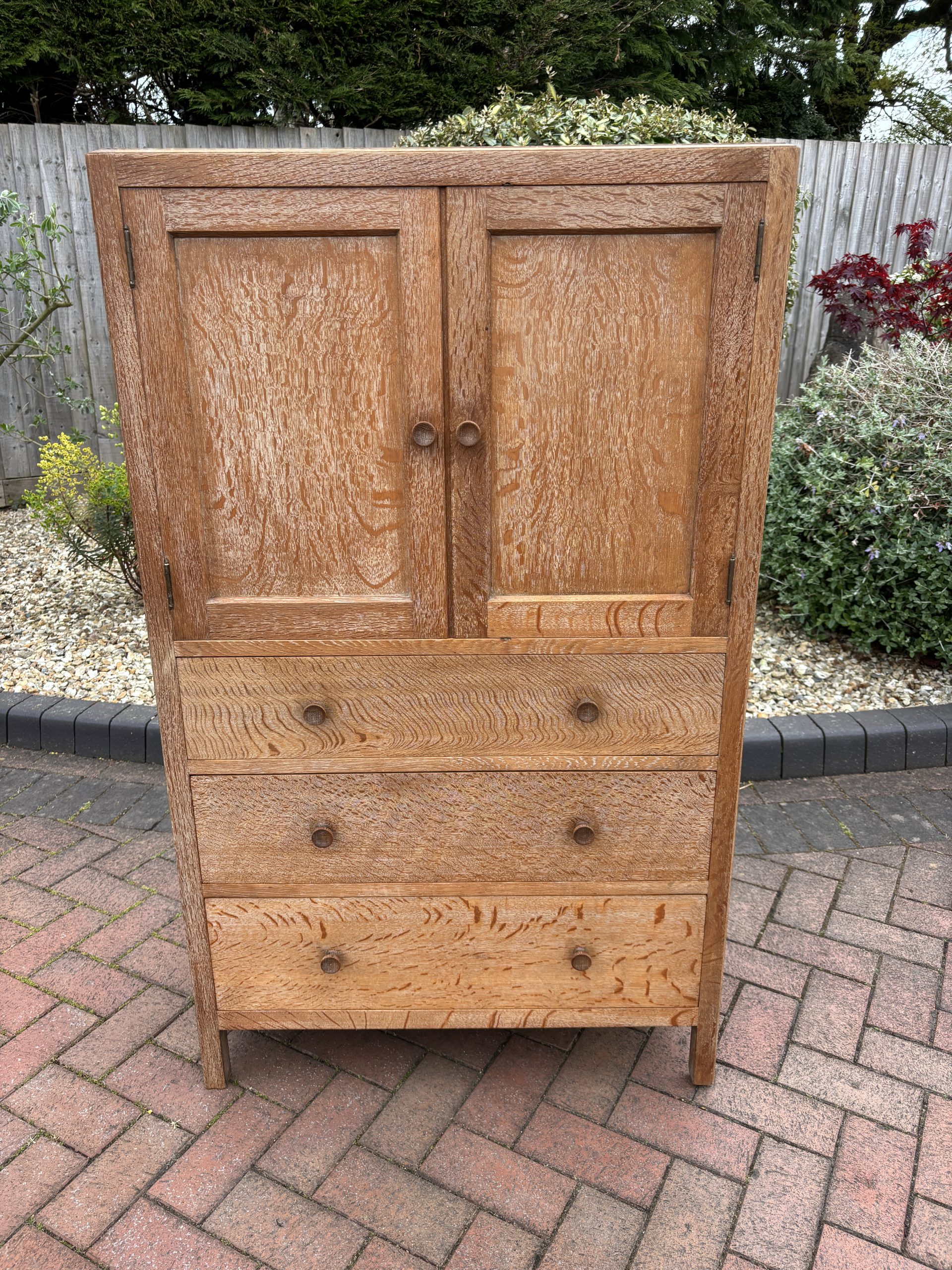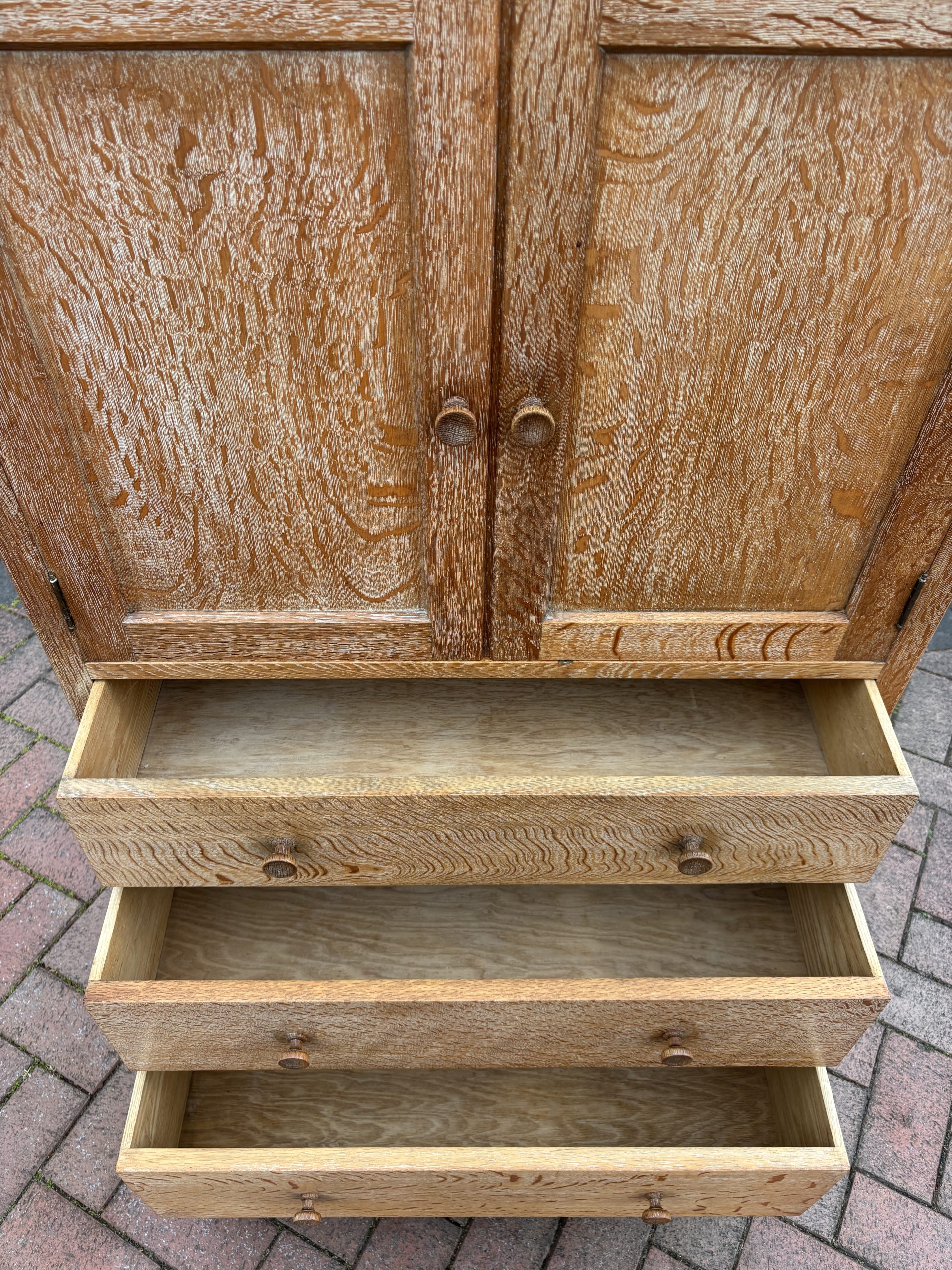 Cotswold School quarter sawn limed oak tallboy cupboard by Heals of London c1930’s. Two panelled doors over three graduating drawers, panelled sides, turned handles and stands on square section feet. Although unlabelled, a recognised Heals tallboy.