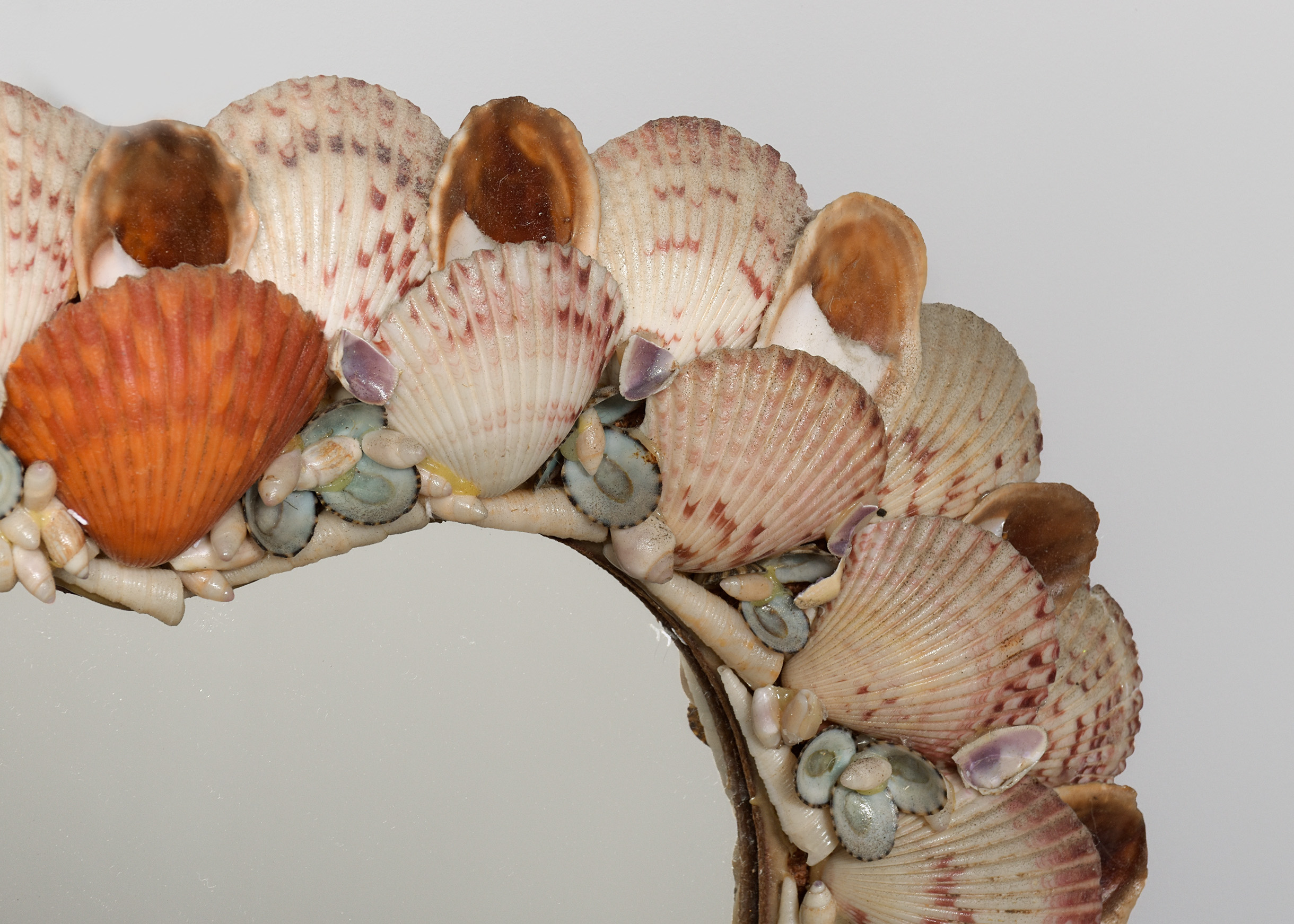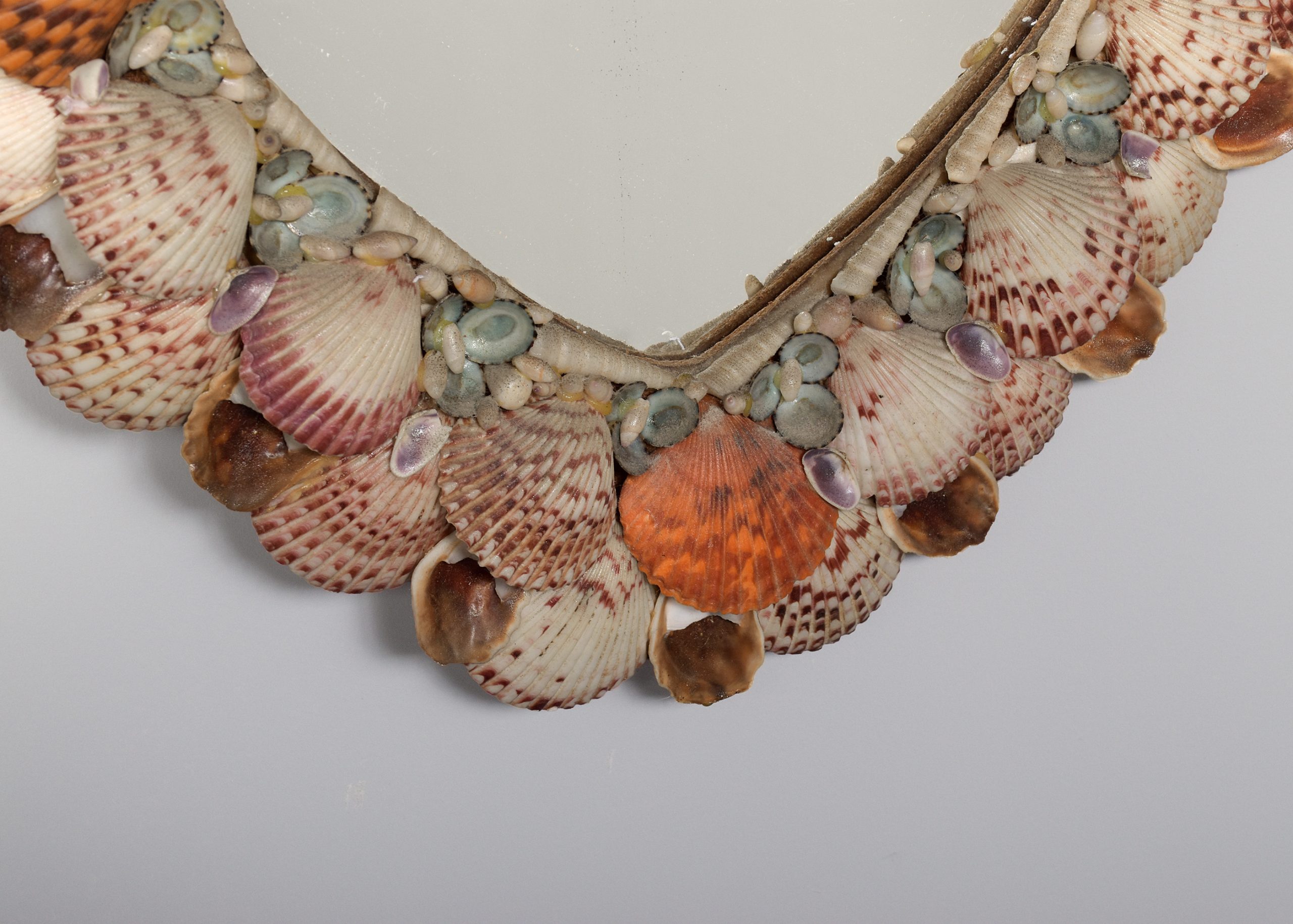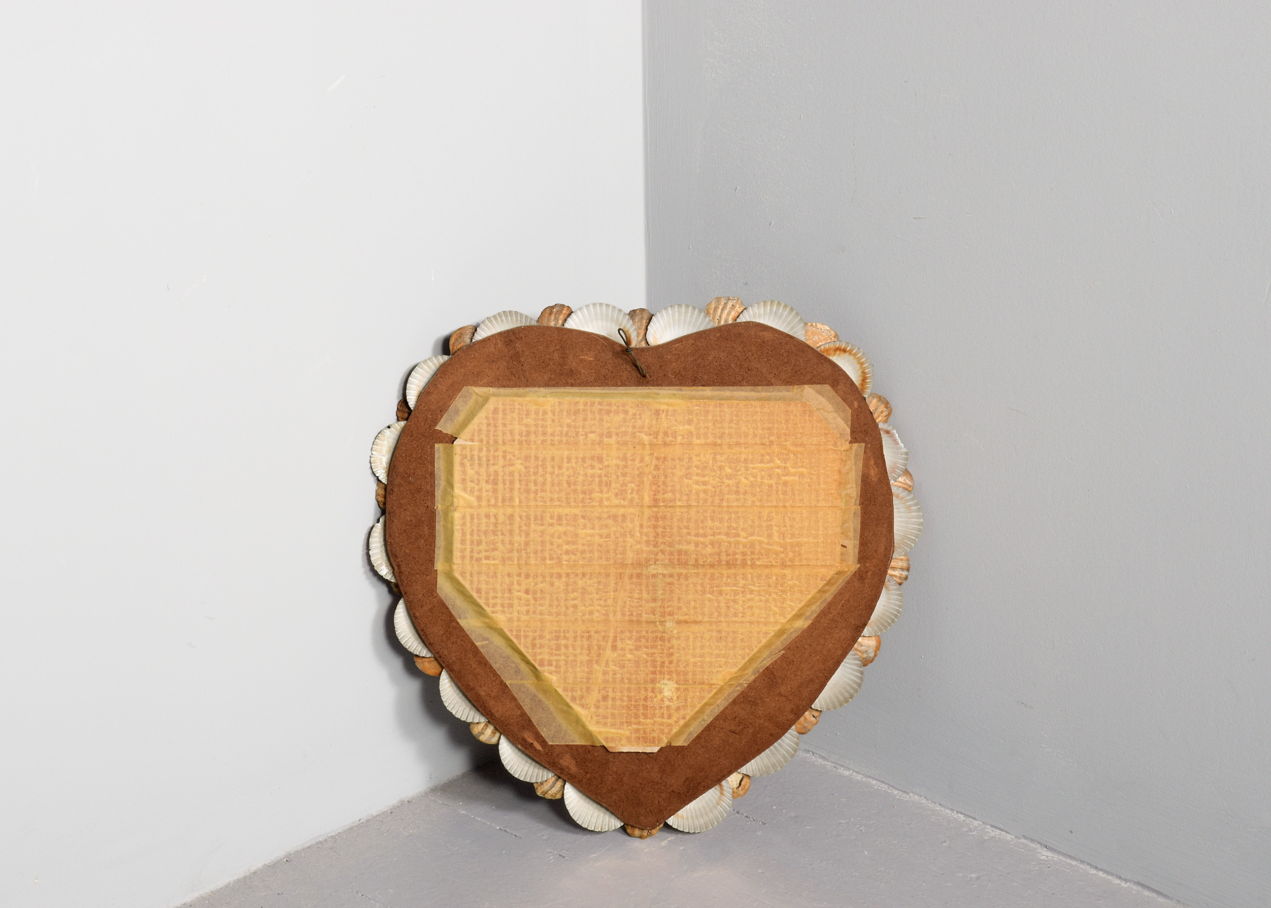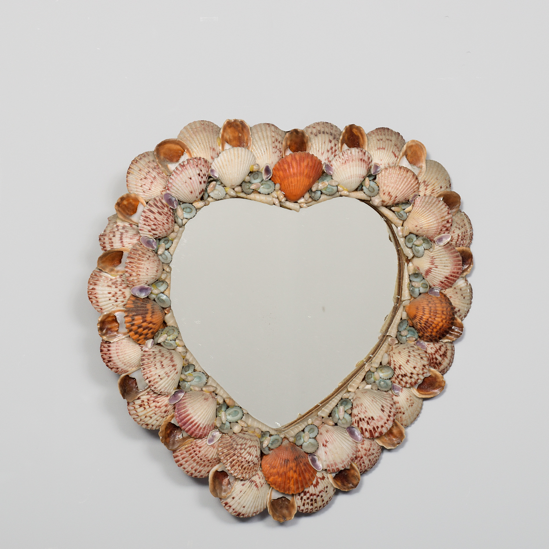 Circa 1990s. A small heart-shaped mirror with various shells of different colours, sizes and species fixed to the heart-shaped frame with mirror.