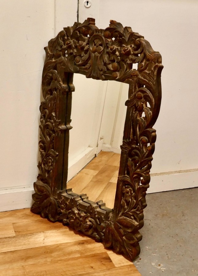 Heavily carved fruitwood mirror. A lovely piece from the east the 6” wide frame is intricately carved with leaves and fruits, the looking glass is new. The painted surface of the carved wood was previously painted this is now rather faded with tones of muted colours and a little gilt decoration The mirror is 36” high and 24” wide. AC137 Manufacture Date : 1900 Materials : Fruitwood