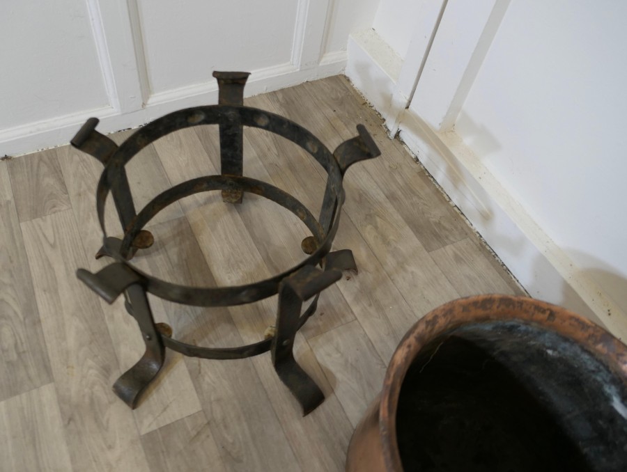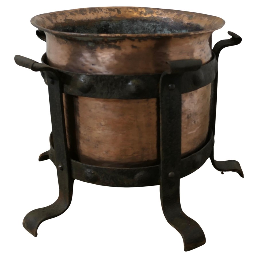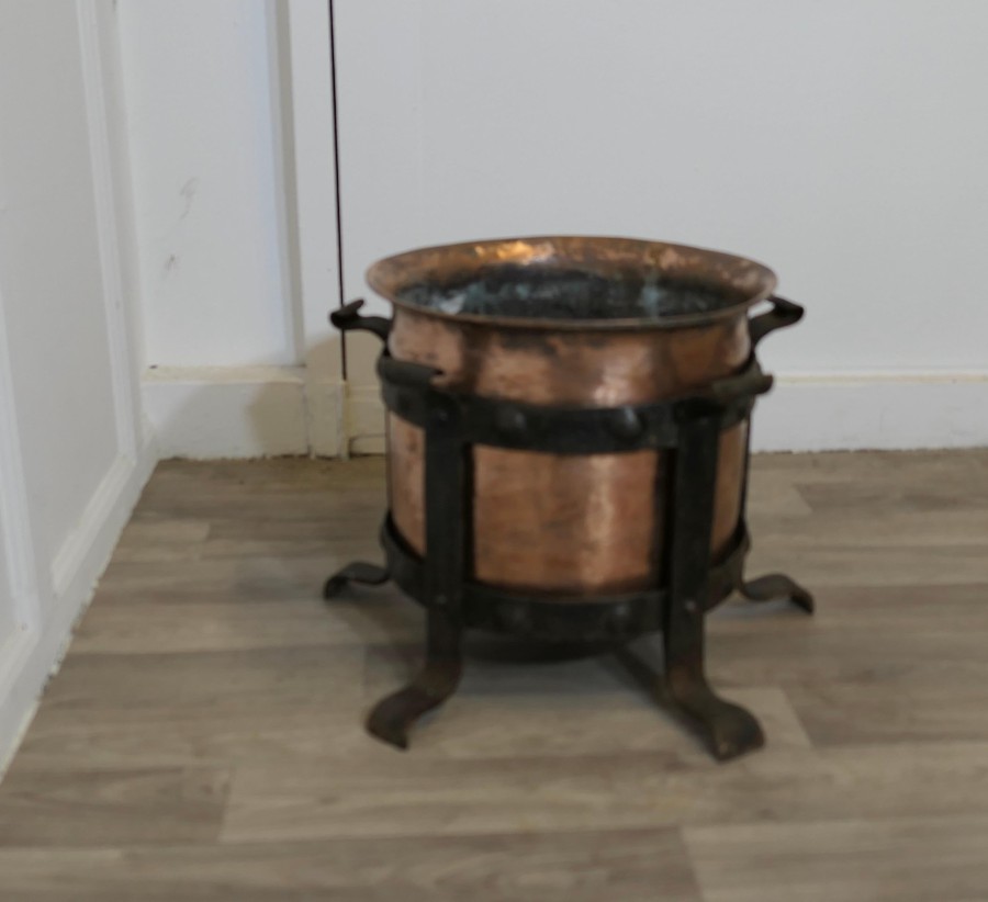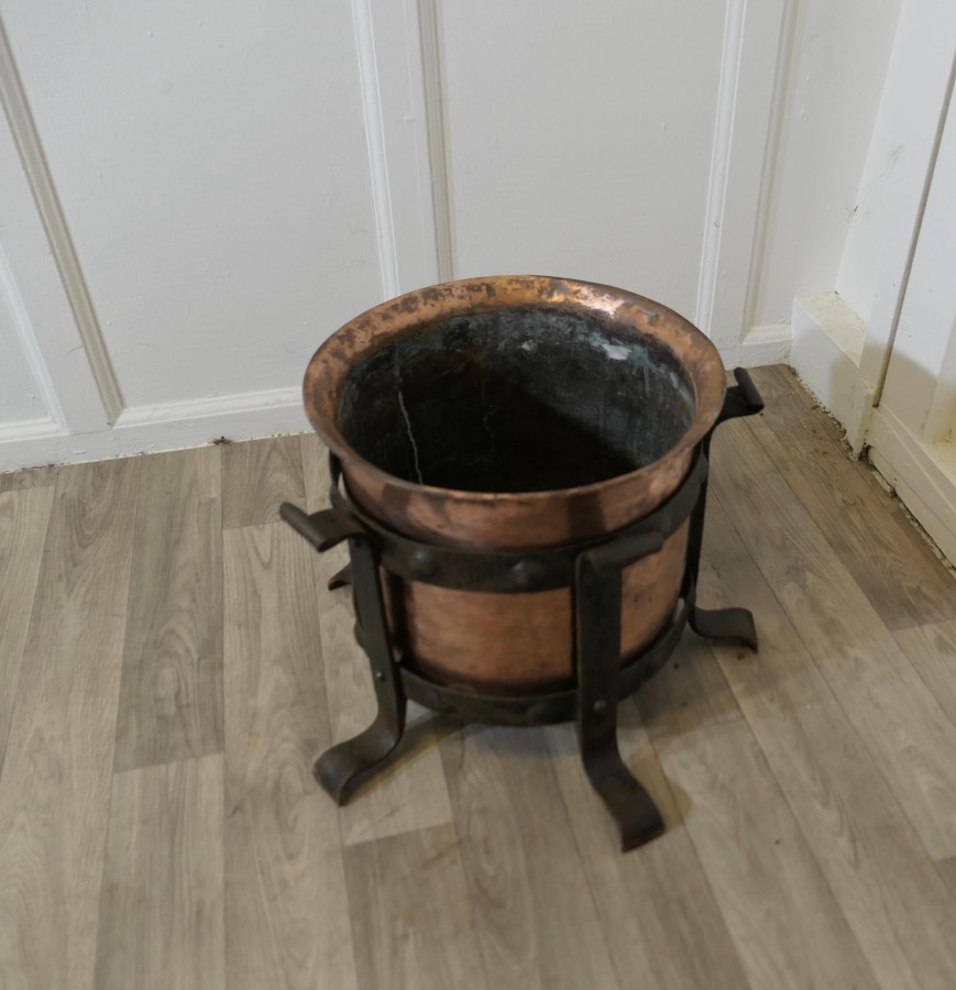 Heavy Arts and Crafts Copper and Wrought Iron Log Bin This is a very good quality copper piece, it is made in hand beaten copper, and set in a wrought iron carrier with a riveted banding, it has 2 handles The Copper would work well as a log basket or as a planter for a large plant The copper pot is in excellent condition, it is 14” high, and 18” in diameter TNG227 Manufacture Date : 1880 Materials : Copper