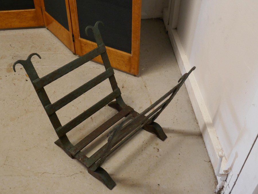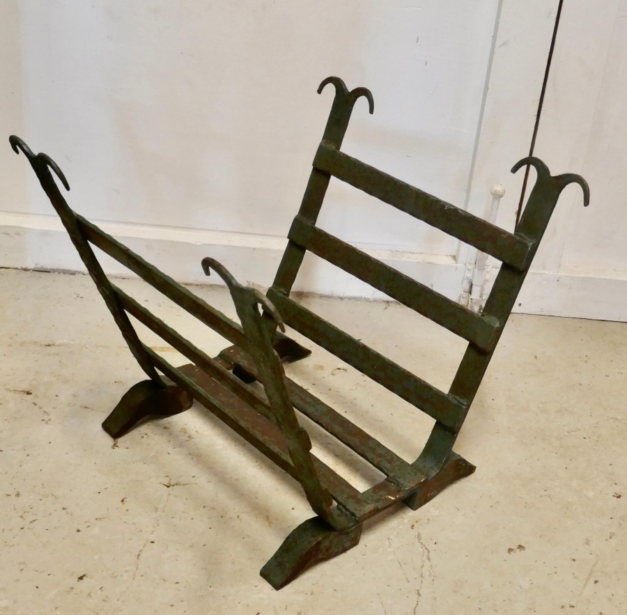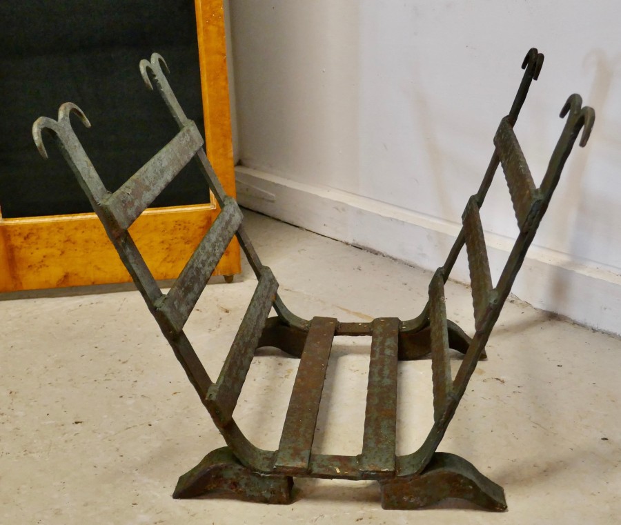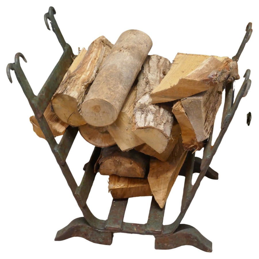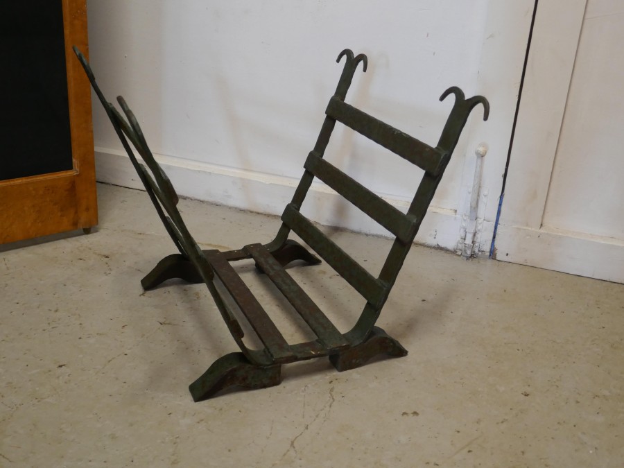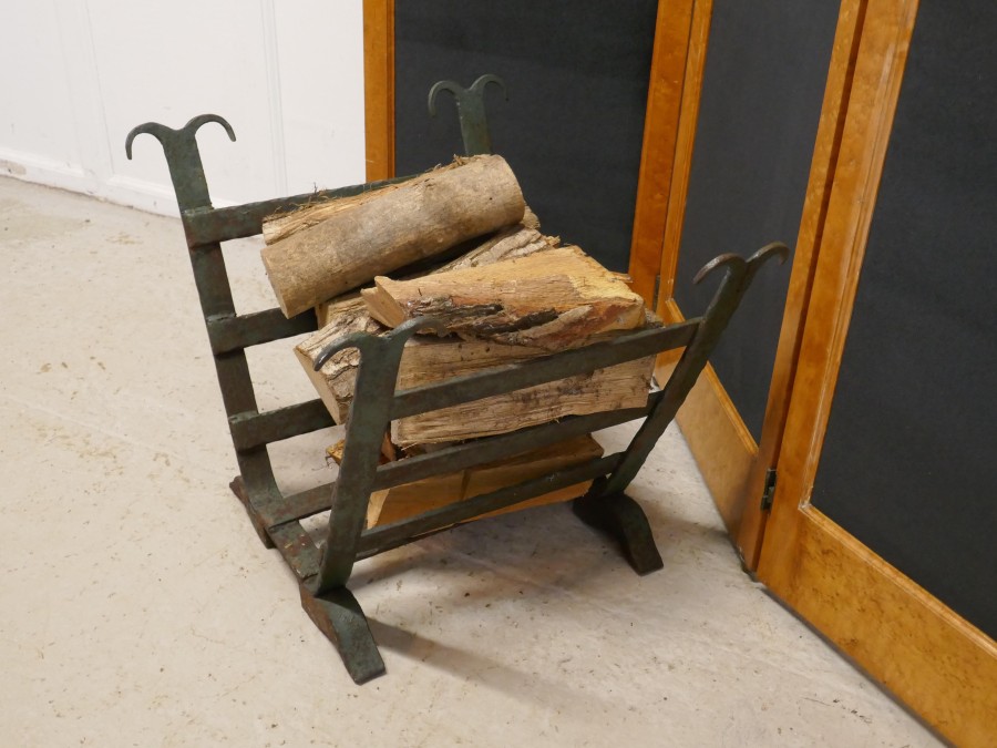 Heavy Blacksmith Made Inglenook Iron Log Carrier This is a sturdy and heavy piece made to hold logs, it has been made in a U shape holder for Fireside Logs Made from iron bars, and at some time in the past has been painted green, this is now mostly worn away leaving a lovely looking very strong piece The stand is 20” tall, 22” deep and 23” wide GB71 Manufacture Date : 19th Century Materials : Iron