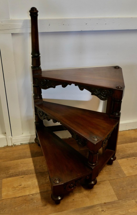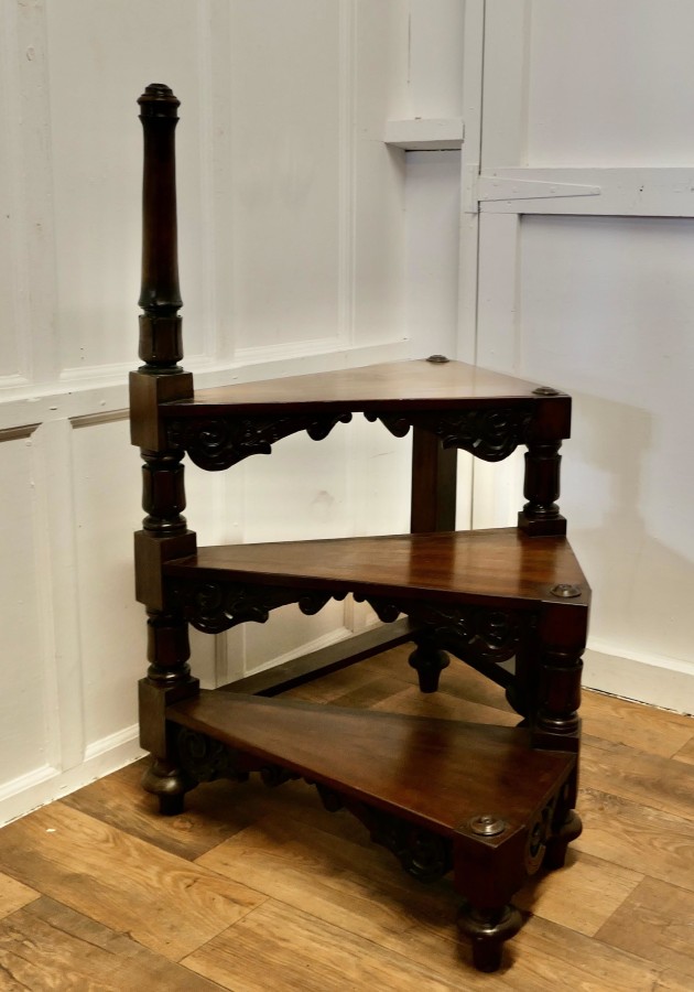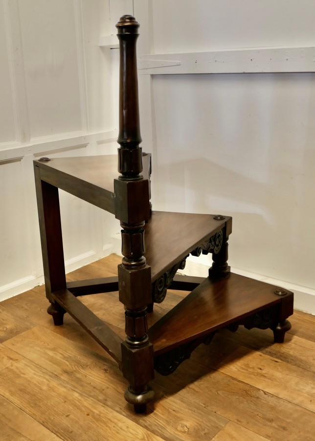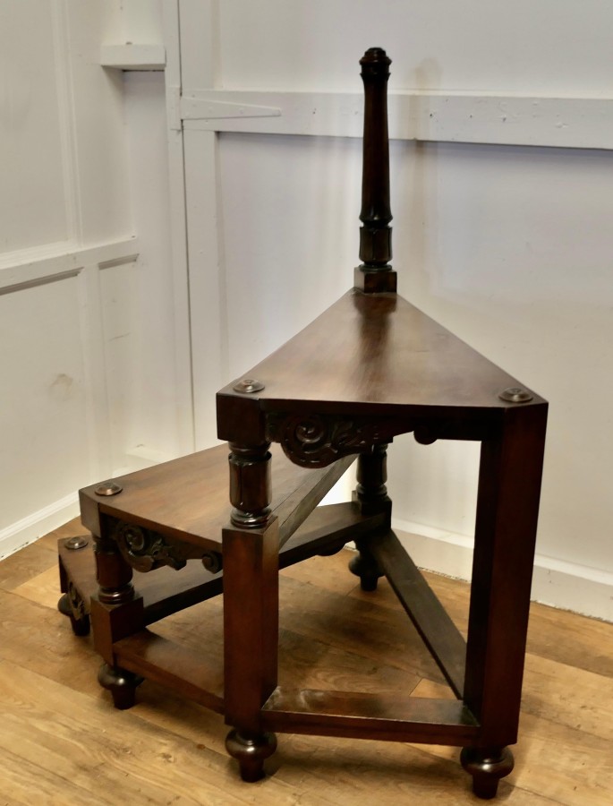 Heavy Victorian Spiral Library Steps with Turned Supports A Great set of Library Steps, the 3 steps are in a spiral formation, they are in good condition, very sturdy and very useful An attractive and unusual piece, the step is 49” high overall and 31” in diameter VY189 Manufacture Date : 19th Century Materials : Walnut
