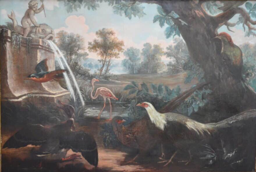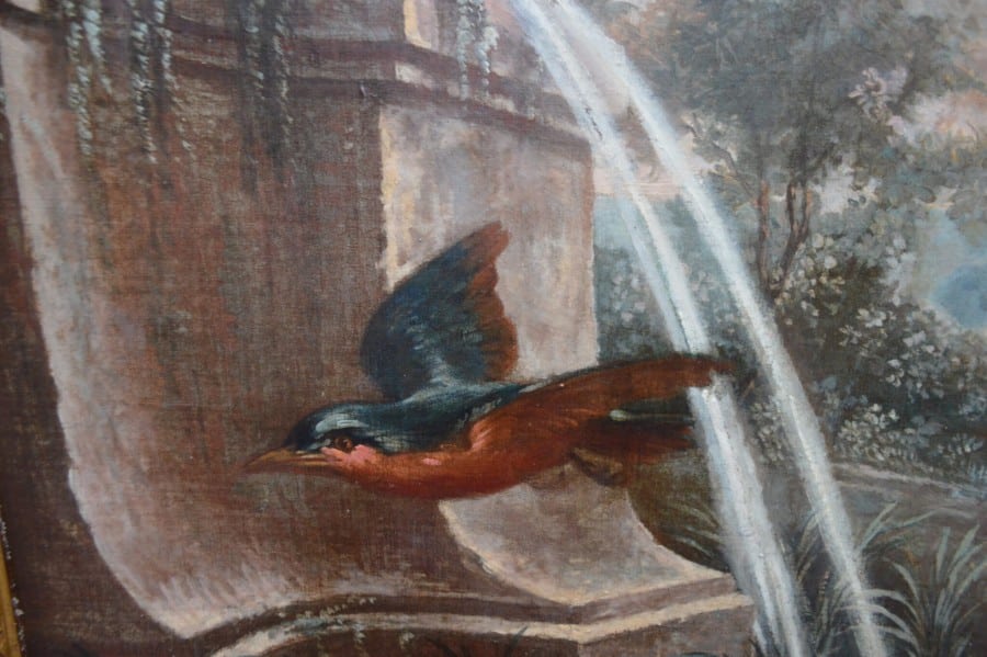 A beautiful large mid 18th century oil on canvas depicting several birds by a cherub fountain. The birds include. A cock Green woodpecker, pr Silver pheasants, Flying cock Kingfisher, Mallard Drake duck and a distant Flamingo In a fine period frame, We will have this repaired, relined cleaned and re varnished before sale. The price below is the finished painting ready to hang.