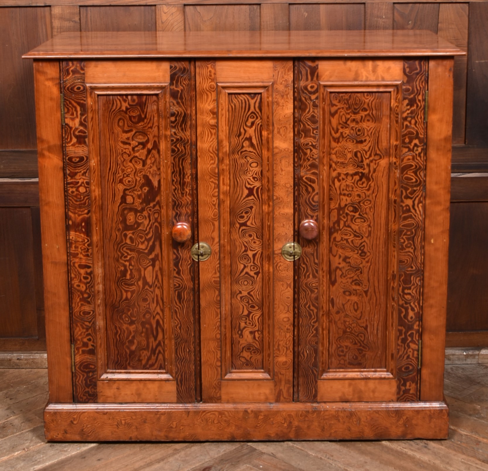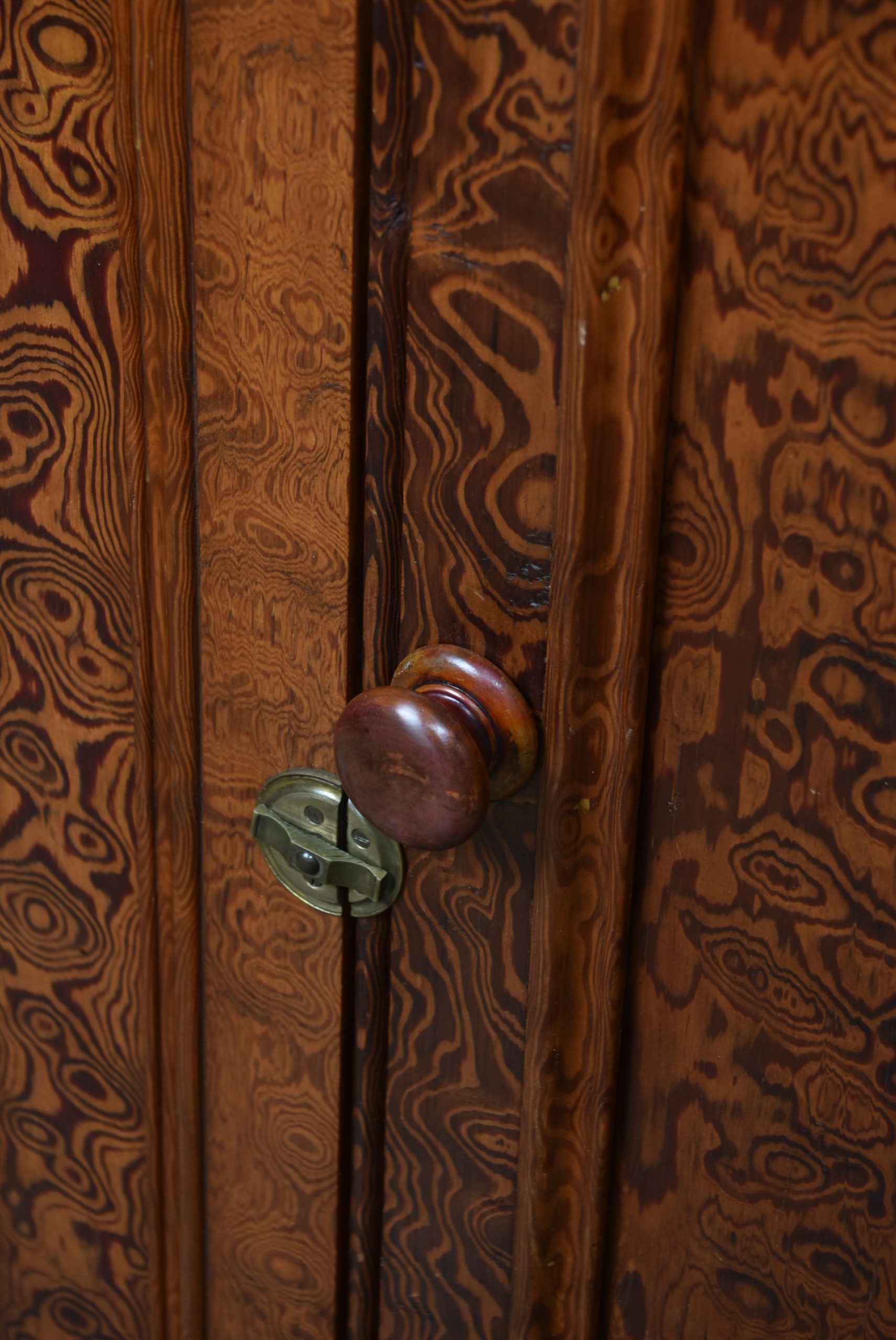 A striking double-door cupboard crafted from richly grained Hungarian ash, presented in excellent antique condition. The top and sides are formed from beautifully figured planks, while the doors and central section each feature three vertical panels framed with subtle mouldings that highlight the natural drama of the timber. Retaining its original turned wooden knobs and a brass swing bar lock, the cupboard opens to reveal a shelved interior—ideal for storing linens, tableware, or household essentials. Its solid plinth base provides both stability and visual weight, and the well-balanced proportions make it equally suited to decorative display or practical use. As with all true antiques, there are minor imperfections consistent with age, but this piece remains a fine example of Central European craftsmanship—combining utility, character, and understated elegance.