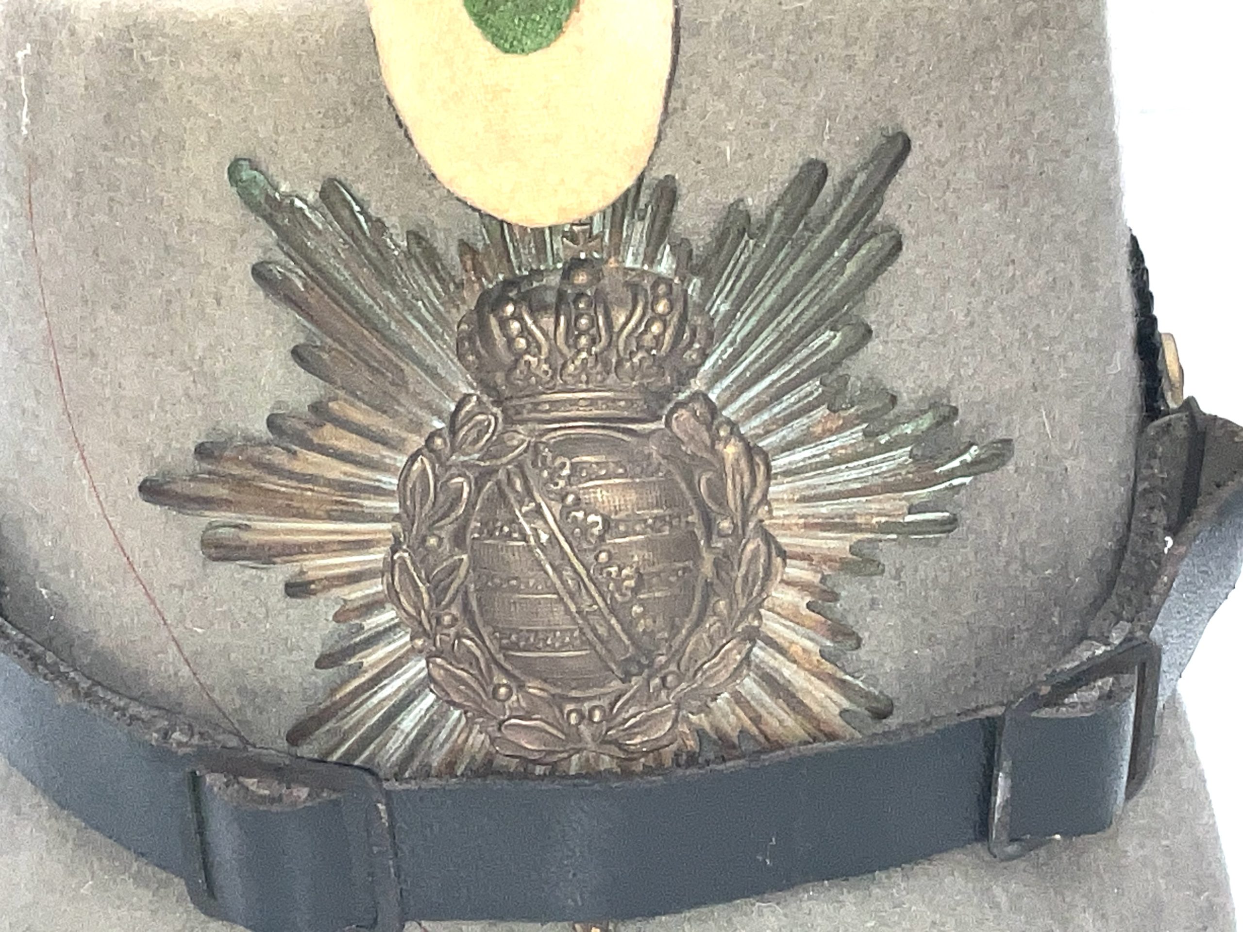 Jäger Shako, likely an officer’s model from the Kingdom of Saxony. Superb complete helmet showing stains, condition is good a rare helmet will be a great addition to one’s collection and definitely a future investment height 19 cm length 16 cm depth 23 cm, offering free delivery Worldwide reference BBS. Tel: +44 7505 165 843 We accept online payments for all our items listed: Bank transfer cash on collection or if wishing over the phone using your debit or credit cards, also doing layby payments plan, or email giving your address details & contact number and we shall send you your items invoice to make payment with your card. Send your request to – john.strong2@gmail.com