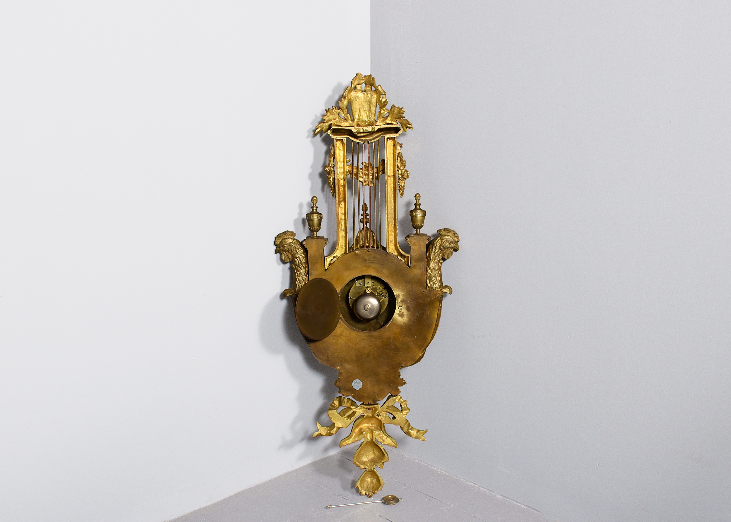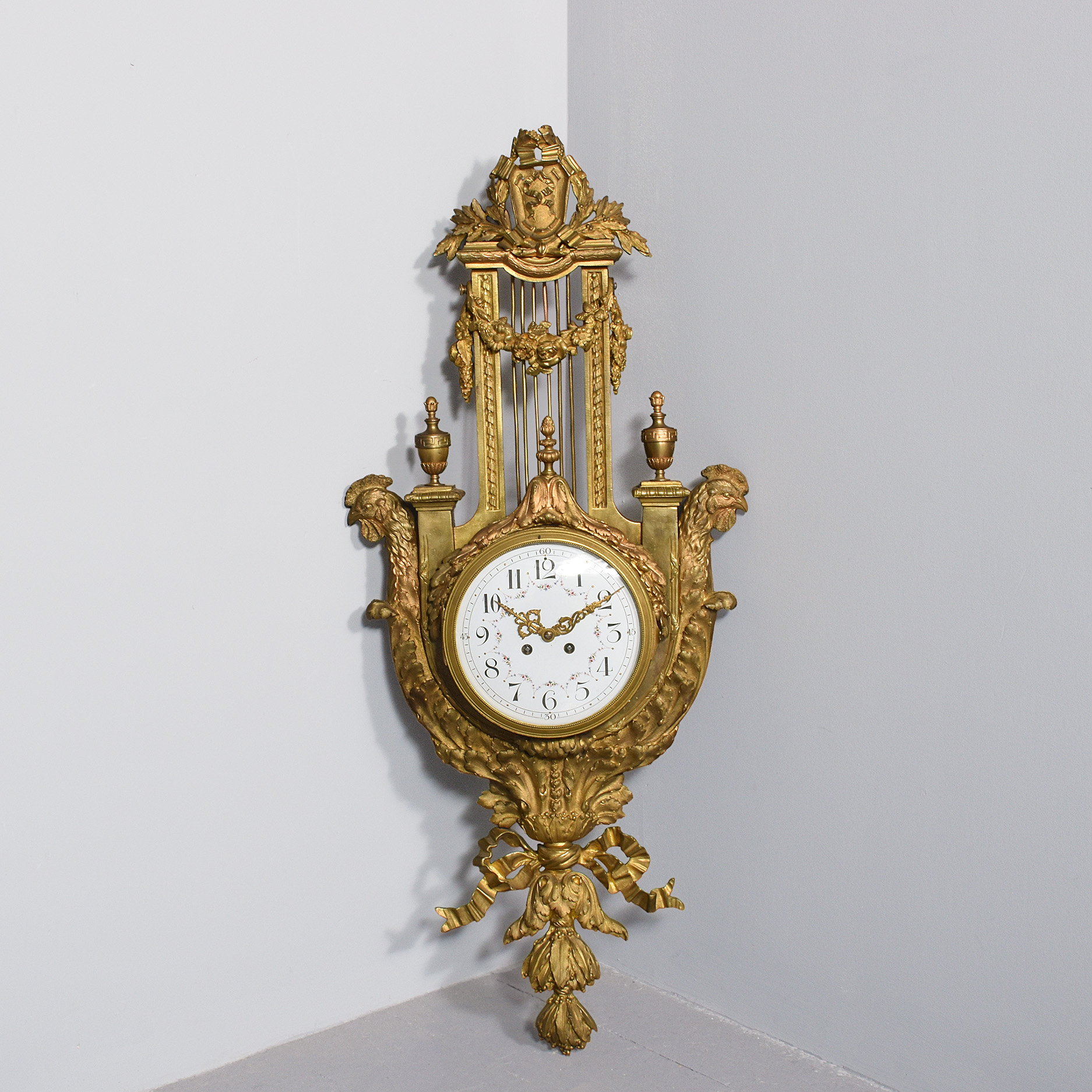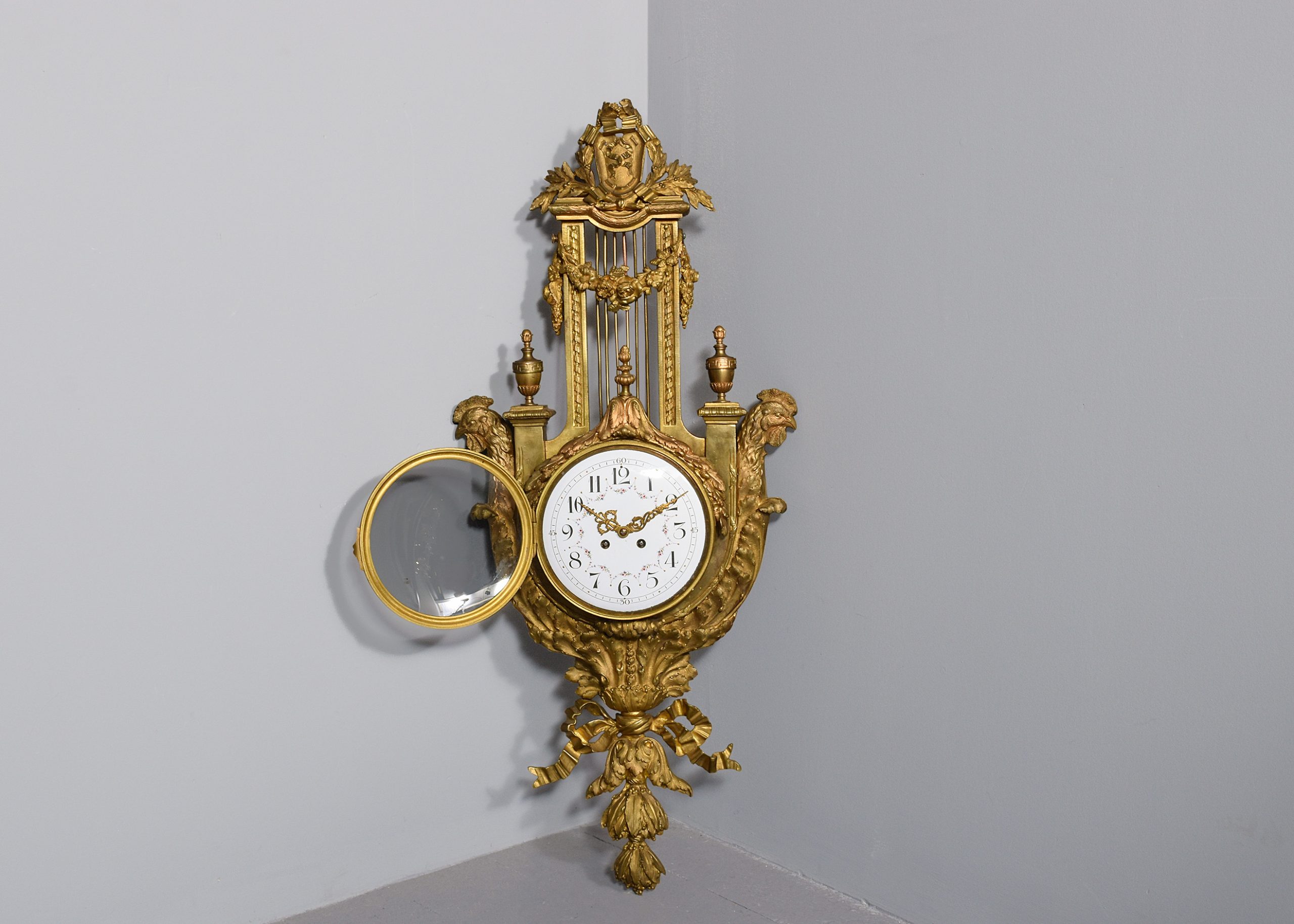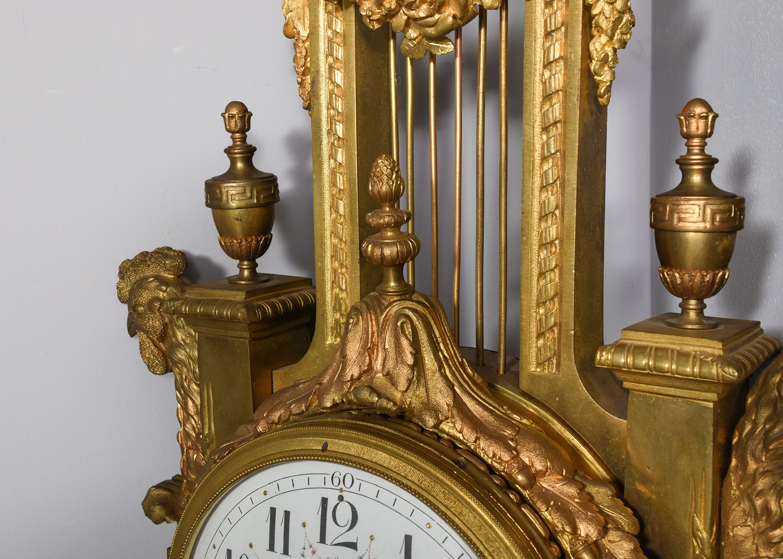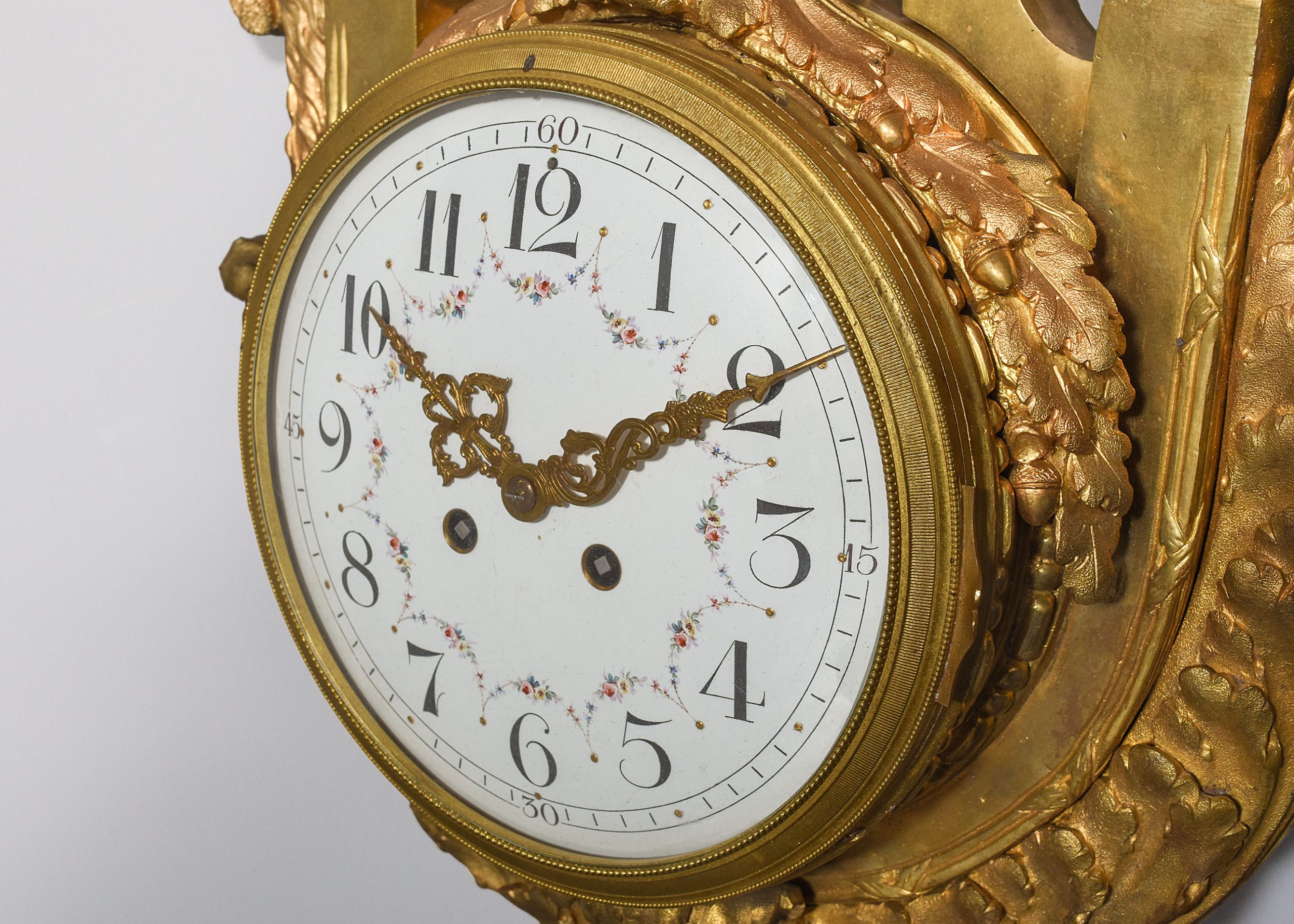 Circa 1870. A large and impressive French cast brass domed face wall clock, surmounted by a cartouche with a large section beneath including metal rods, swags and foliate casting, the circular domed face with Arabic numerals and gilded hands with flower painting between each of the numbers, with a convex glass in a gilded bezel, the sides with a pair of cast brass and gilded copper head’s with pillars and urns and the foliate casting continuing down towards the base which finishes with a ribbon and downward facing foliate casting. The clock has recently been serviced and is working.