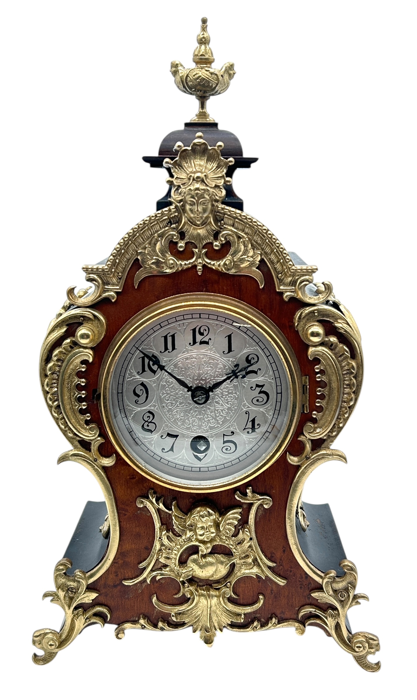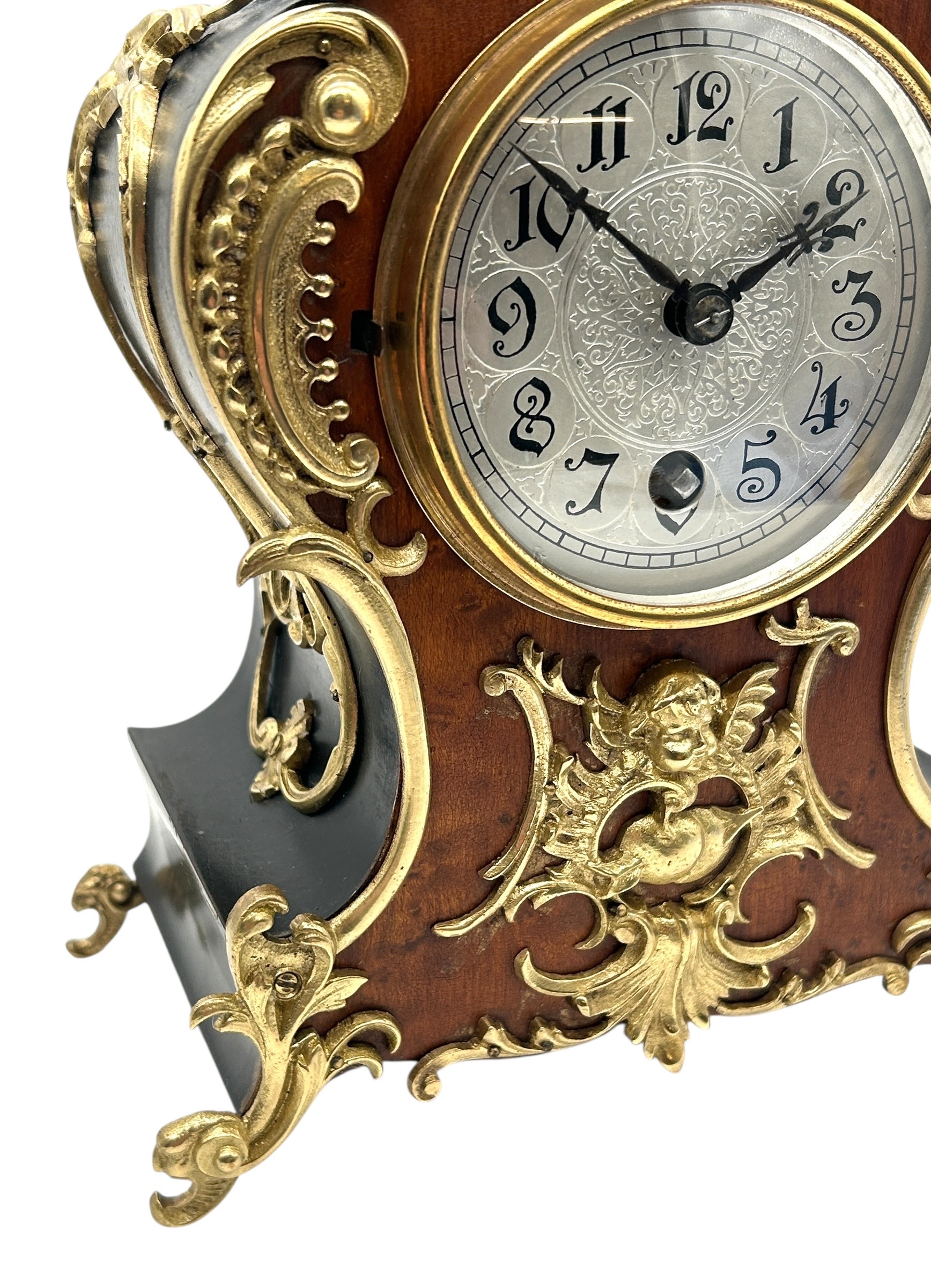 This German walnut and ormolu mantel clock features an 8-day movement with anchor escapement. Recently serviced at Vintage Clocks, it is in excellent condition and fully functional. Please review the photos and visit my YouTube channel for a video demonstration.