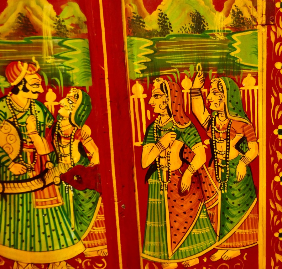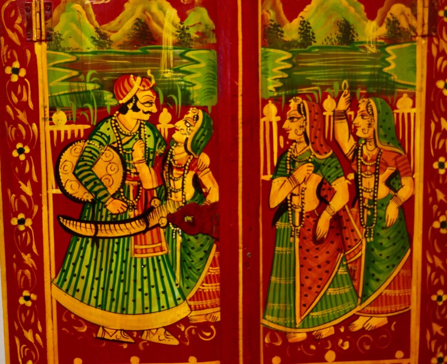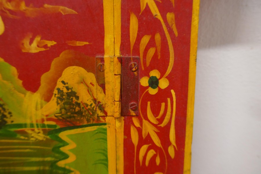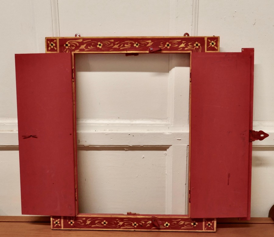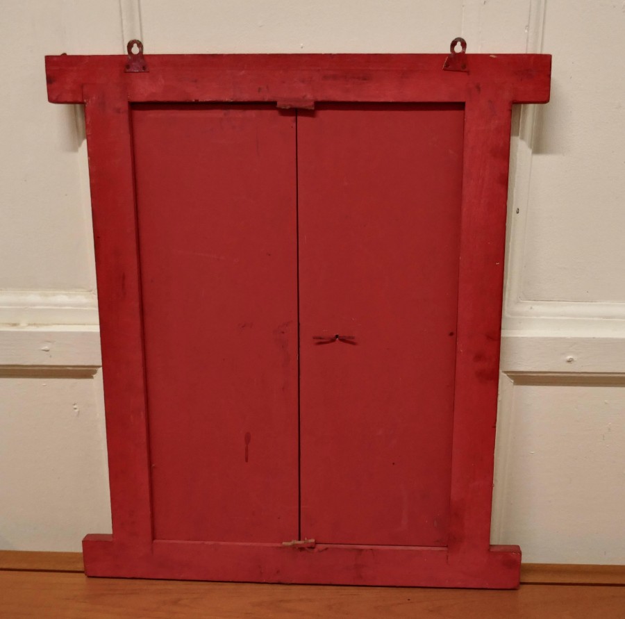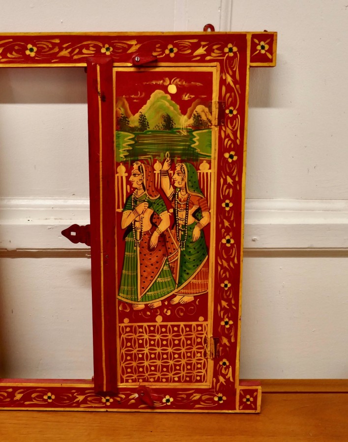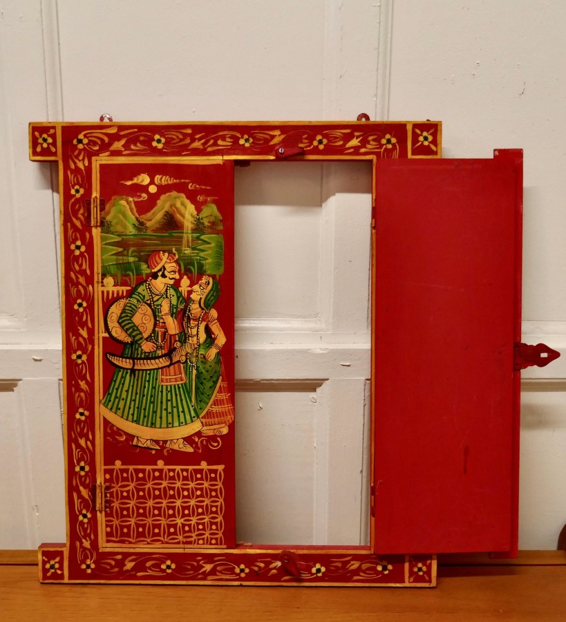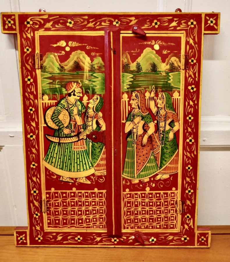 Indian miniature doors, Folk Art shutters These Beautiful framed doors are beautifully and brightly hand painted with Indian Characters in traditional dress. The pair of doors have their original metal hinges and wooden closers. This is a most decorative and colourful item that would make a delightful and very characterful wall hanging perhaps to put a mirror or Menu Board inside. The frame is 24” tall, 21” wide and 2” deep AC183. Manufacture Date : 19th Century Materials : Paint