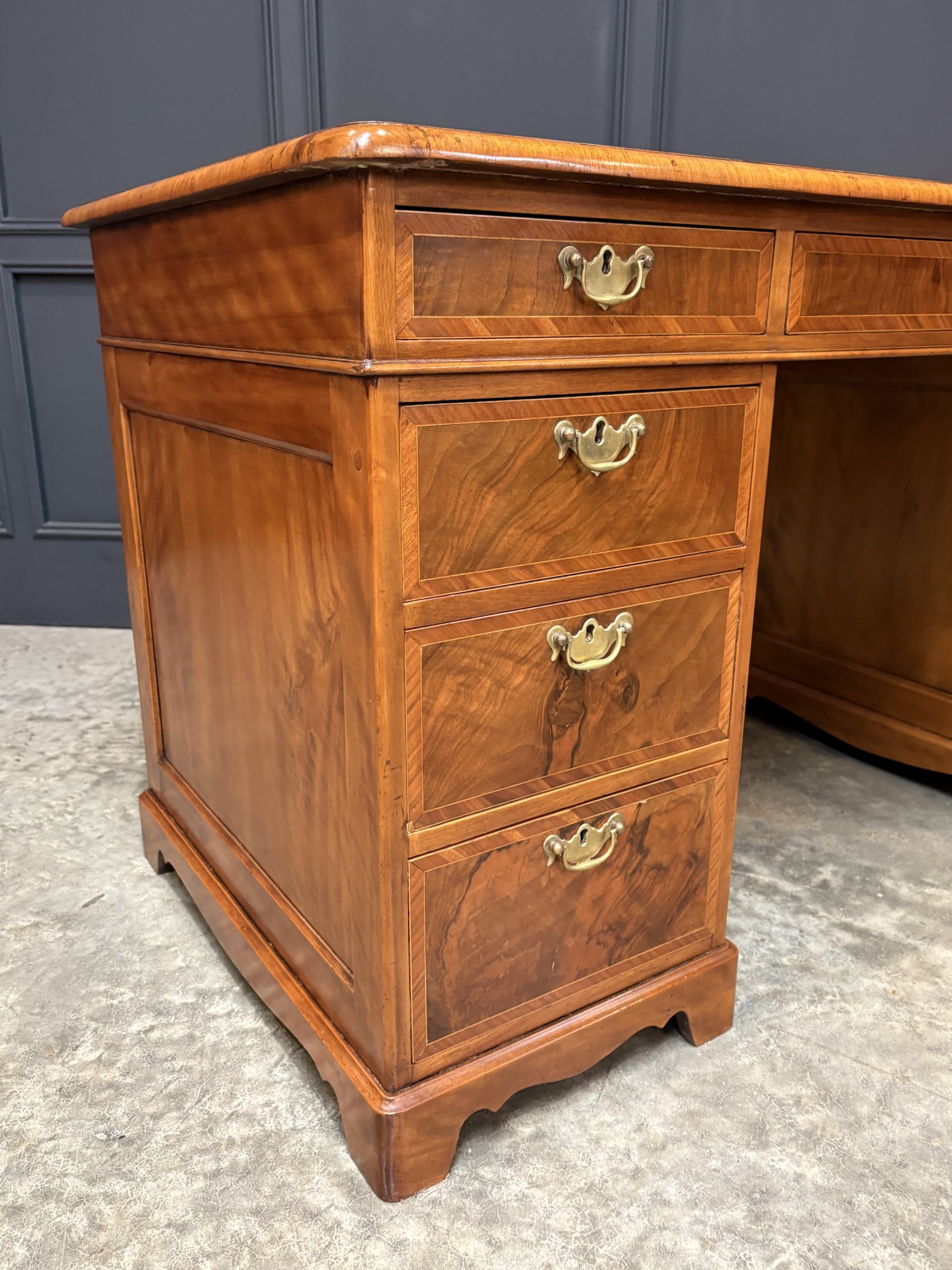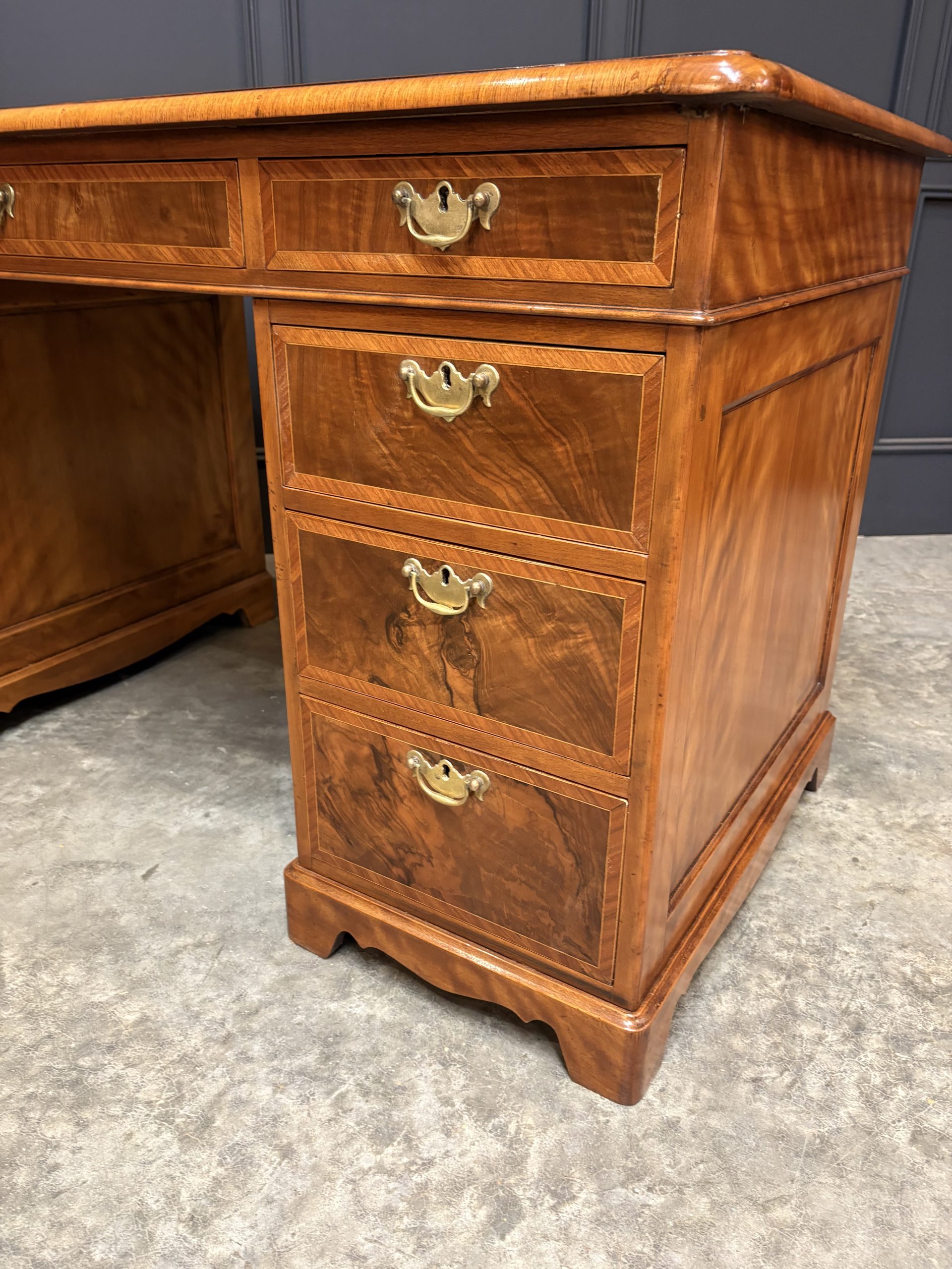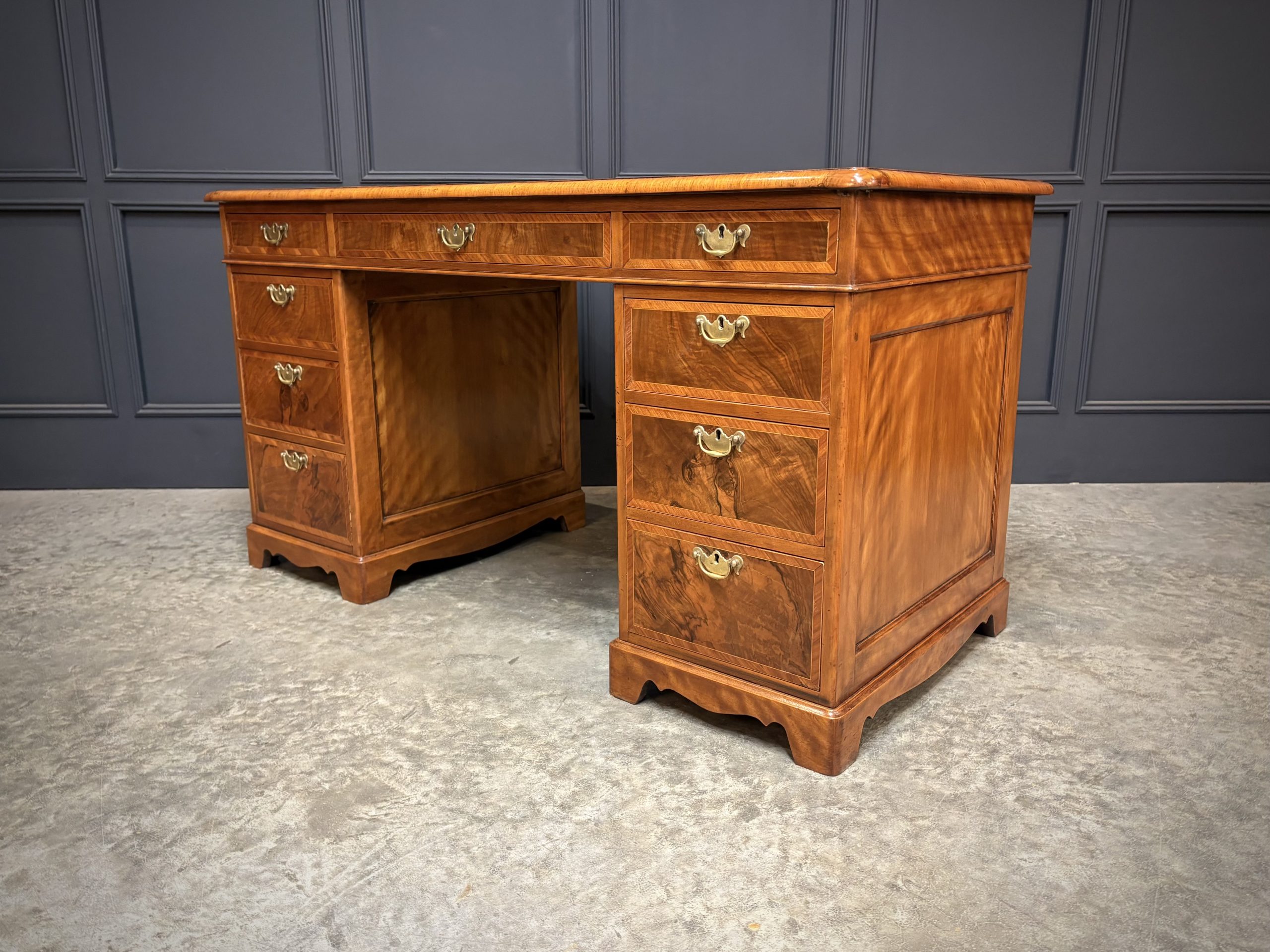 This elegant desk features nine drawers of solid oak construction with dovetail joints, all retaining their original brass handles. The drawer fronts are beautifully cross banded with kingwood and boxwood string inlaid.