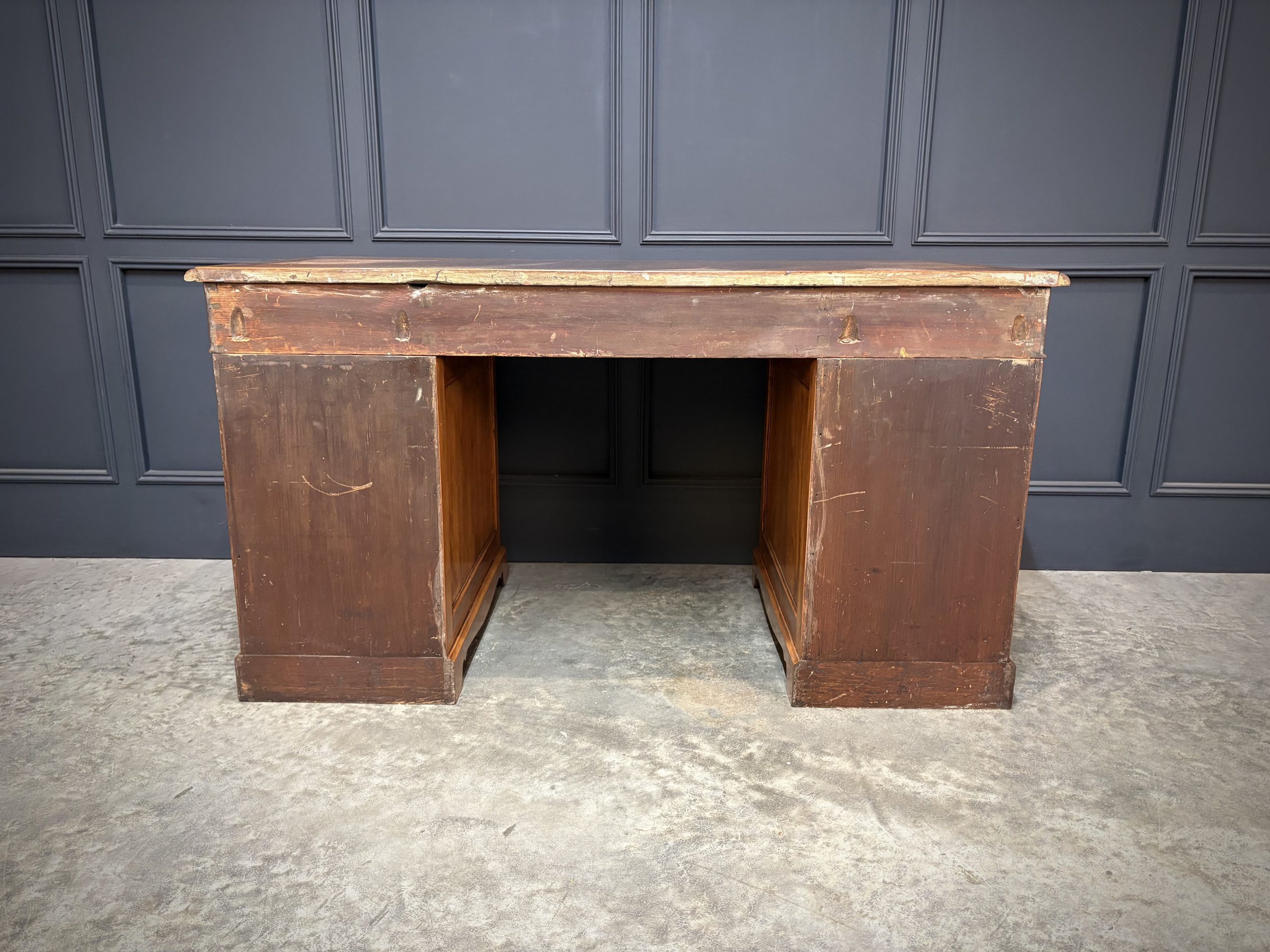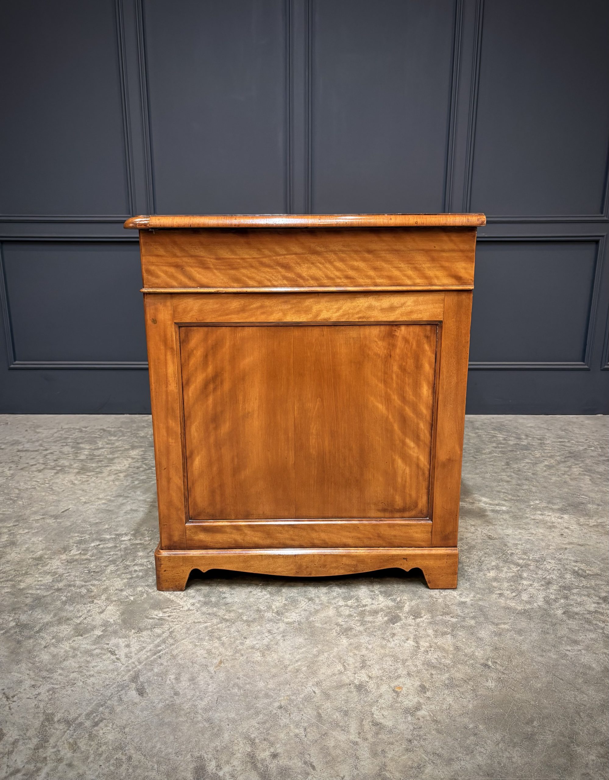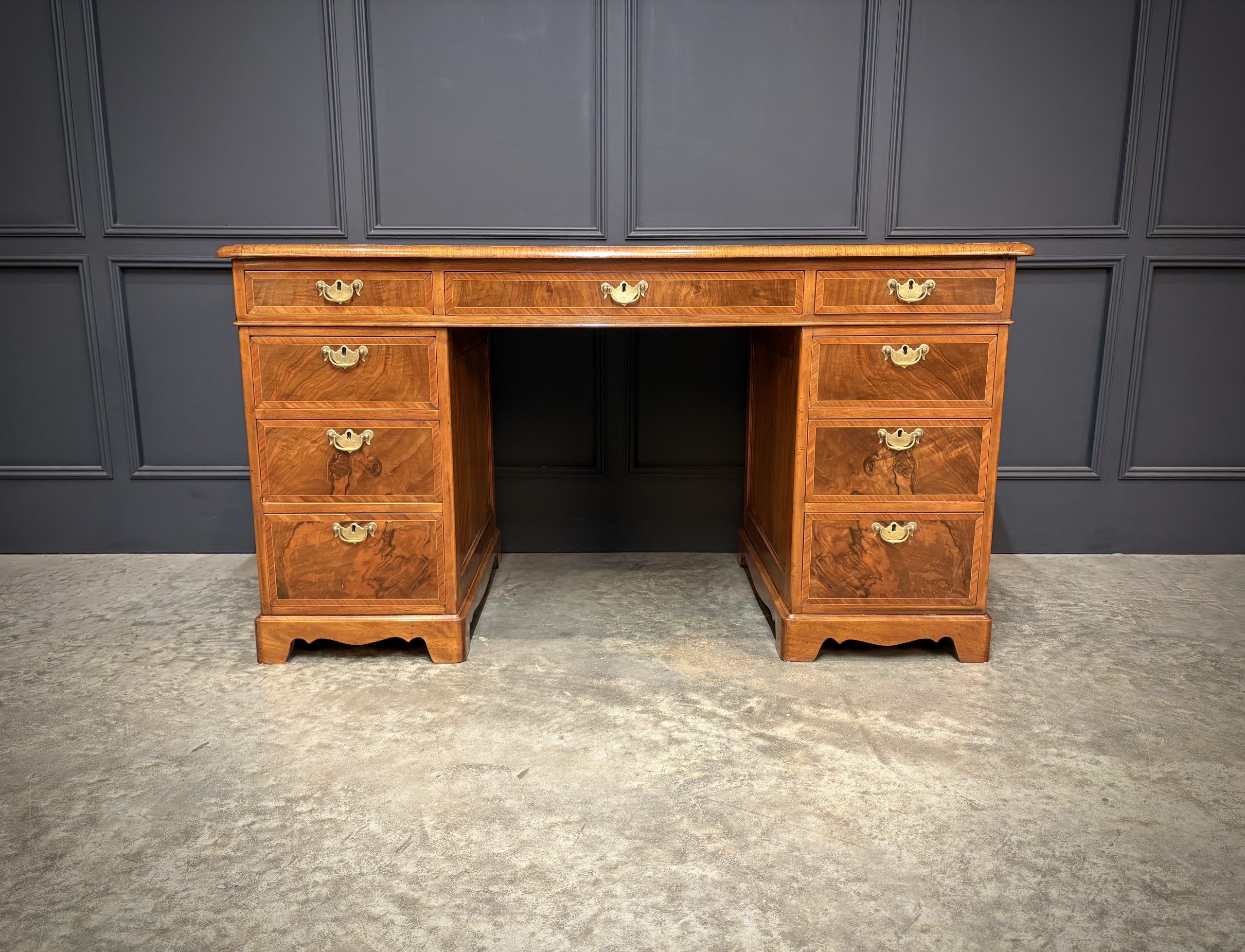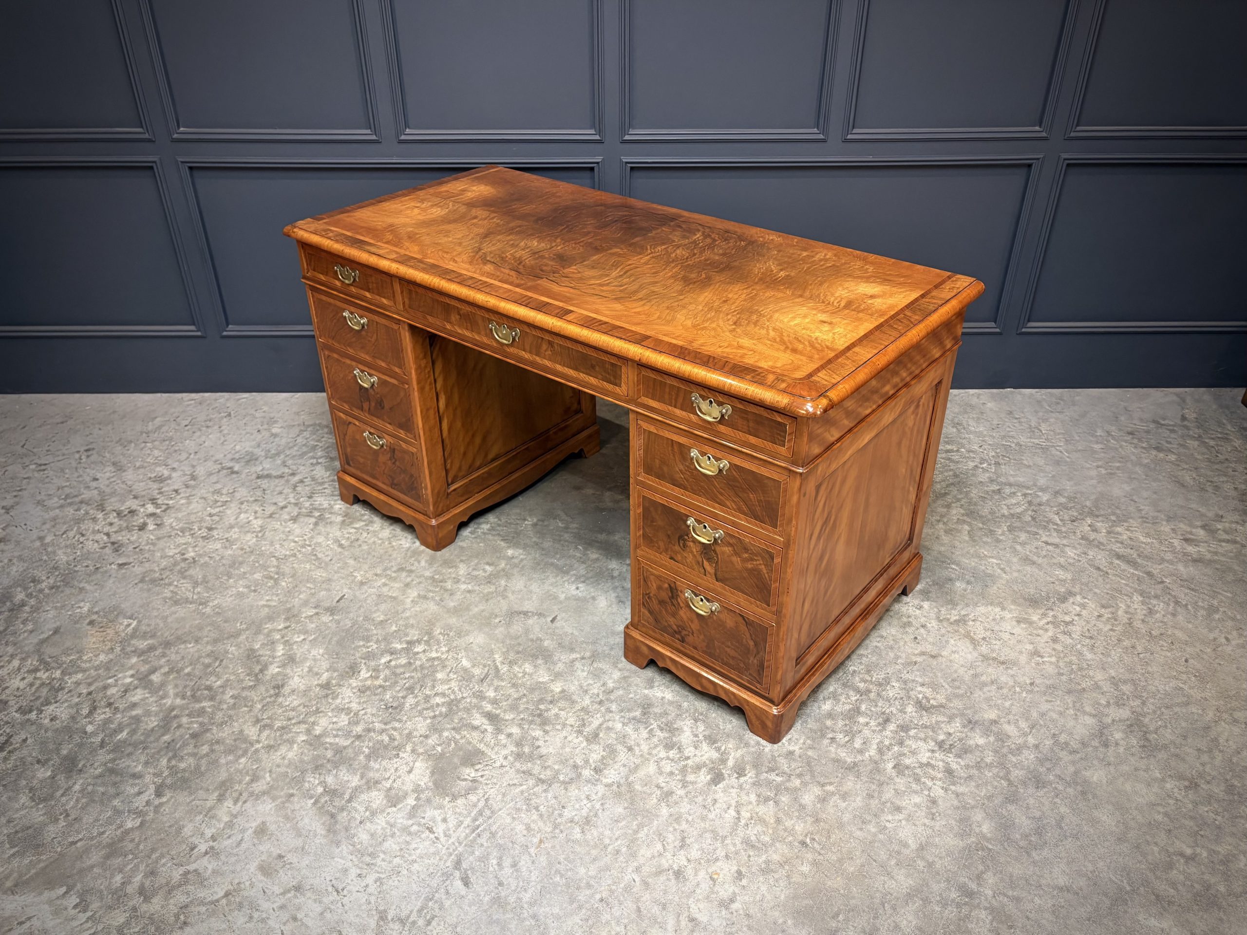 This elegant desk features nine drawers of solid oak construction with dovetail joints, all retaining their original brass handles. The drawer fronts are beautifully cross banded with kingwood and boxwood string inlaid.