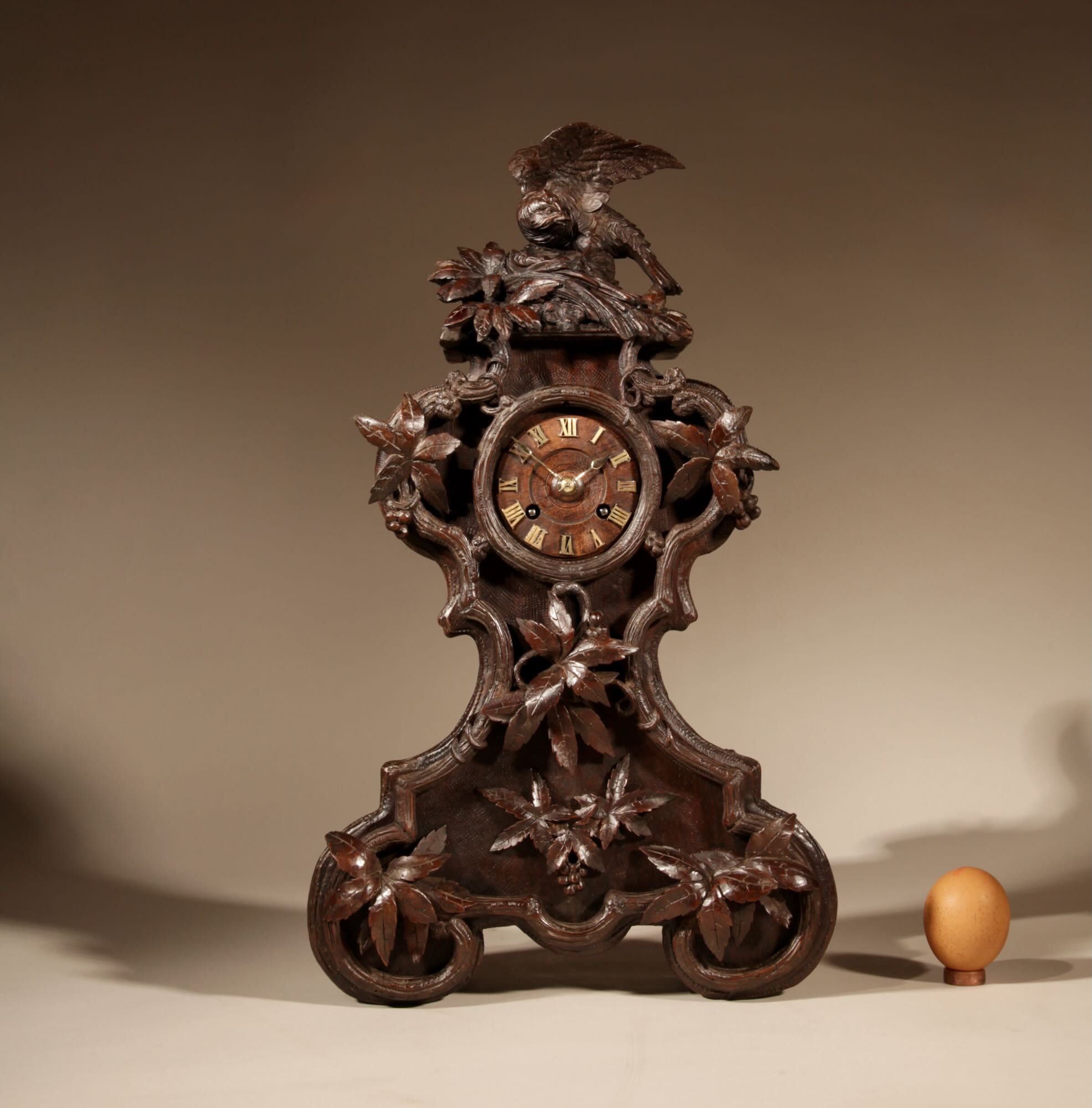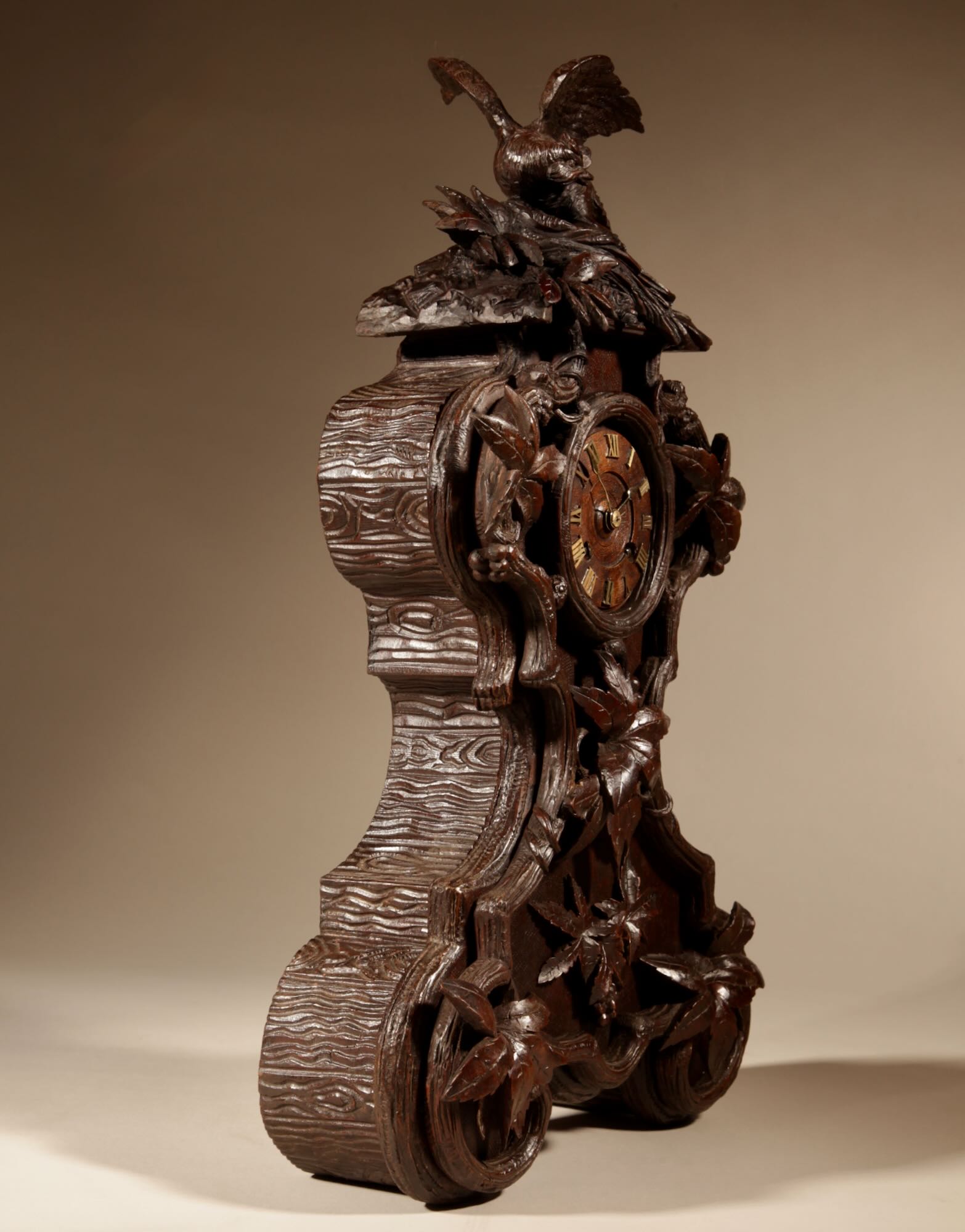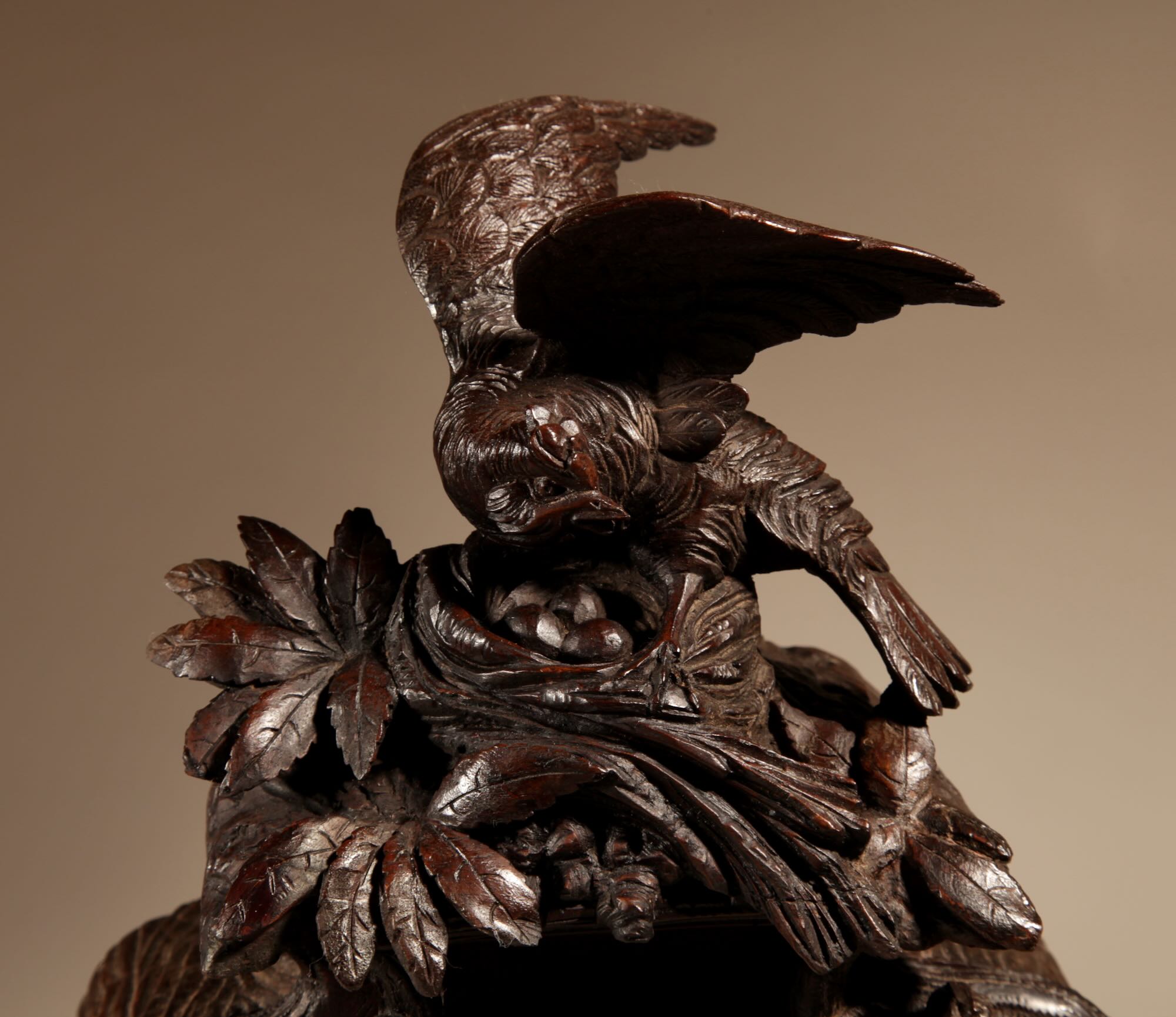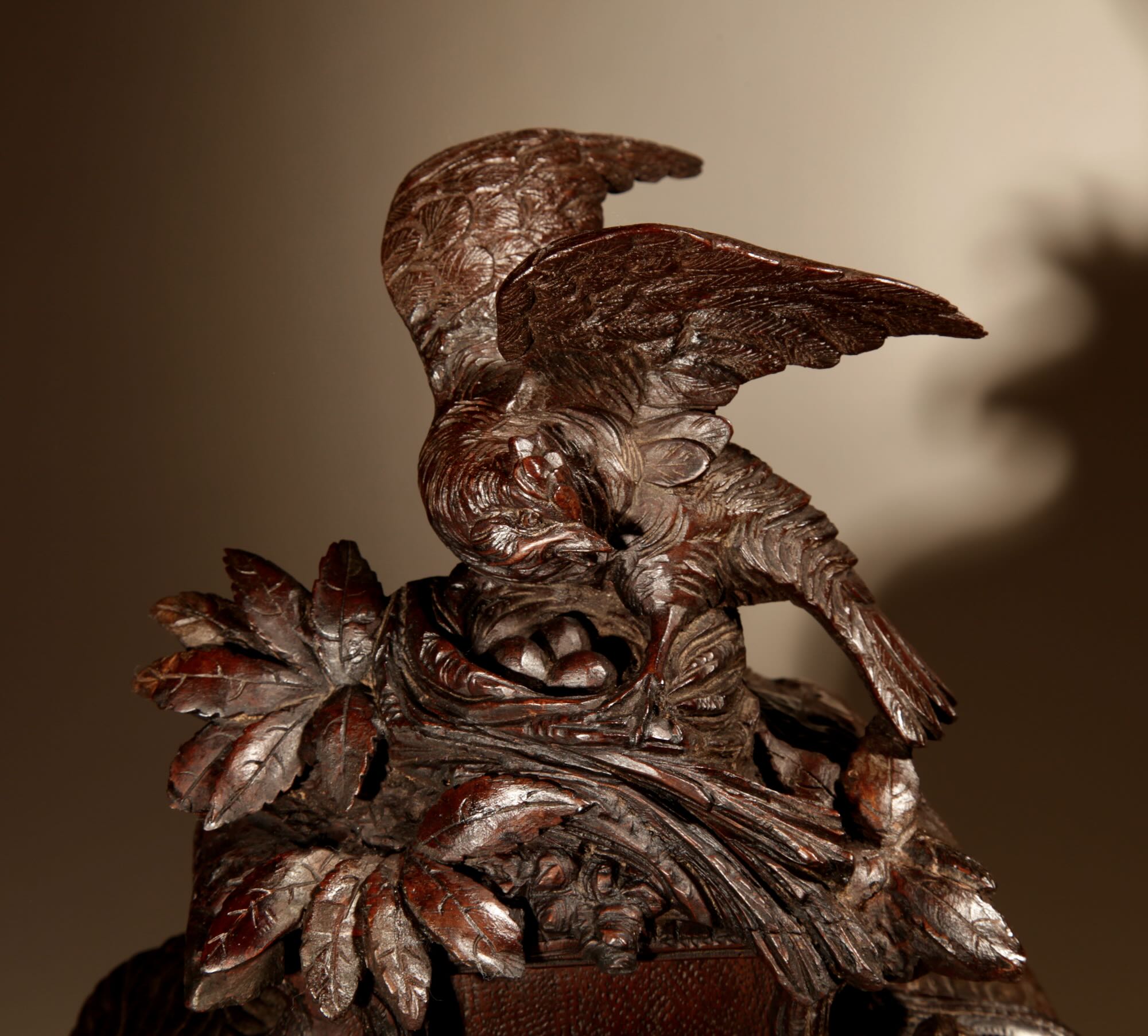 The fine carved walnut case fully decorated with flowers, leaves and berries, the top final carved with a bird beside its nest with 3 eggs.