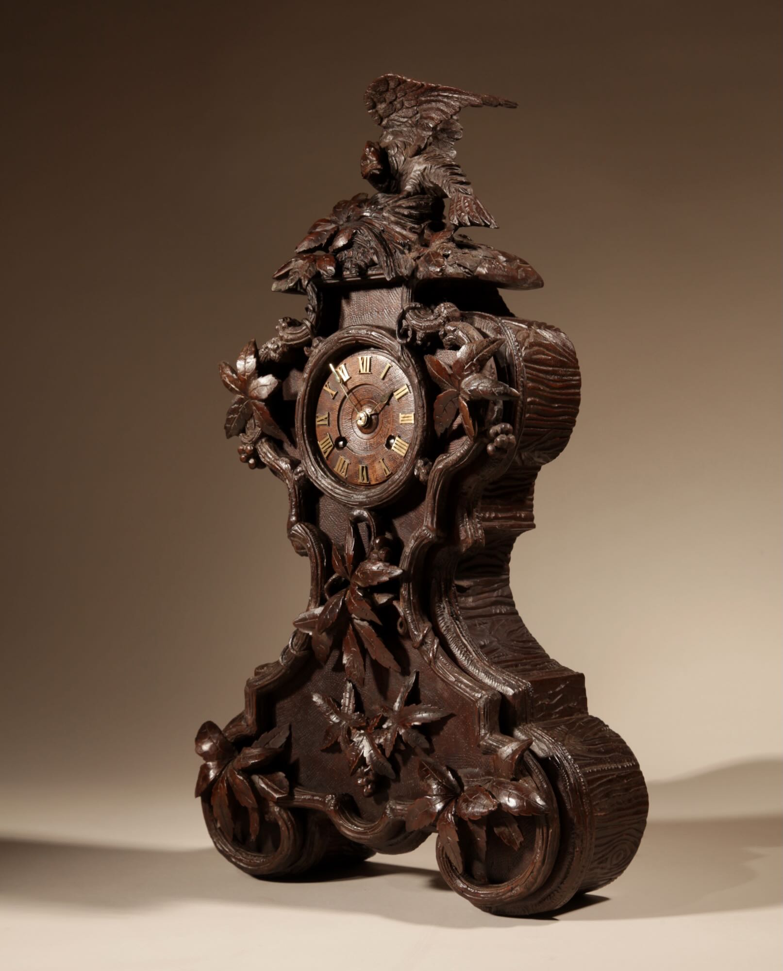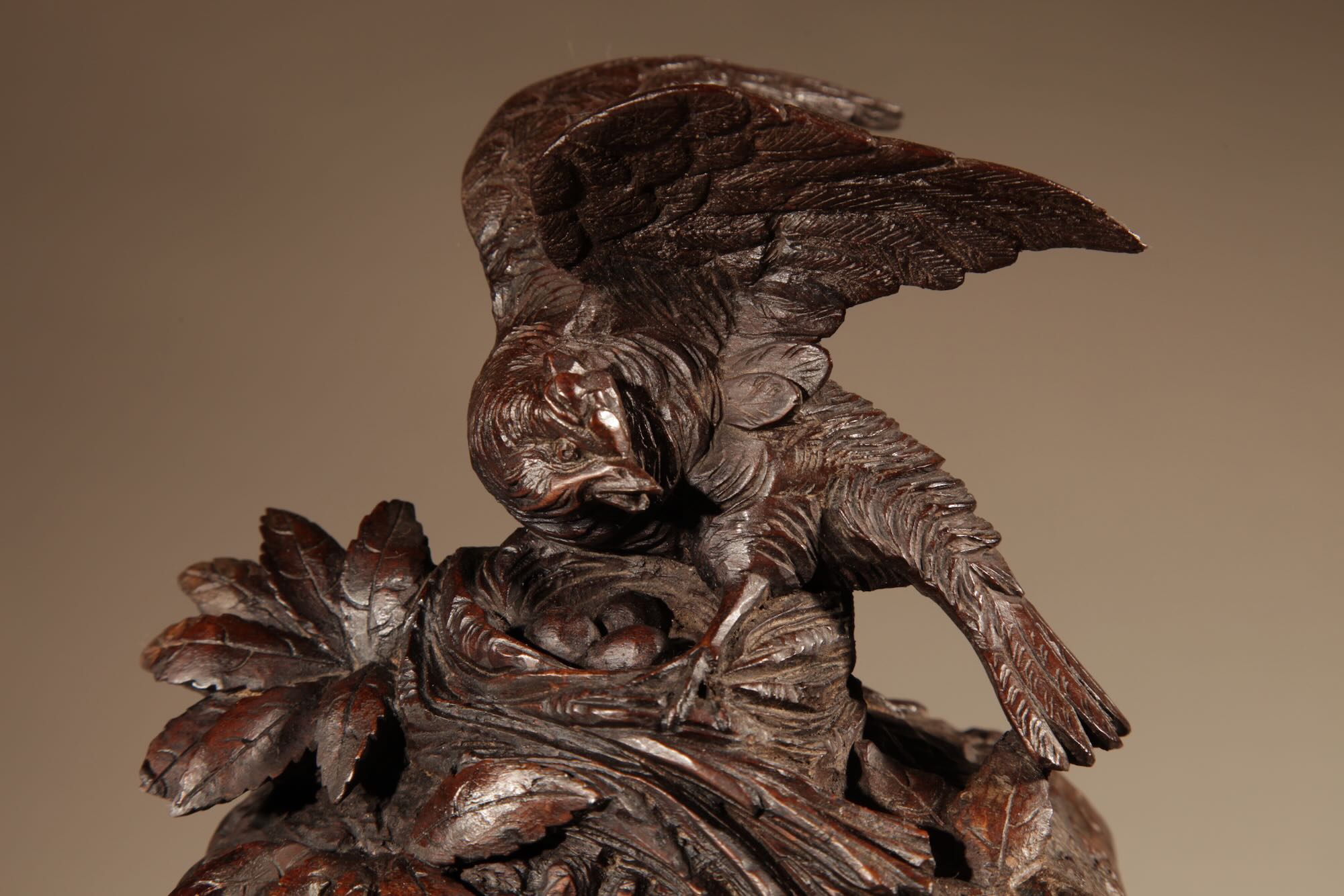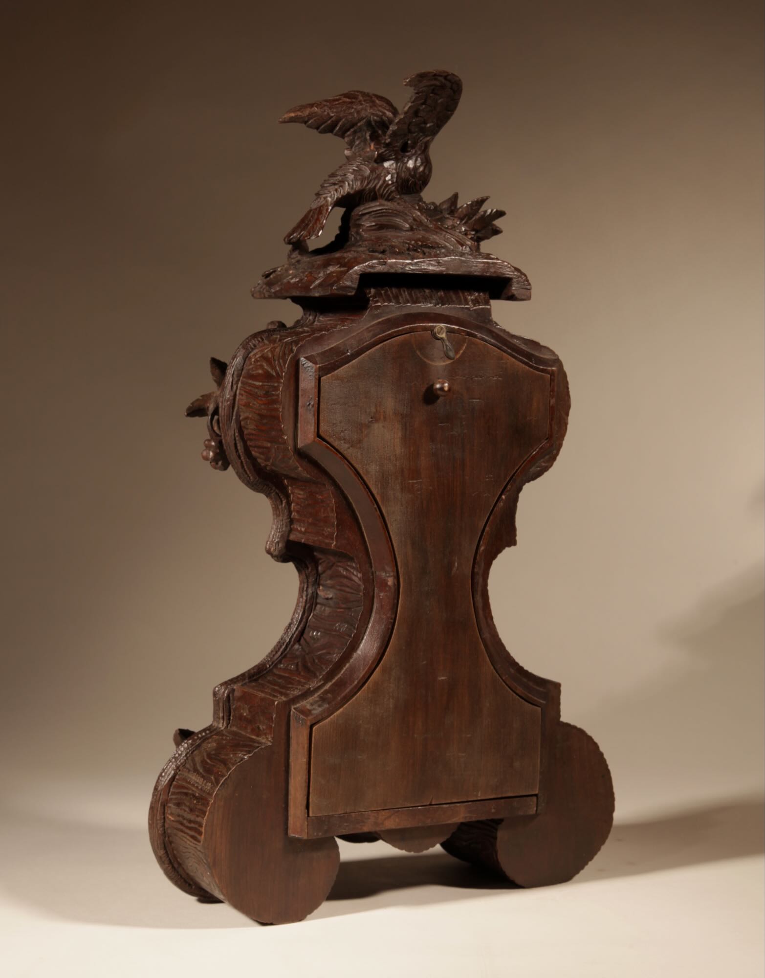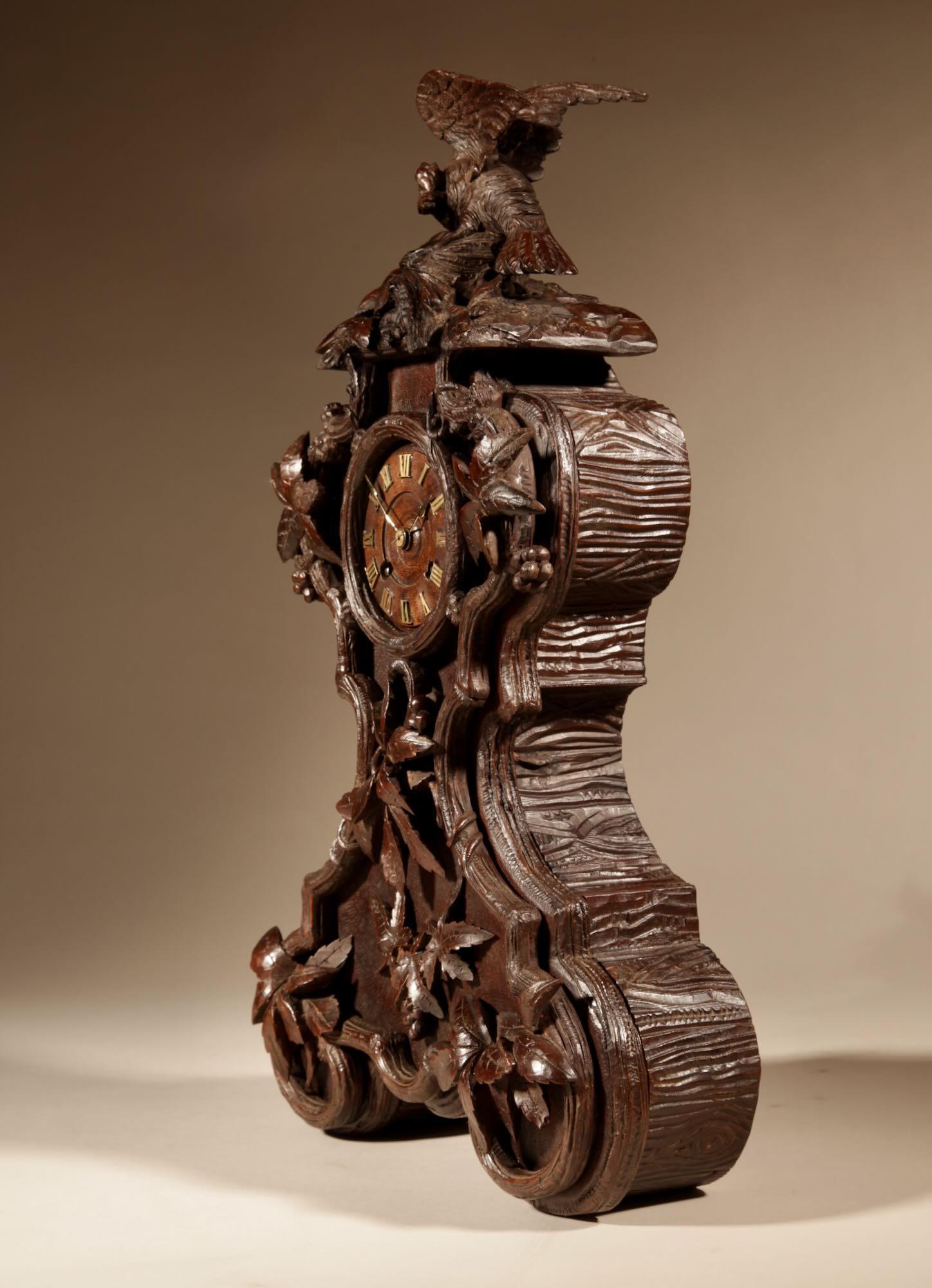 The fine carved walnut case fully decorated with flowers, leaves and berries, the top final carved with a bird beside its nest with 3 eggs.