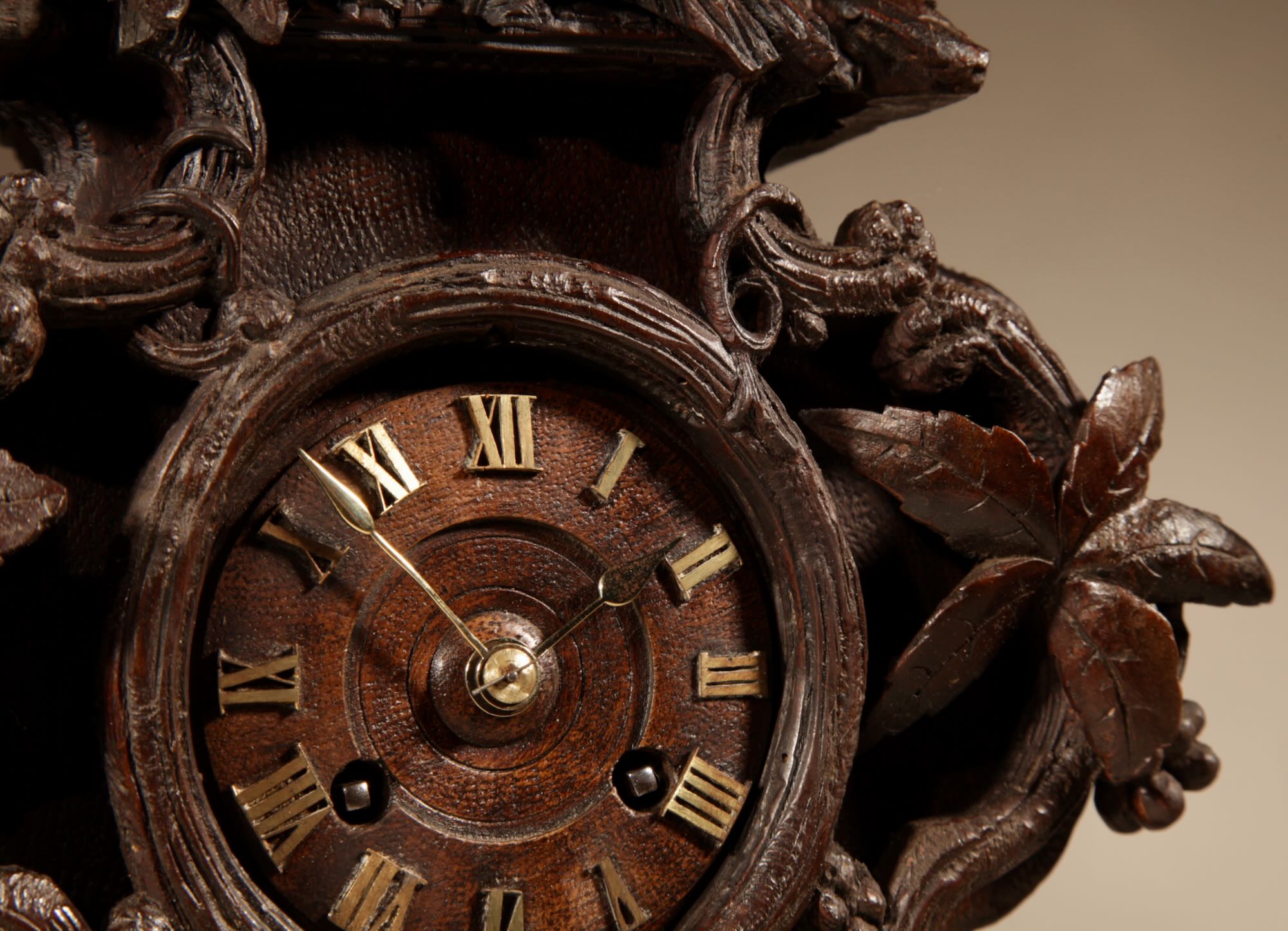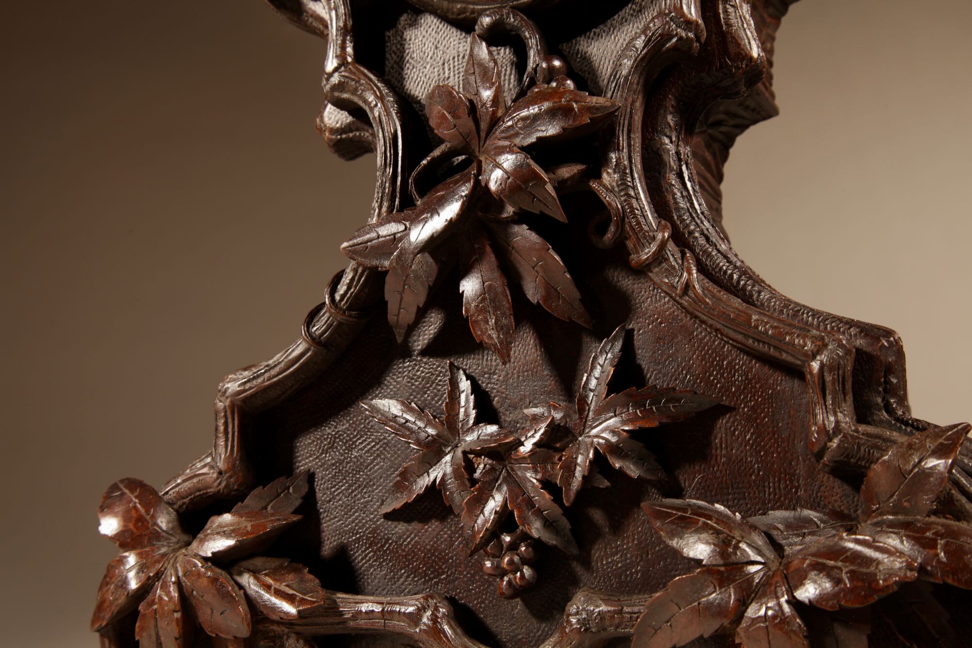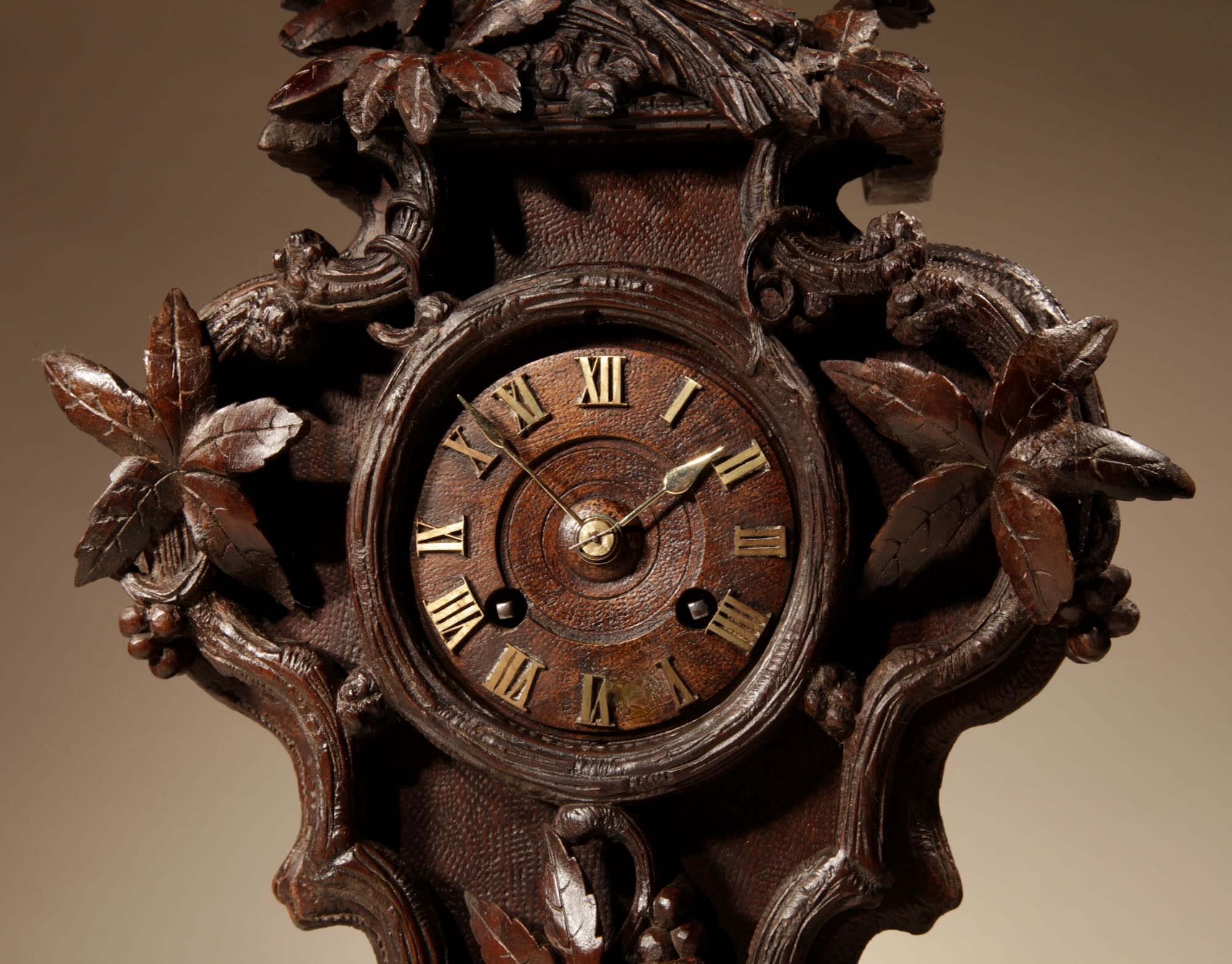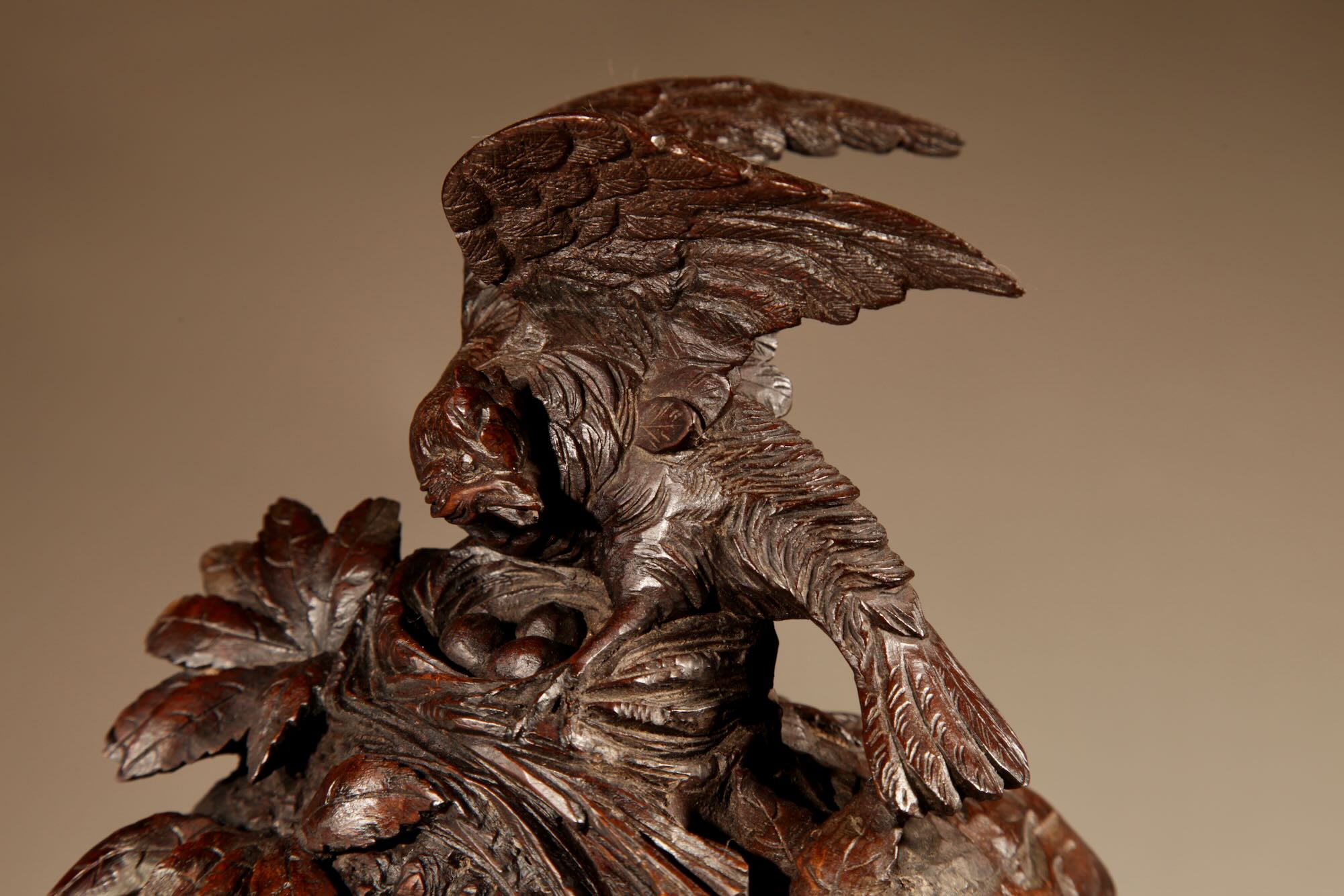 The fine carved walnut case fully decorated with flowers, leaves and berries, the top final carved with a bird beside its nest with 3 eggs.