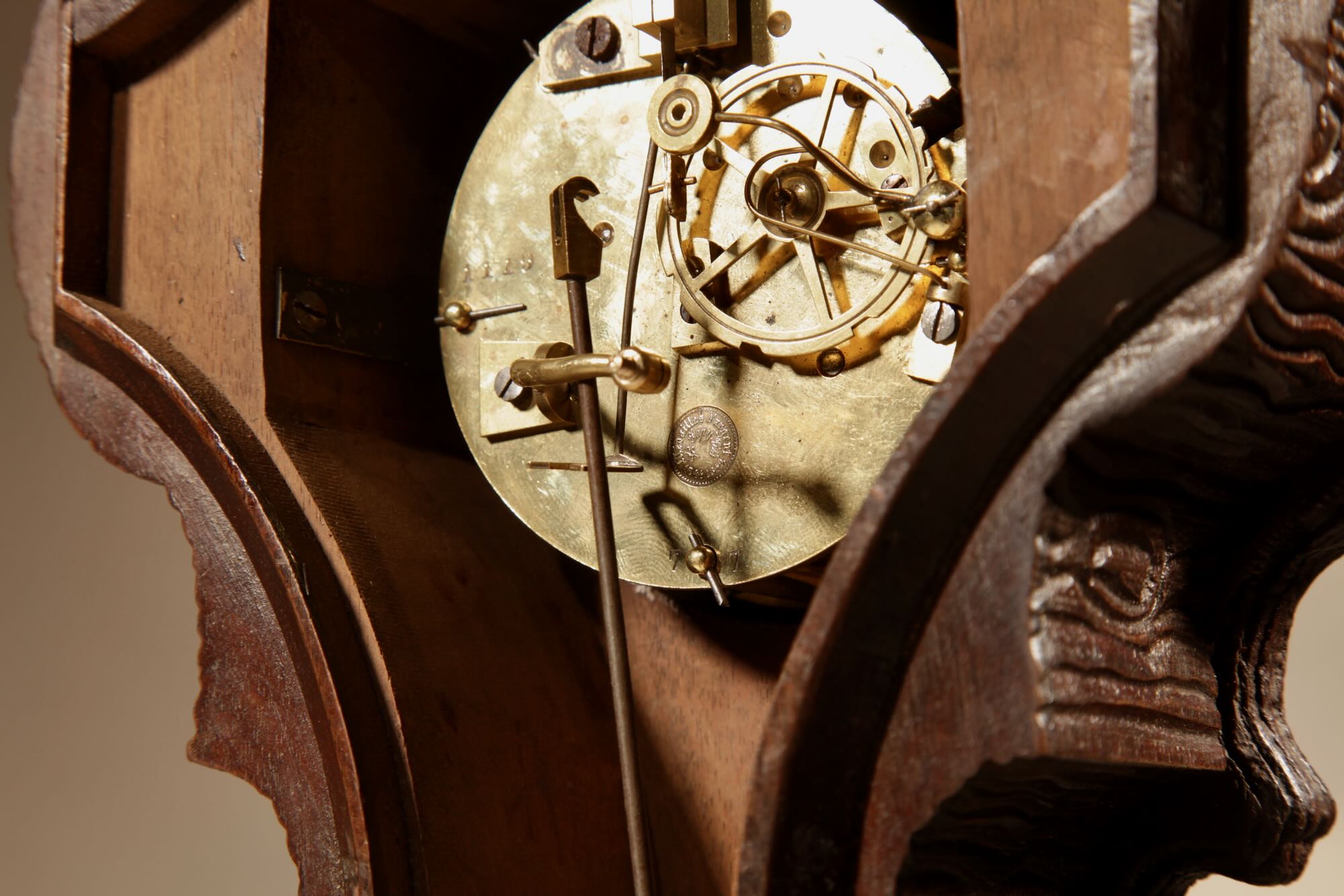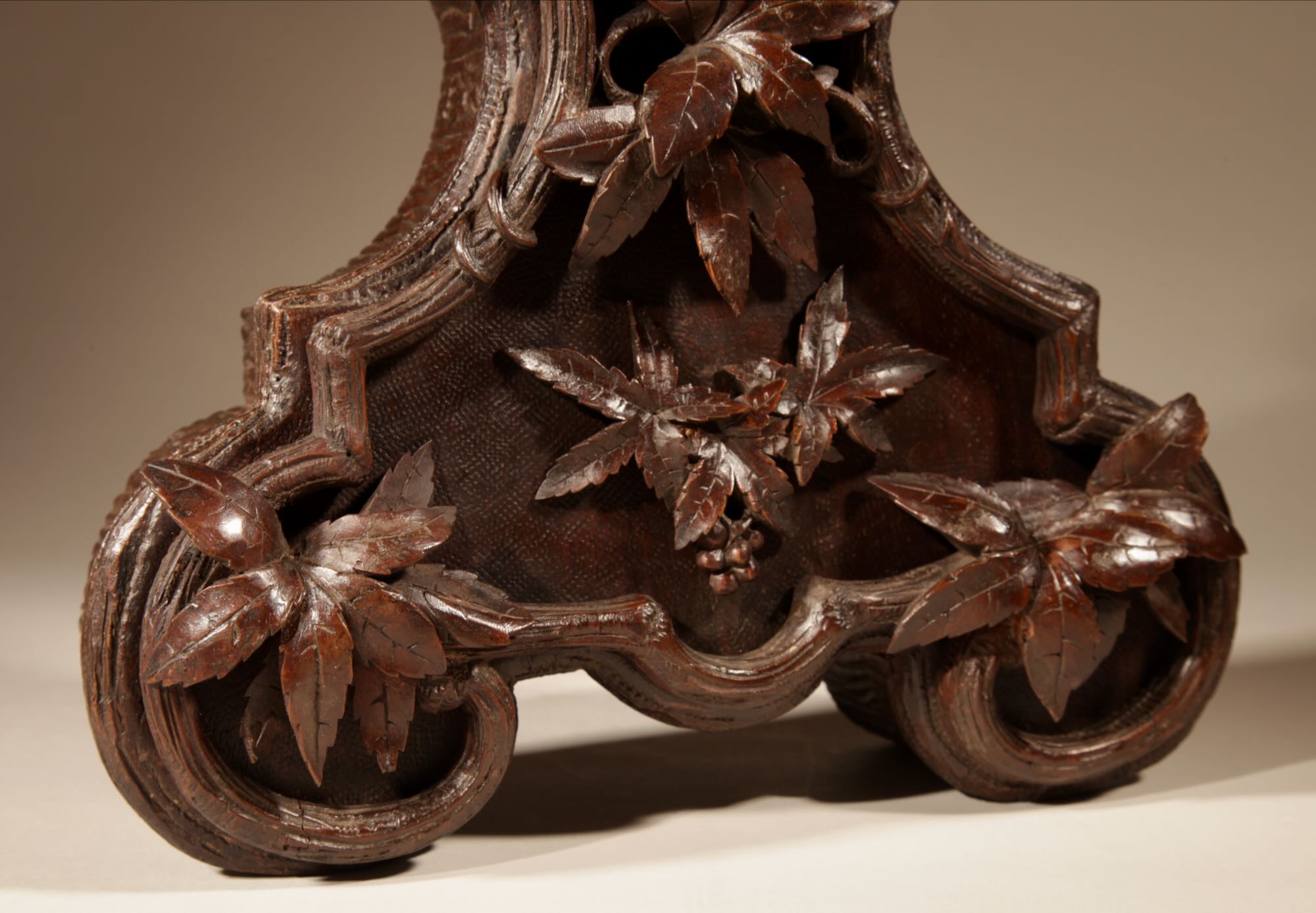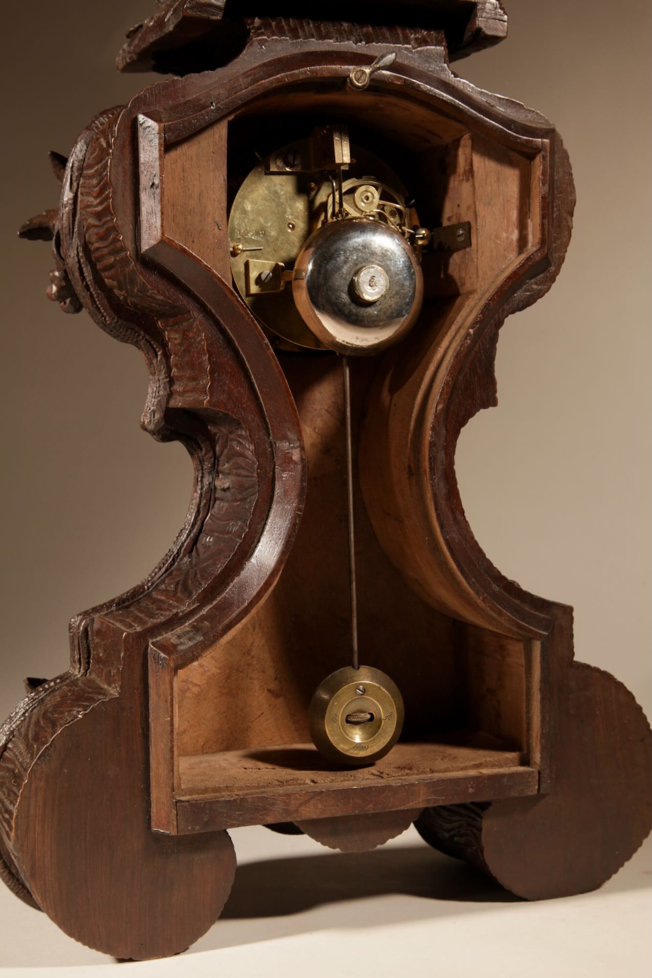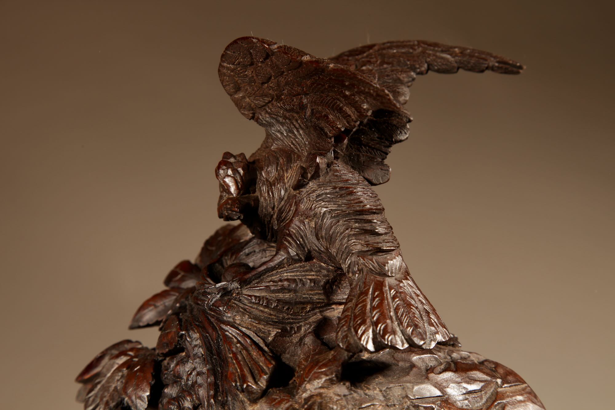 The fine carved walnut case fully decorated with flowers, leaves and berries, the top final carved with a bird beside its nest with 3 eggs.